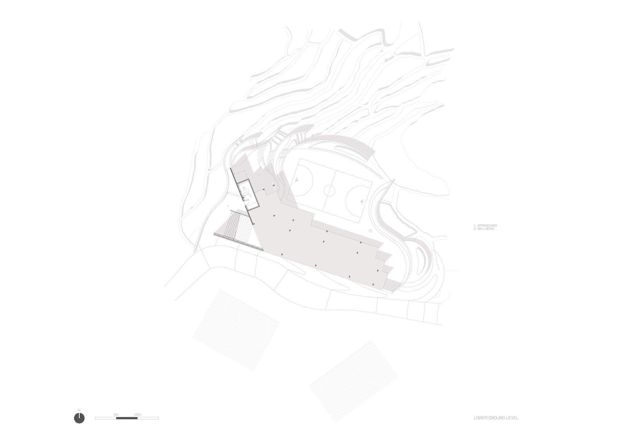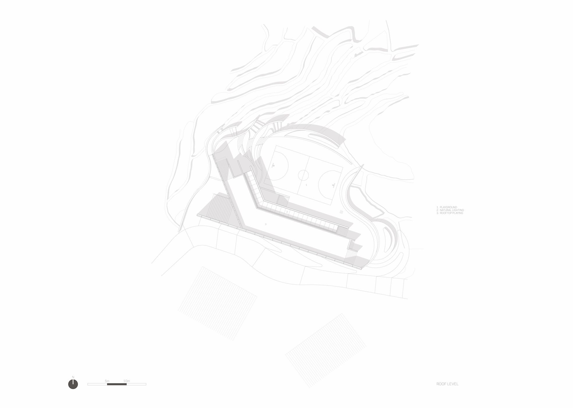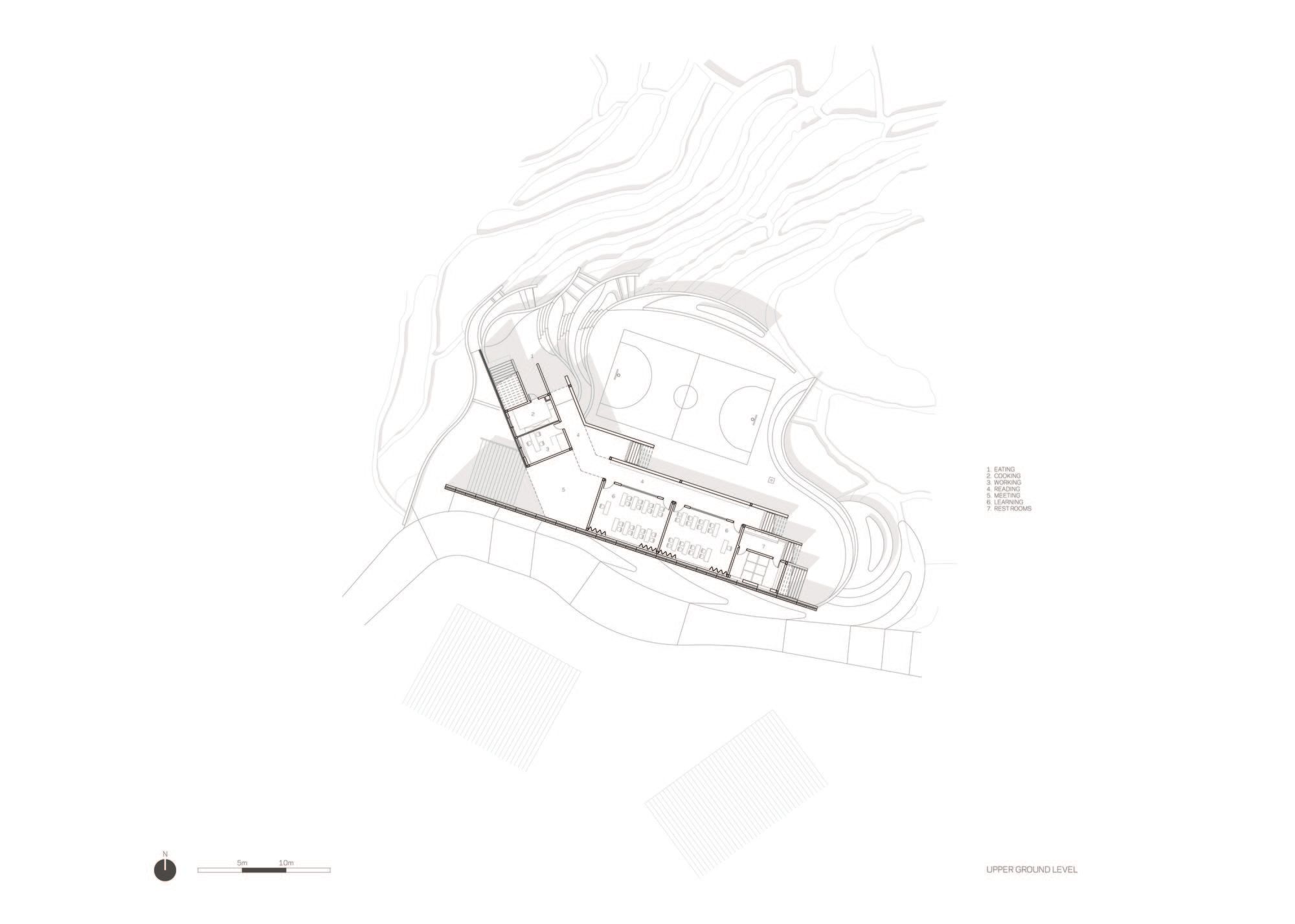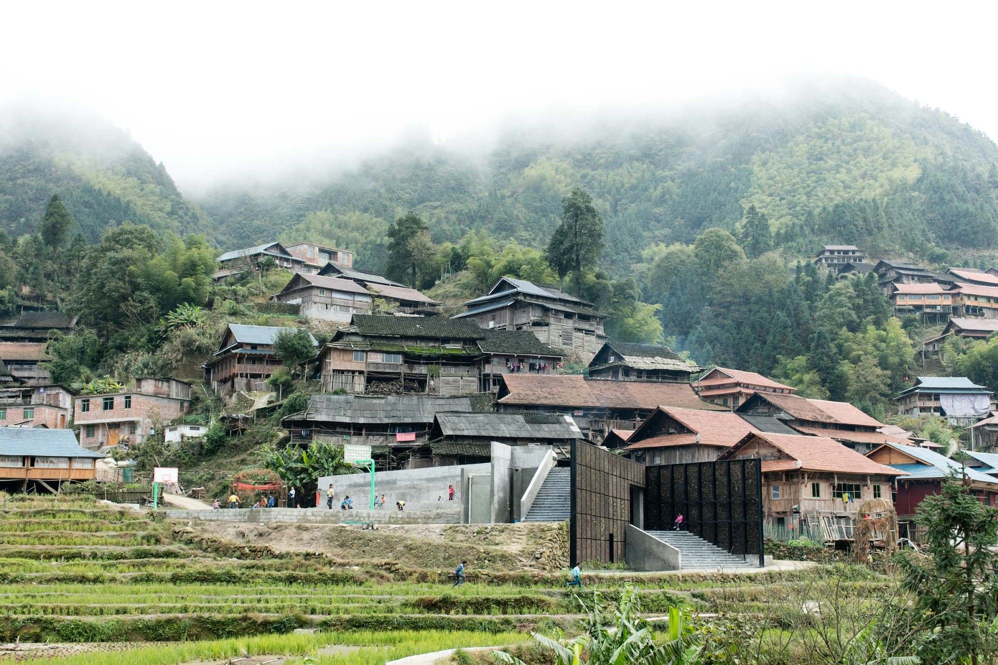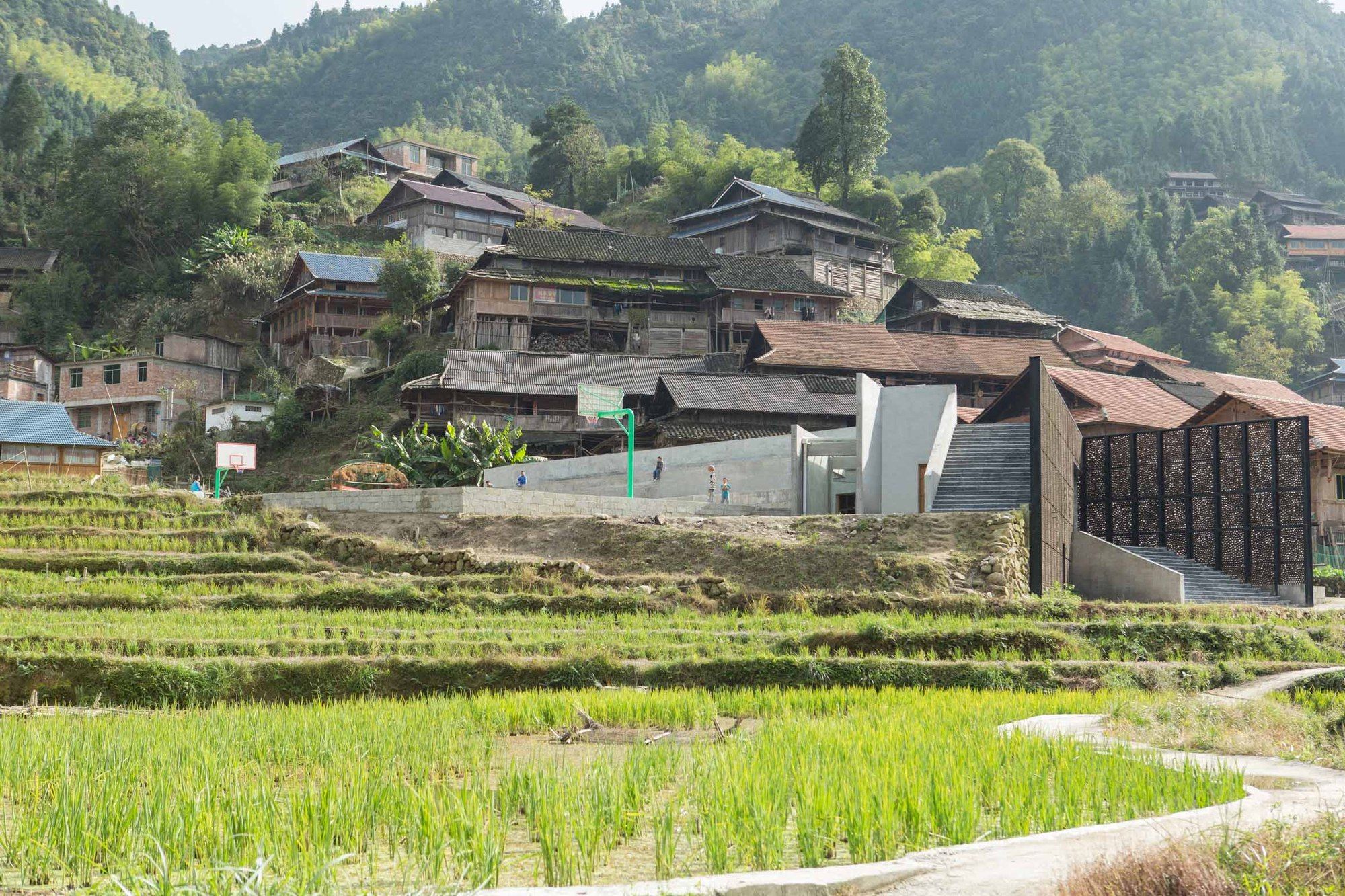 The main level of the building includes two classrooms, each for 30 students, a library, a staff room, a kitchen, and a storage space. An outdoor playground area with a basketball court is located on the second level whereas the roof of the building is accessible for the children to play and for villagers to rest and enjoy the spectacular panoramic landscape. Besides functioning as a primary school, the center also serves as a cultural space for events, festivals and various celebrations of the Yaos.