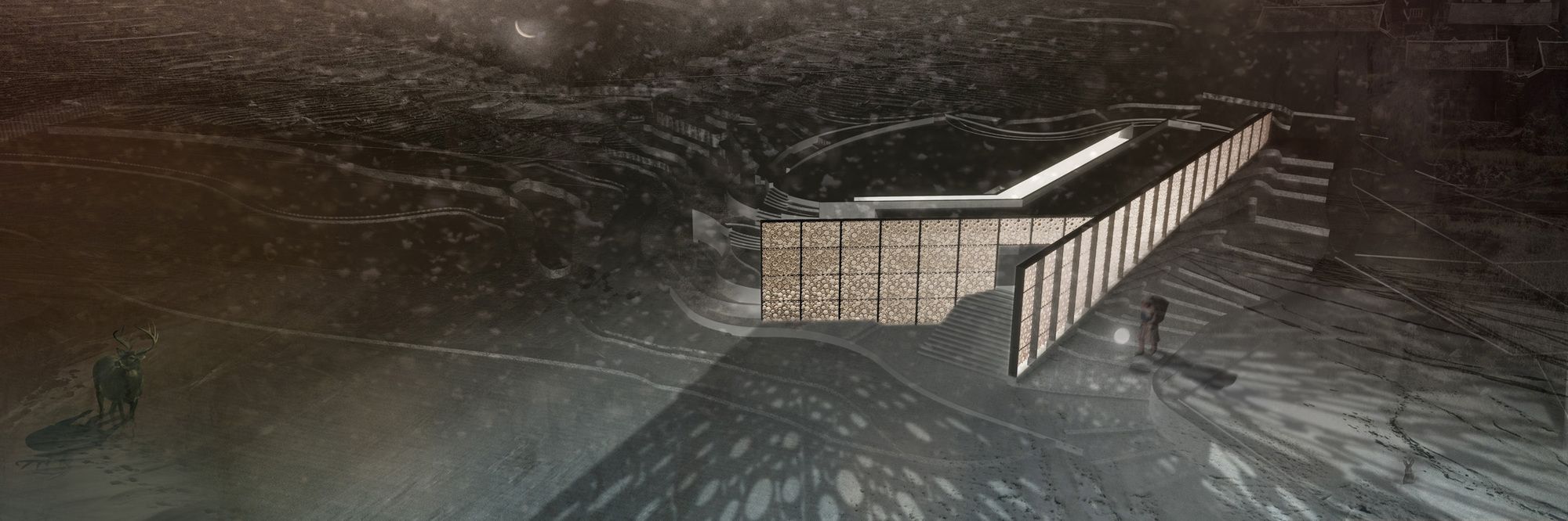 The design concept is structured around the use of layers of walls in addressing the challenges originated from the steep topography of the site. A long bamboo façade along the southern site boundary not only acts as a protective barrier from the road outside, it also regulates the transmission of noise and daylight whilst ensuring the privacy of occupants at the same time. The intelligent use of different diameters and lengths of bamboo tubes responds adequately to the different light requirements of the rooms for their respective functions.