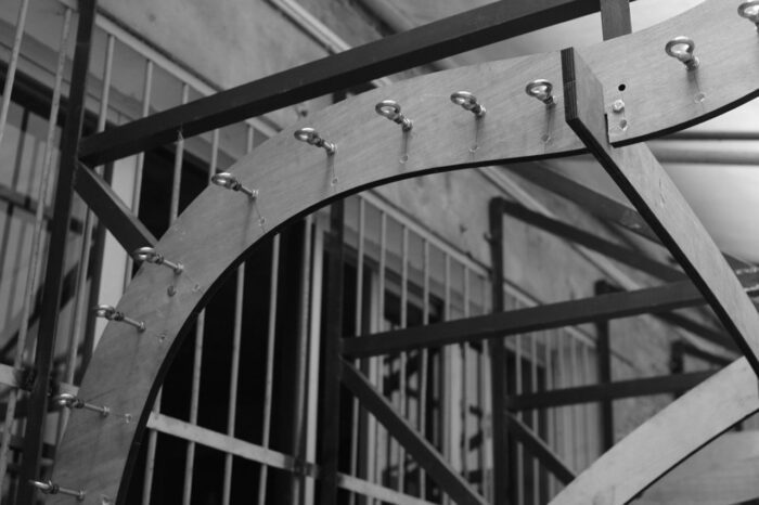 The joint is made from using off-the-shelf parts like cable clamps and bolts and custom fabricated parts like 9mm MDF spacer and a 0.4m stainless steel plate with 3 slots. The slots cut out from the plywood panels align perpendicularly to the slot on the stainless steel plate. When combined with the flexibility of the panel itself, they provide a joint that is flexible and manipulatable in 3 axes.
