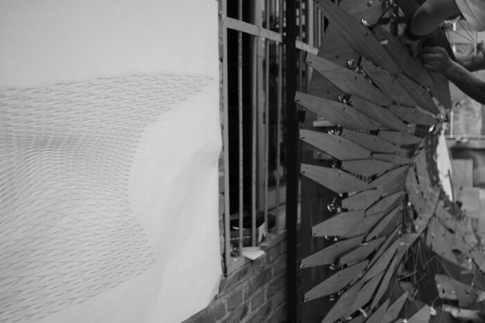 A 40x40mm L-section steel frame is anchored to the wall, then a grid of laser-cut plywood sections is secured to the steel frame, to where the steel cable mesh attached. At last the overall field of hexagonal panels are fixed to the cable mesh via the customized joints. Given the flexibility from the joints, all hexagonal panels adjust themselves into final position by gravity.
