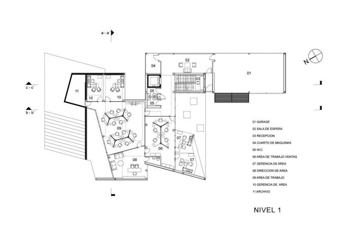 The operation space is contained within the envelope and flows throughout the building in a three dimensional open plan that honors the hierarchical organization of the company. In order to solve the continuity of the circulation the mass of the building was divided in various transversal slices, each presenting an intentionally different profile and two of them defining the geometry of the north and south elevations. The sequential juncture of all the slices creates deviations and convergences between the internal operational route and the external costumer route.