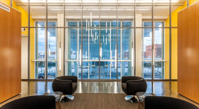 Transfer platforms are fully covered by smaller scale canopies that protect customers from the elements. Additionally, these canopies incorporate skylight that use Photovoltaic glass that allow daylight to illuminate the areas under the canopy and generate electricity for the facility. The two-story building creates a strong contextural streetscape that ties this development and future developments on adjacent sites in the historic Court Avenue area located to the east of this location.