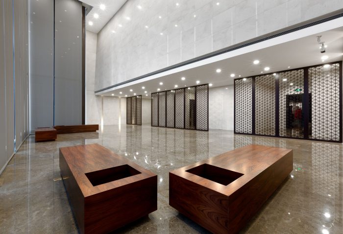 The three-dimensional surface of the architecture was covered by lap granite slabs, with the same stone material spreading to the circular pool wall as well. Tablets having a subtle color difference changed randomly from bottom to the top, and the effect of fluctuation of anchoring strengthened the construction site and the spirit of the whole local environment.