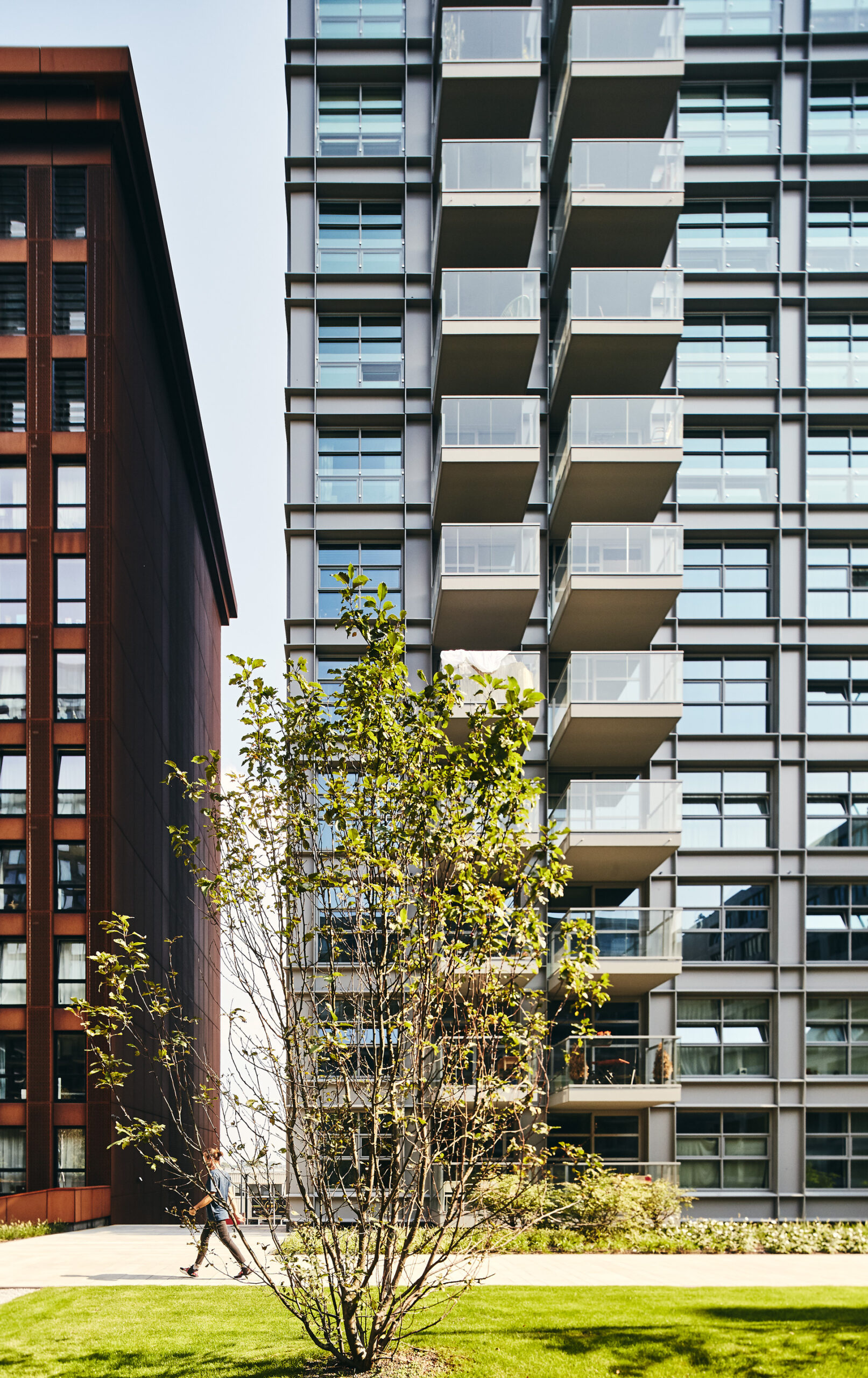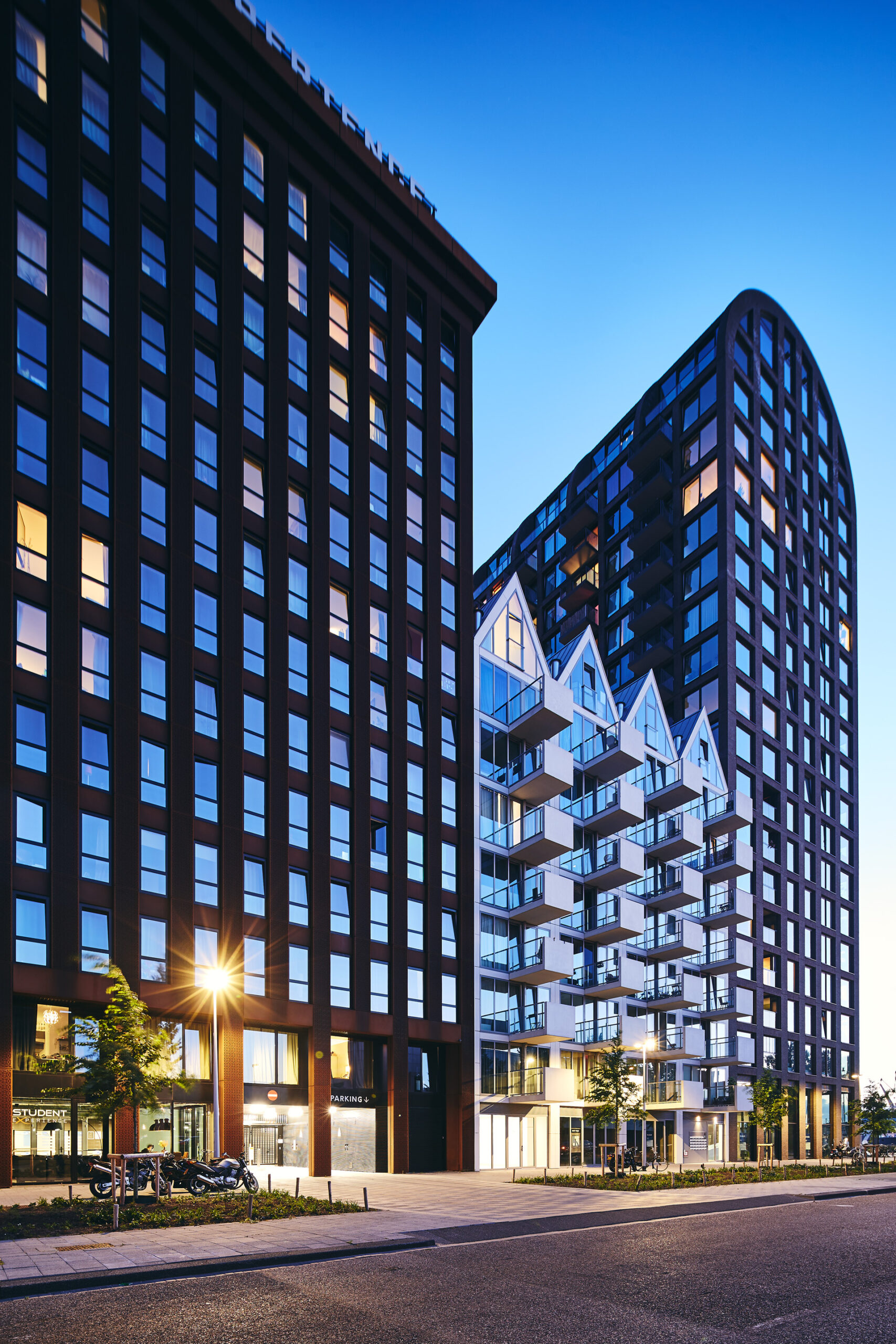 Four years later, the Student Experience decided to start building. The desire for high-density development, as stipulated in the zoning plan, has been freely translated in the design into varying building heights ranging from 22 to 60 meters. Within the block, the seven buildings have their own height, entrance, program, and typology. The breakdown of the large block into different volumes, reduces the scale and enhances differentiation between buildings. The scale of the block dissolves in the different perspectives at street level. The architecture is sturdy and simple, with the building components extending to the street. Large buildings are interspersed with small intermediate masses. The materials vary from concrete, steel, corten steel to different colored masonry, which conjures up associations with the Port and New York.