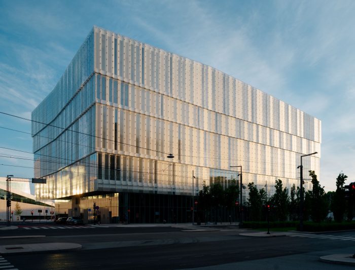 The facade combines high insulation value and even distribution of daylight. Narrow insulated panels alternate with narrow glass panels. The diffused glass of the interior eases the impression of the closed panels, creating a soft and even interior light. The facades are relatively closed in order to strengthen the impression of the light shafts and the library’s inner life and activities. In the corners of the building panoramic windows open views in different directions, lending variation and tension to the interior.