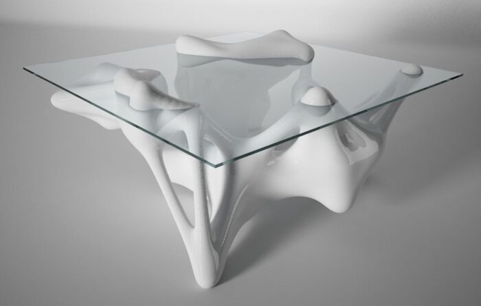 Two quasi-similar pieces of furniture, one very interesting concept. The Devonian table and Cambrian couch, designed by Amniosya, are created from the idea of the mutation of a piece’s function through the selective removal of the integral part- this being glass for the Devonian and pillows for the Cambrian. The works came out of research into the possibilities for design concerning itself with ‘metaball’ topology (n-dimensional objects).