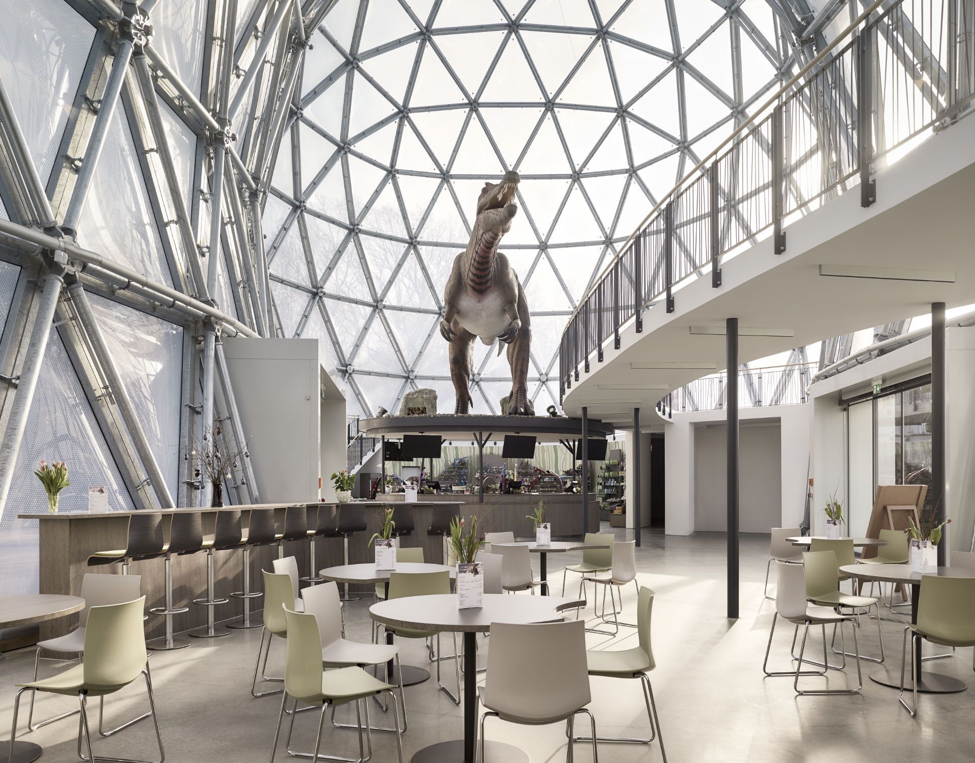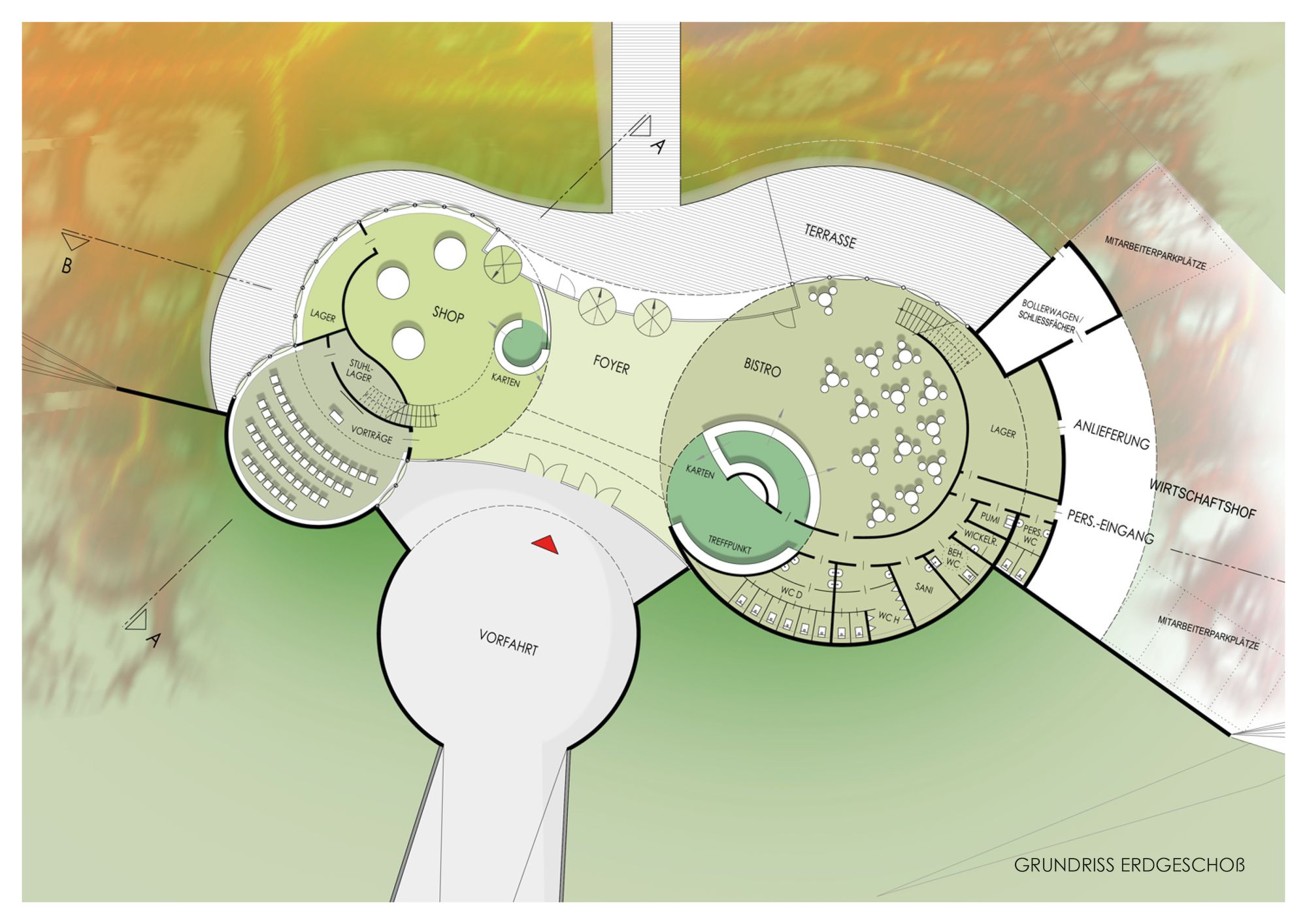 Smooth and organic shapes inside the entrance building support the route guidance and make it intuitive. Therefore, the central foyer including the connected functions ticket office, shop, bistro, and the ancillary rooms is designed as intervening space between the cells. As connector of the different functions, it is derived from the ideal design and effective capability of the nature. The entrance level including bistro, shop, and presentation room is covered with three dome constructions. These domes are light structures and symbolize the “cells“ of the mitosis.