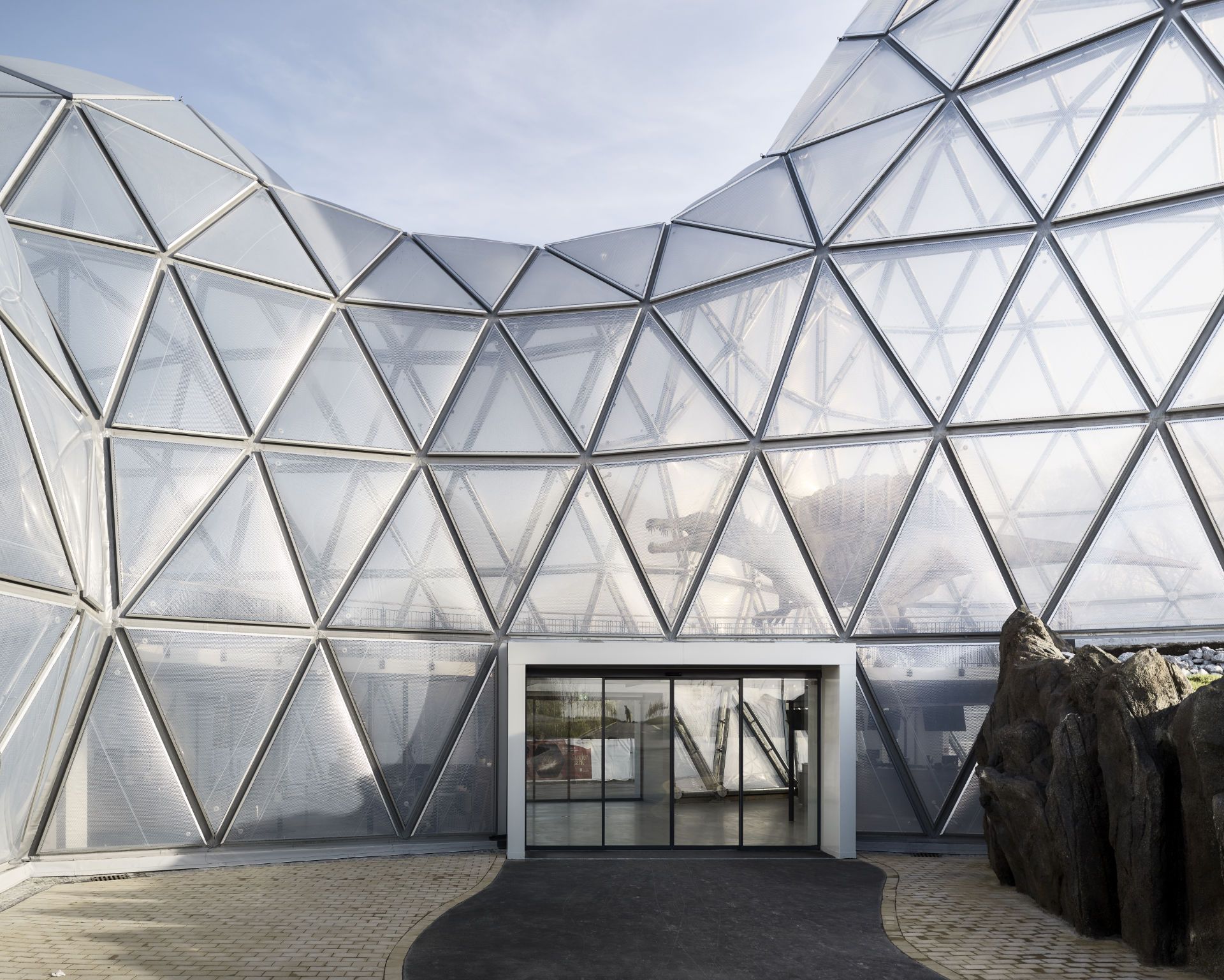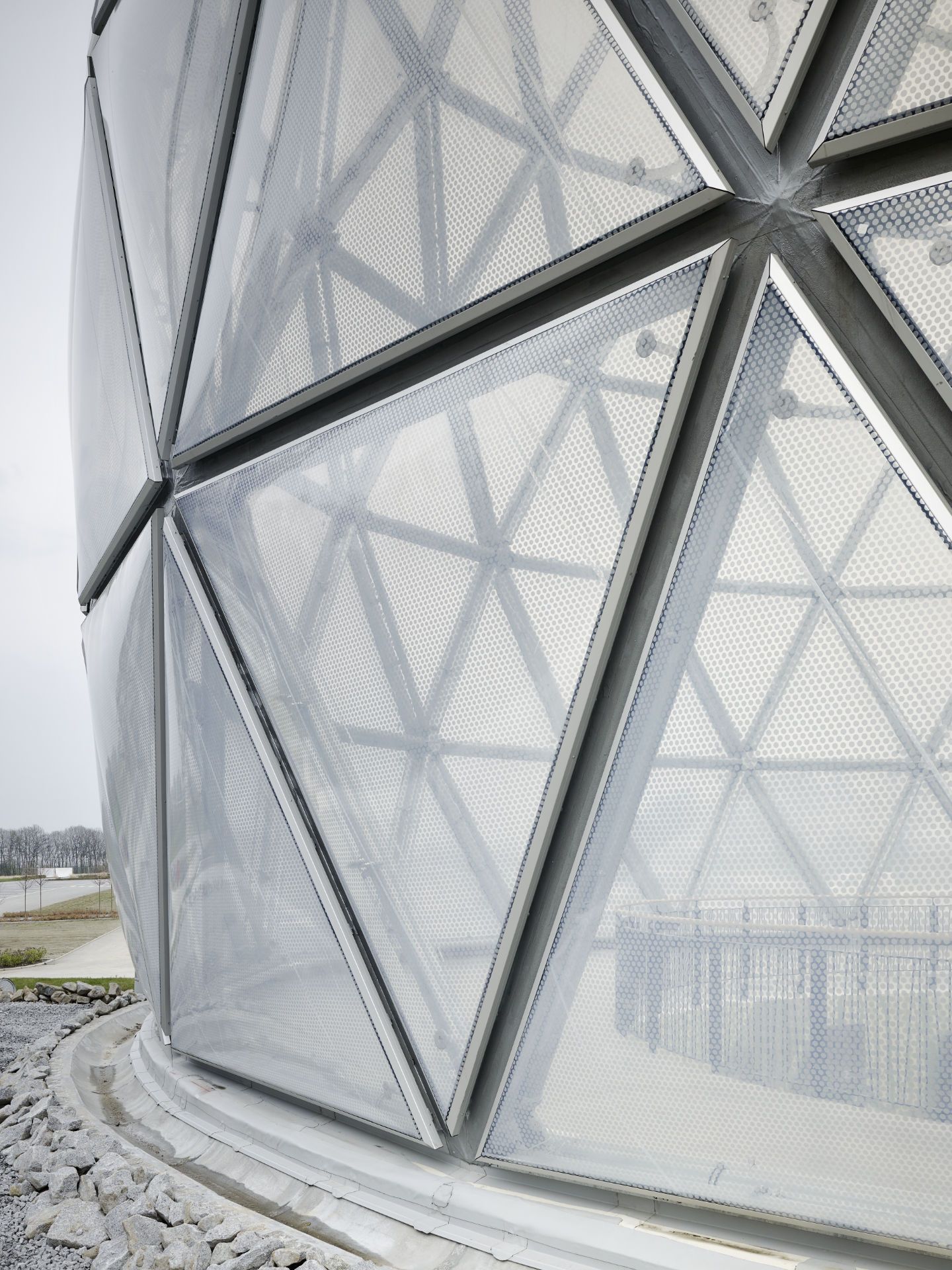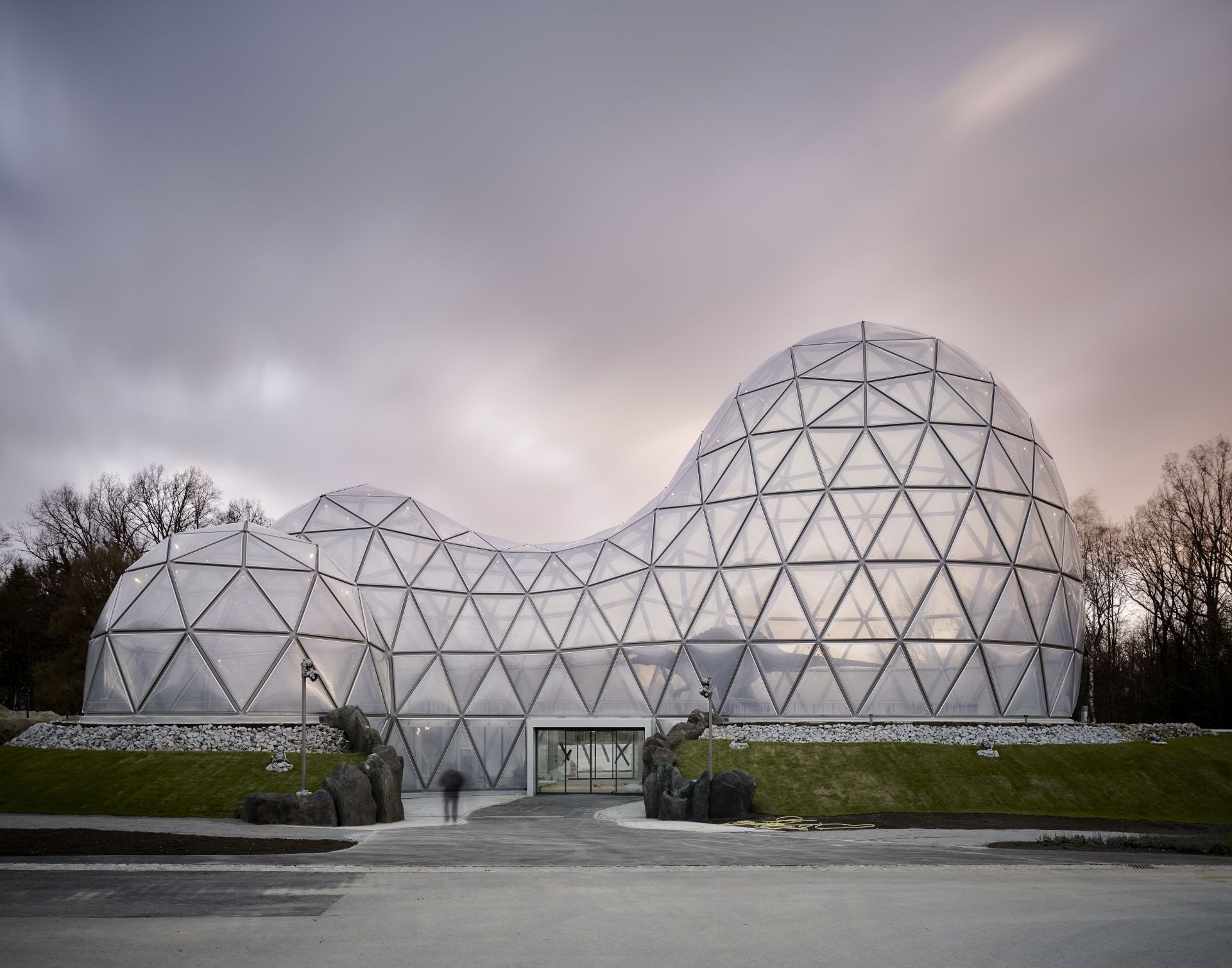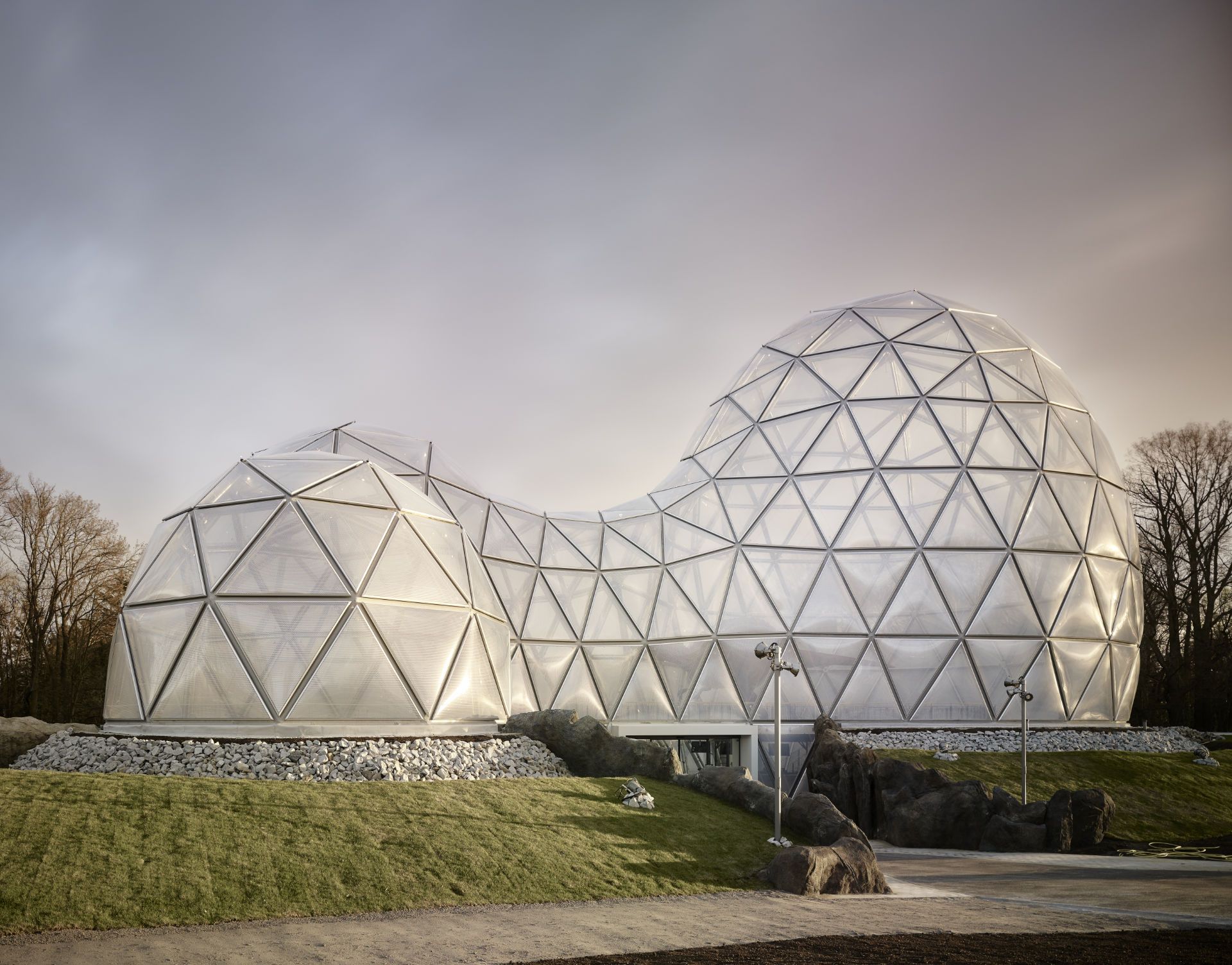 The nature creates genius, viable, and aesthetic shapes, which constitute role models for the realized dome membranes. Here, the borrowing of shapes and constructions from the nature are not plagiarisms, but necessary references to enable an intelligent, aesthetically ambitious and economical construction. The interior of the building is flooded with light through the transparent shell. While twilight and the after the connected inversion of light conditions, the cell membranes become luminous landmarks.