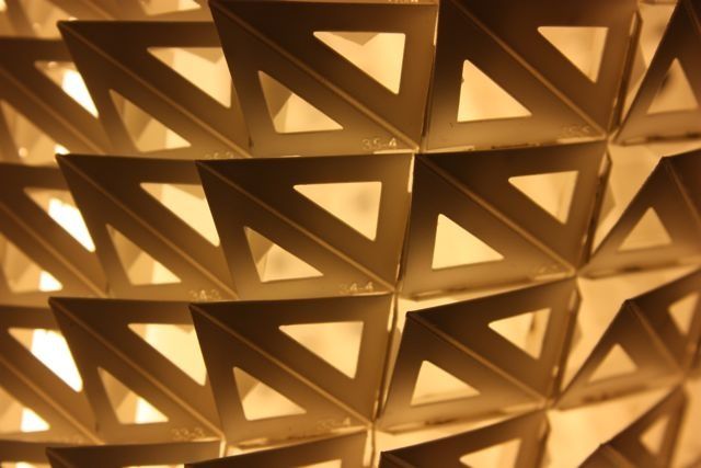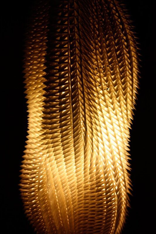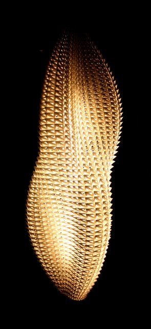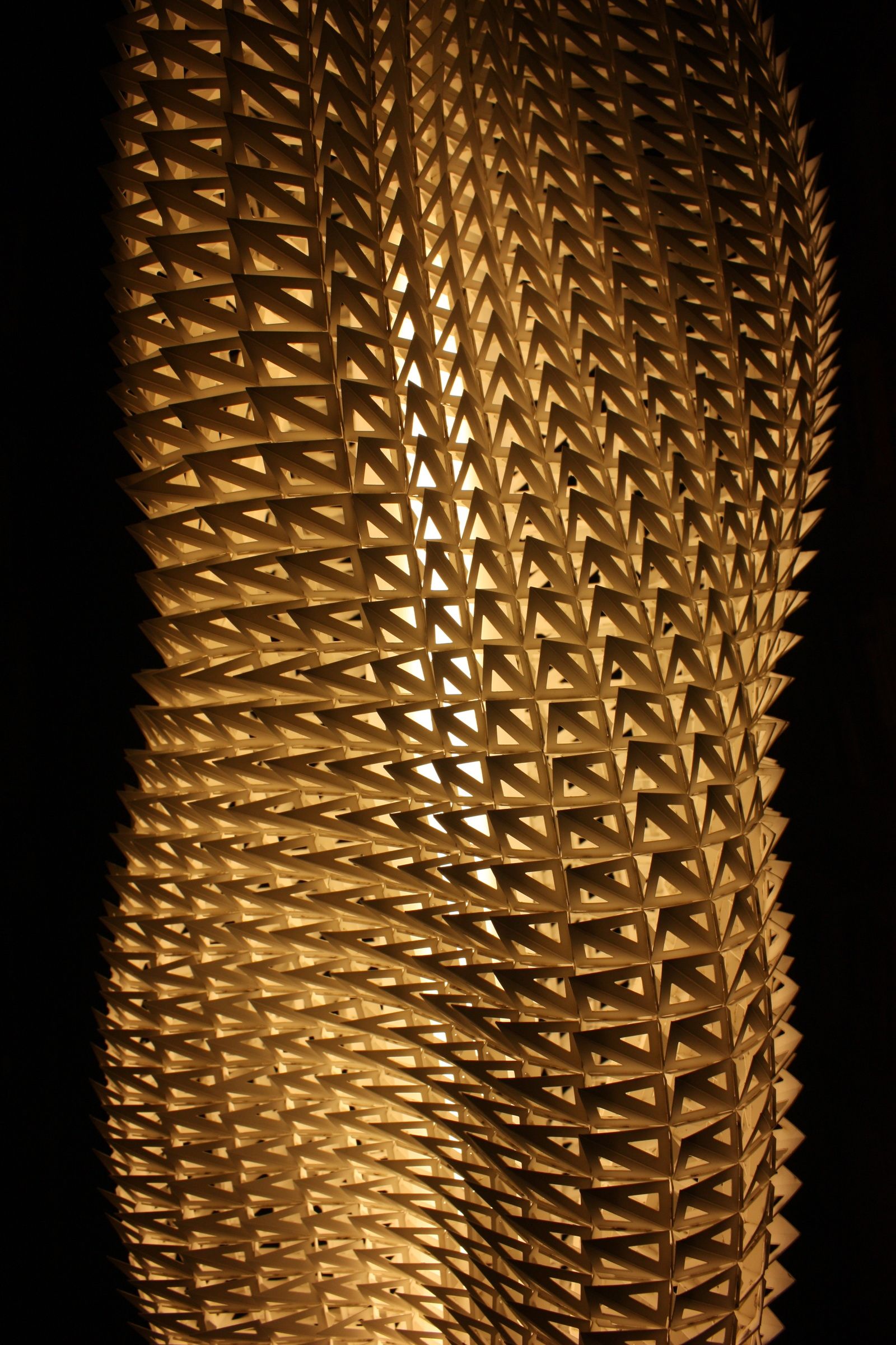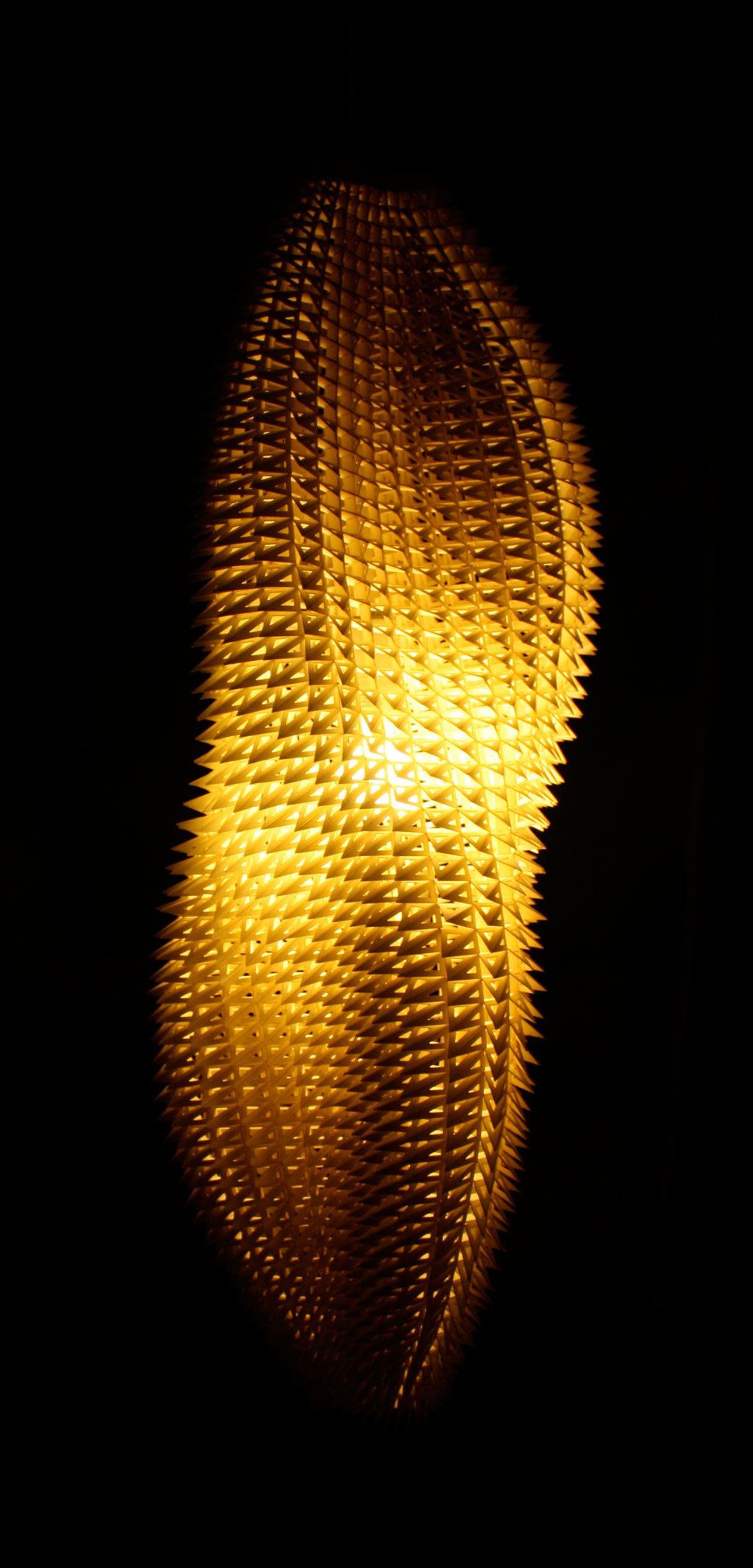 In the case of the Diploid Lamp, the computational design with the assistance of parametric modelling & programming uses diverse digital production methods that allow the optimization of the light’s geometry by triangulating the hollow triangular centres. Each single lamp is designed and assembled from digitally fabricated paper elements. Such a procedure can result in the production of an appealing fluid shape transmitting parallel its own potential “intrinsic and extrinsic forces”