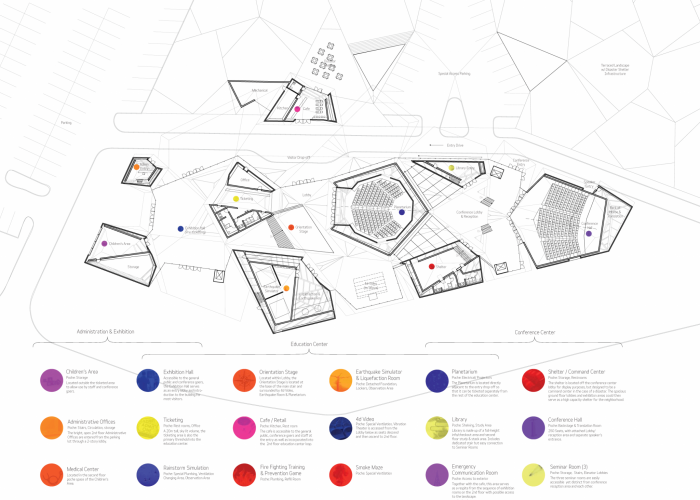 The building relies on connectivity from one “boulder” to another – the concrete and steel structure transfers load from one boulder to the next, creating a structure more stable than it would be normally required from the current building code. In the event of an actual disaster, the building can provide a safe space and even terraced and open spaces, which can host up to 1000 people.