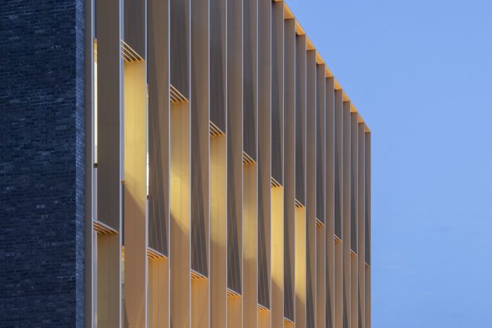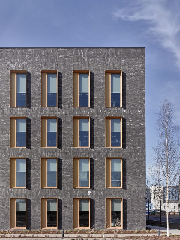 The building’s striking exterior features parametrically designed extended fins and brise soleil, giving it a distinct identity and marking a new gateway to the south west entrance into the wider campus. Expansive glazing allows views out to the surrounding countryside, while ‘putting science on show’ by making the work within visually accessible to the public. A variety of hard and soft landscaping helps to situate the building within the campus, and outdoor amenity spaces with integral cycle storage are provided for employees. The campus’ natural biodiversity is enhanced through indigenous planting, bird boxes, and landscape rainwater management using bioswales.