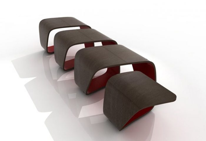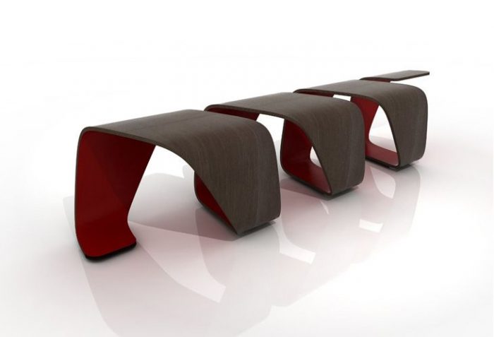 A modular bench meant for public spaces, it is composed of a continuous band of plywood which twists around to create 3.5 seats. The last, cantilevered seat at the end, appears to be a sit-at-your-own-risk seating arrangement.