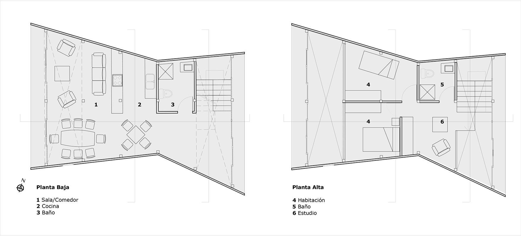 110m2 contain a very simple plan, with two levels of open areas that connect through double-height ceilings. The living room, dining room, kitchen, and a complete bathroom are distributed on the ground floor. Two bedrooms facing a double-height ceiling oriented to the ocean occupy the second floor. In the rear façade, another double-height window opens up to the back with the staircase.