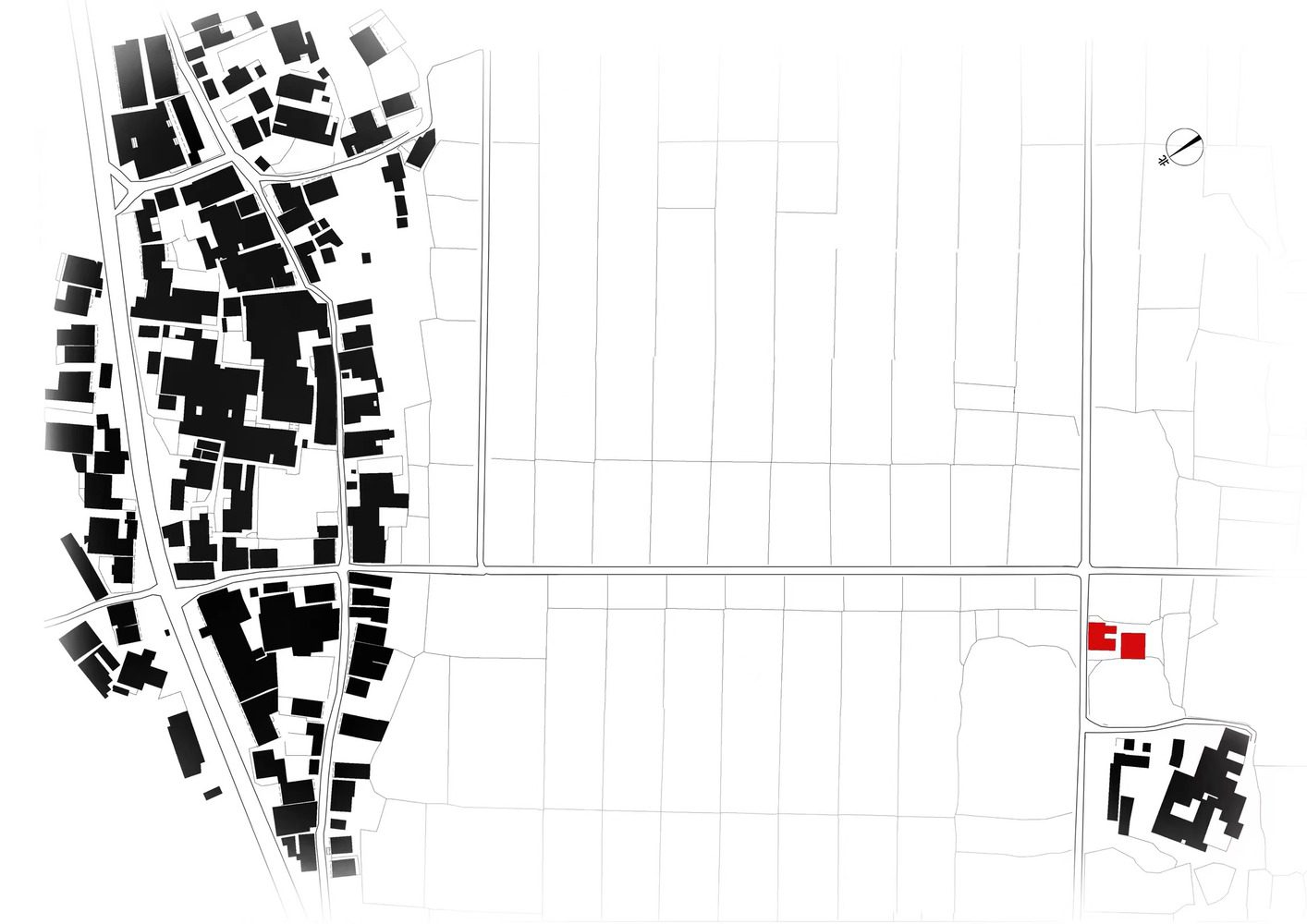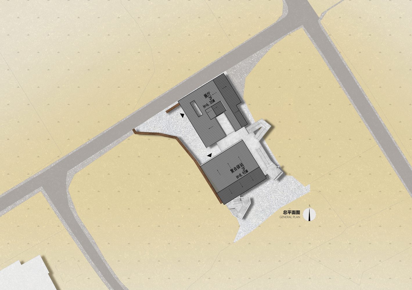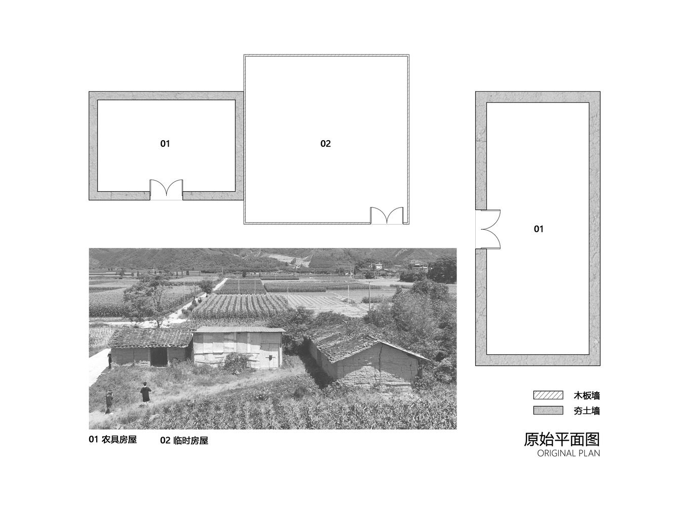 As a rural agricultural building and public place, the courier station is located in the cornfield outside the village and is in a delicate relationship with the village. It not only provides temporary stacking for transshipment corn but also provides supporting services such as scientific research and tea breaks for villagers. The site, adjacent to the road, was originally composed of two single-story rammed earth buildings and a temporary structure, which were used as farm toolhouses.