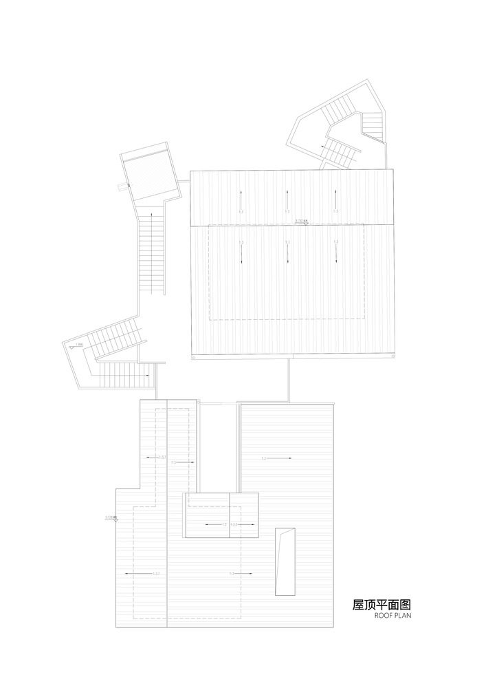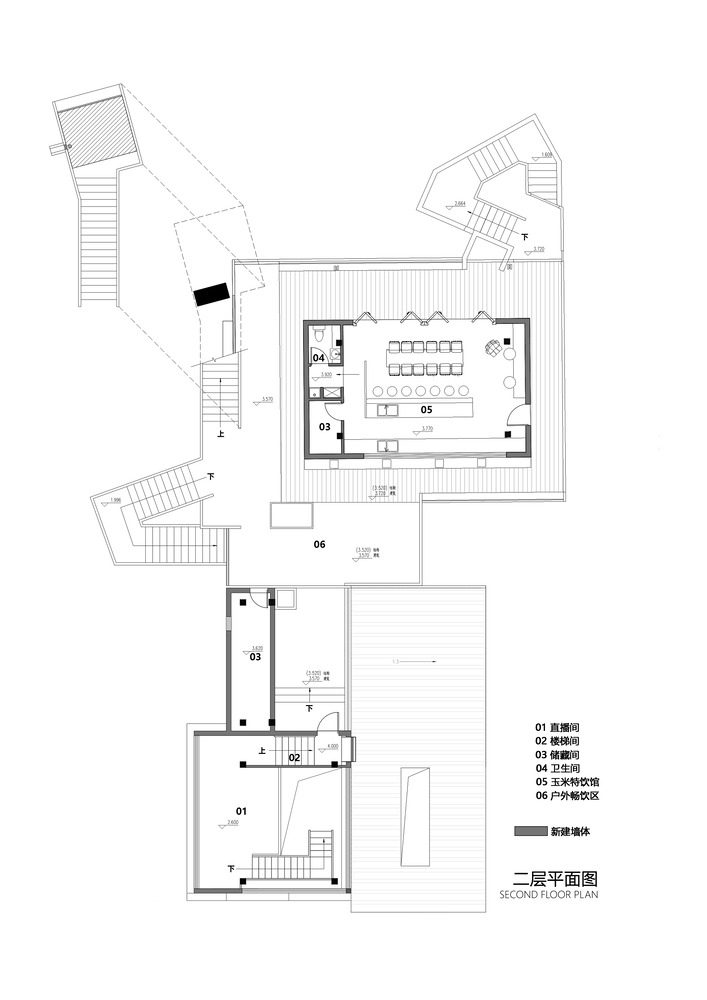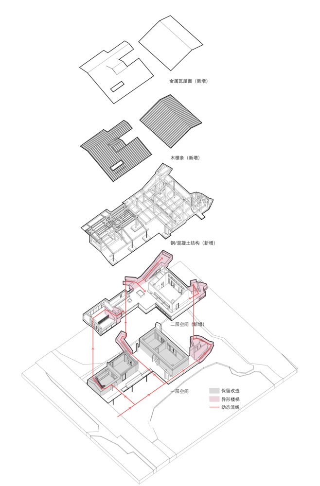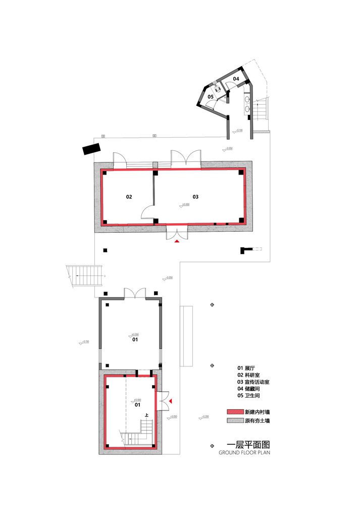 According to the needs and site conditions, we retained the rammed earth part and reconstructed the system within it, growing from the inside out: the steel structure of the north side of the building is used for the exhibition hall and the live broadcast room; The south side of the building is a research room, a seminar area and a drinking area, with a large span and a concrete structure to improve the rigidity. The two are connected in series through gray spaces such as atriums and platform viewing areas. Only a new partition wall was built on the first floor of the original building, which separated the three functions of exhibition, scientific research and publicity activities. The second floor is a new addition, with observation decks, winding staircases and corridors forming an outdoor leisure area.