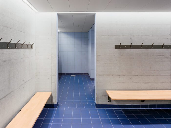 The sports halls are located in a semi-underground situation. The wardrobes are adjacents in an intermediate layer, making them easily accessible from the underground garage.