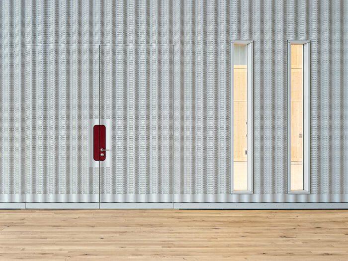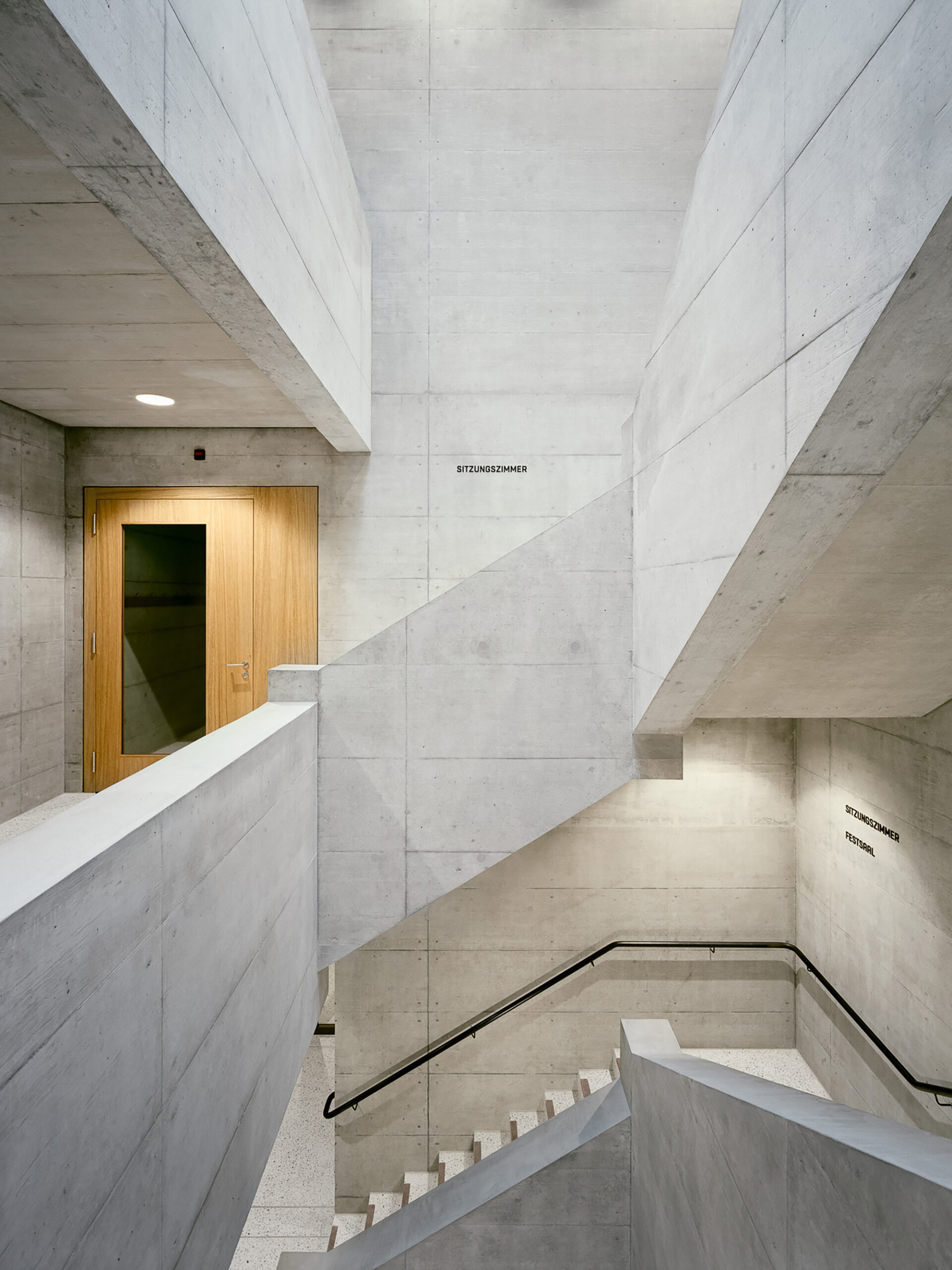 The halls are stiffened in the transverse direction by the concrete. This solid mass wraps itself around these “soft” timber structures. It remains raw in expression, withdraws, appears as a continuous background. The specialist disciplines like lighting, stage planning, kitchen and sports equipment are integrative components that are thematized architecturally and subordinate to each other in terms of their overall effect.