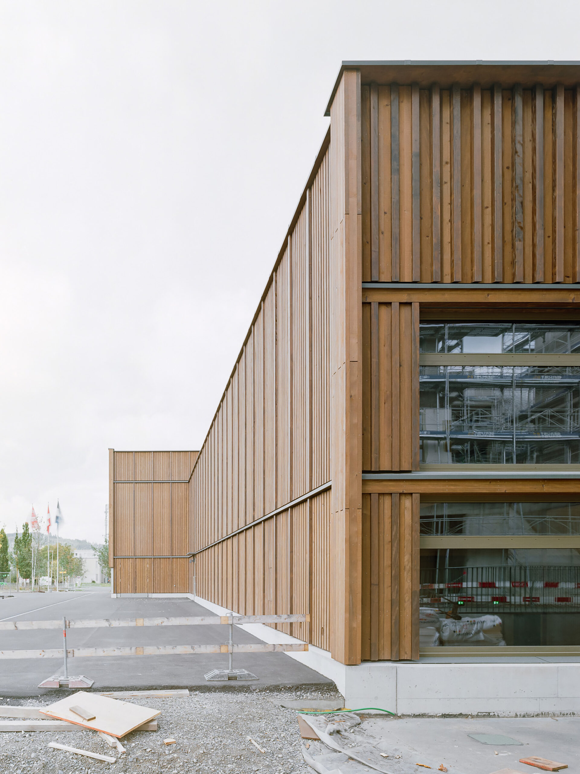 The cladding consists of closed formwork with timber profiles for the horizontal division of the bays. They are staggered in depth and architecturally themed. The variations in the surfaces and the differences between matt and glossy finishes enhance the play of light. The surface is finely sawn and pressure-impregnated for enhanced durability.