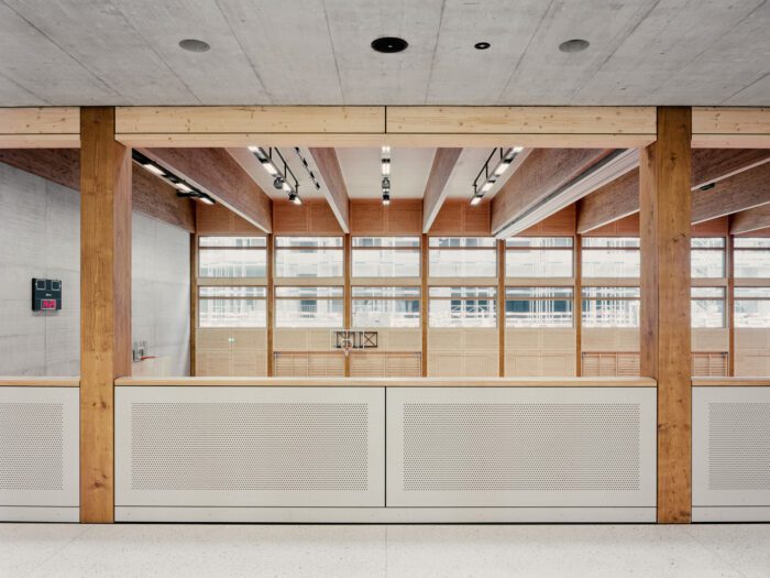 The structure is visible and on display. Two main materials dominate the perception of the spaces: concrete as a mass formed on site. Wood, as a prefabricated structure determines the expression of the hall bodies. The primary supporting structure of the multi-purpose and triple sports hall consists of columns and trusses in glued laminated timber. They form a series of frames that are connected to each other with infill panels. The result is a sequence that is expressively stable, with a great organizing effect.