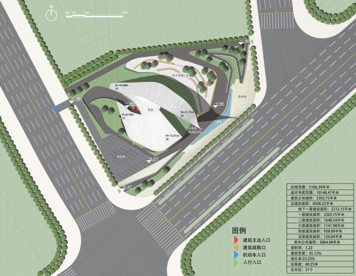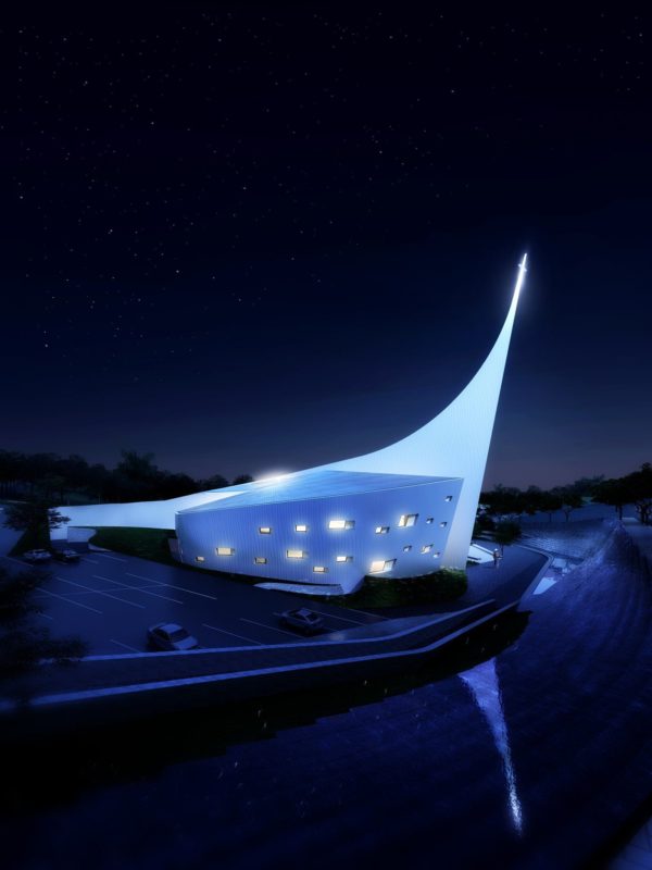 The other projection happens onto the ground, extending from and celebrating the entrance, but also marking the main axis of the building, that marks the two main volumes, the ‘body’ and ‘wing.’ It is also the vertical axis of the building, where stairways are situated.Given the city center it aspires to be, it not only serves as a house of God but also houses other functions, linking the earthly with the celestial. Many churches seek to lift the person’s experience closer to the cosmos, but Dove of Peace seeks to lift a people’s experience.