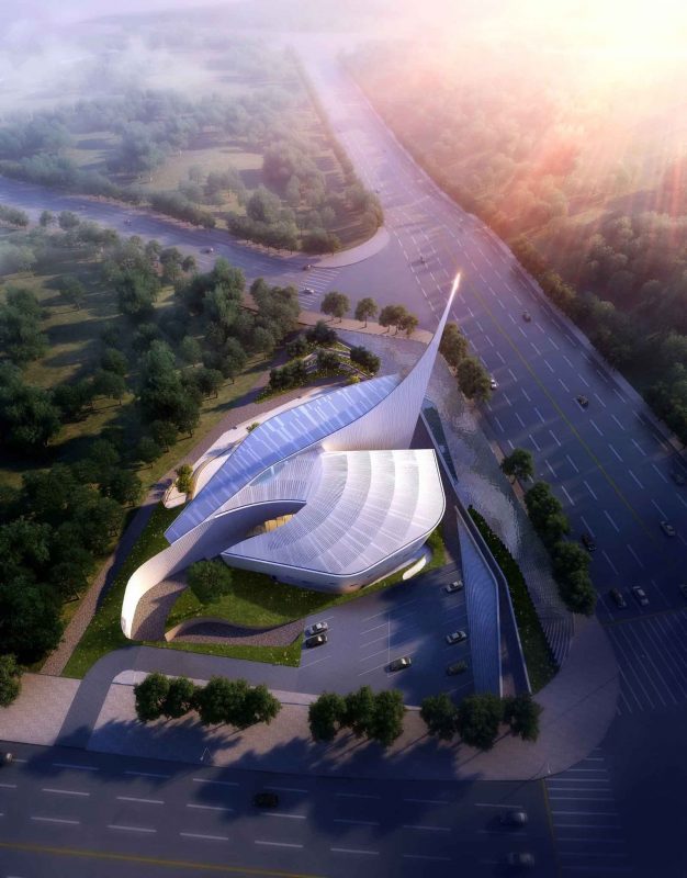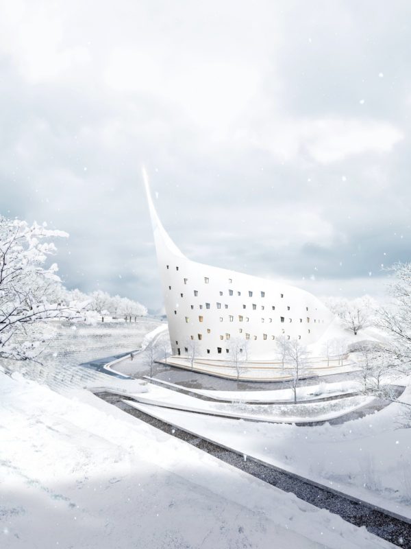 One of the main aspirations for the building is to serve as a landmark for the city, thus it is a representation of the city’s people. Accessibility is key. The form is curved. Visually, the curved façade unlike an orthogonal one allows views from all sides that invite the eye to go around. Physically, the surrounding park makes accessibility open-ended and possible from anywhere, giving pedestrians full freedom in approach. The Dove’s bowed walls are meant to be embracive. The surrounding landscape is meant to nestle the Dove, furthering the idea of an embrace.