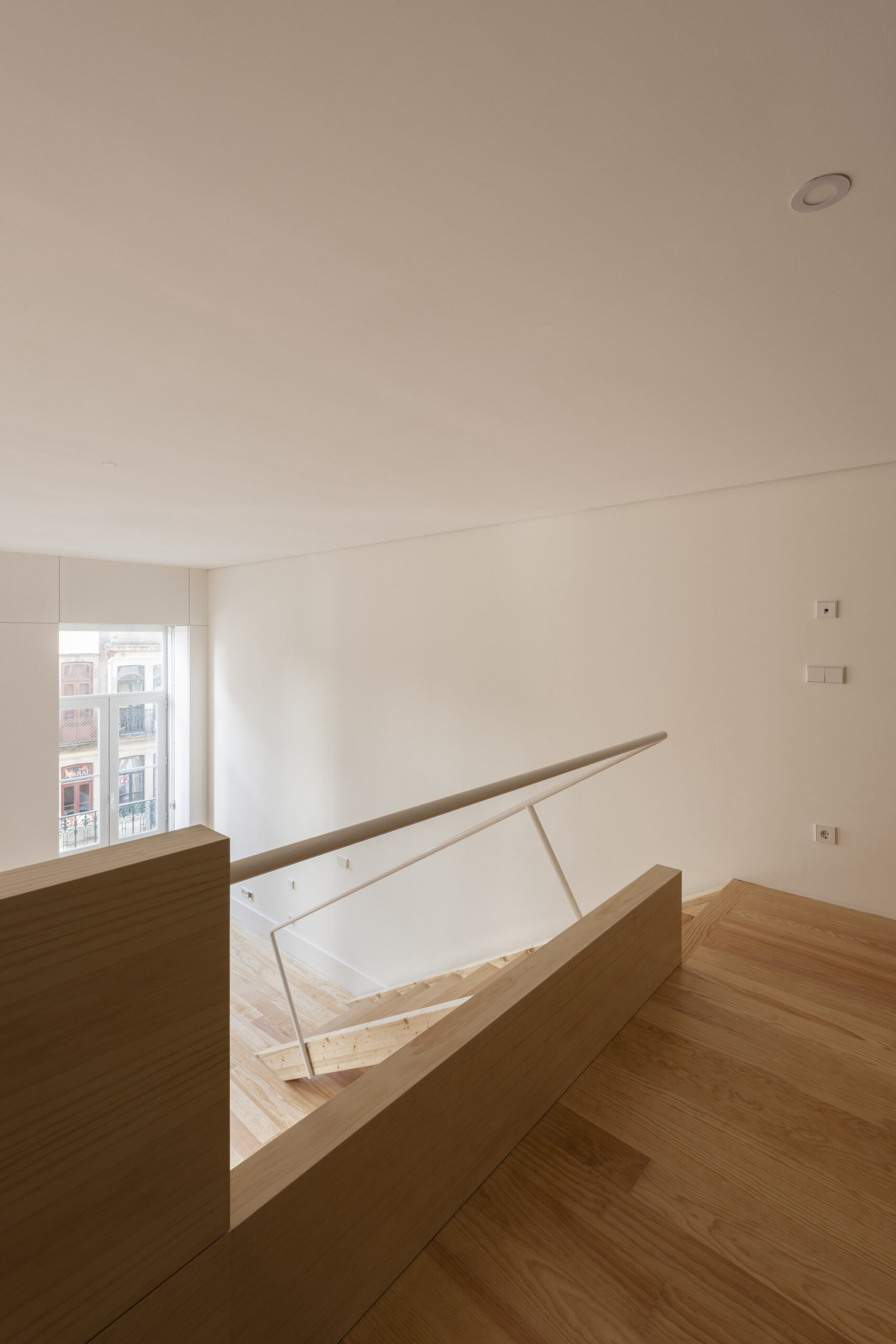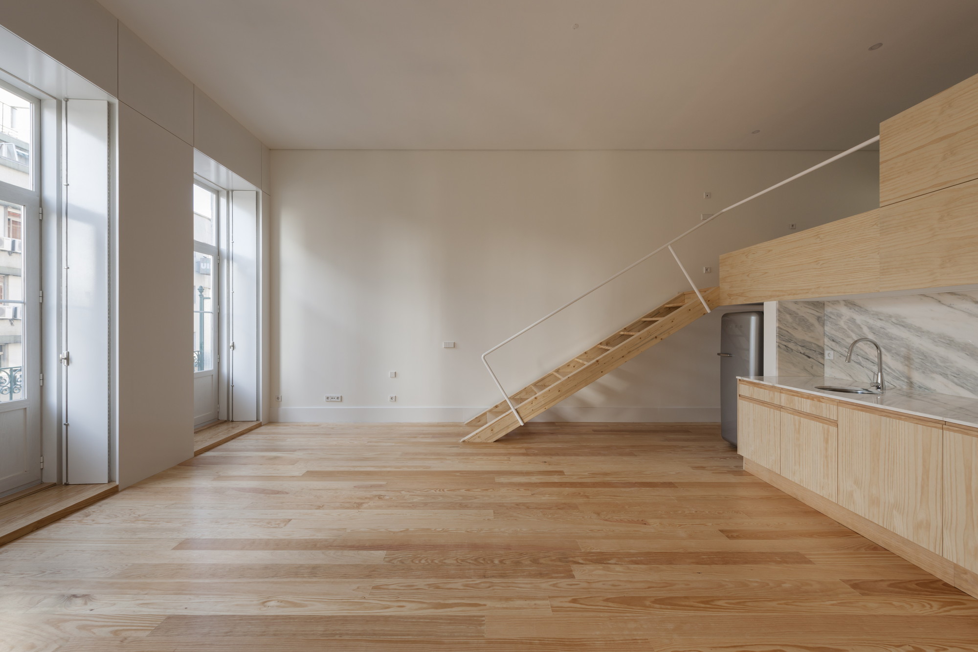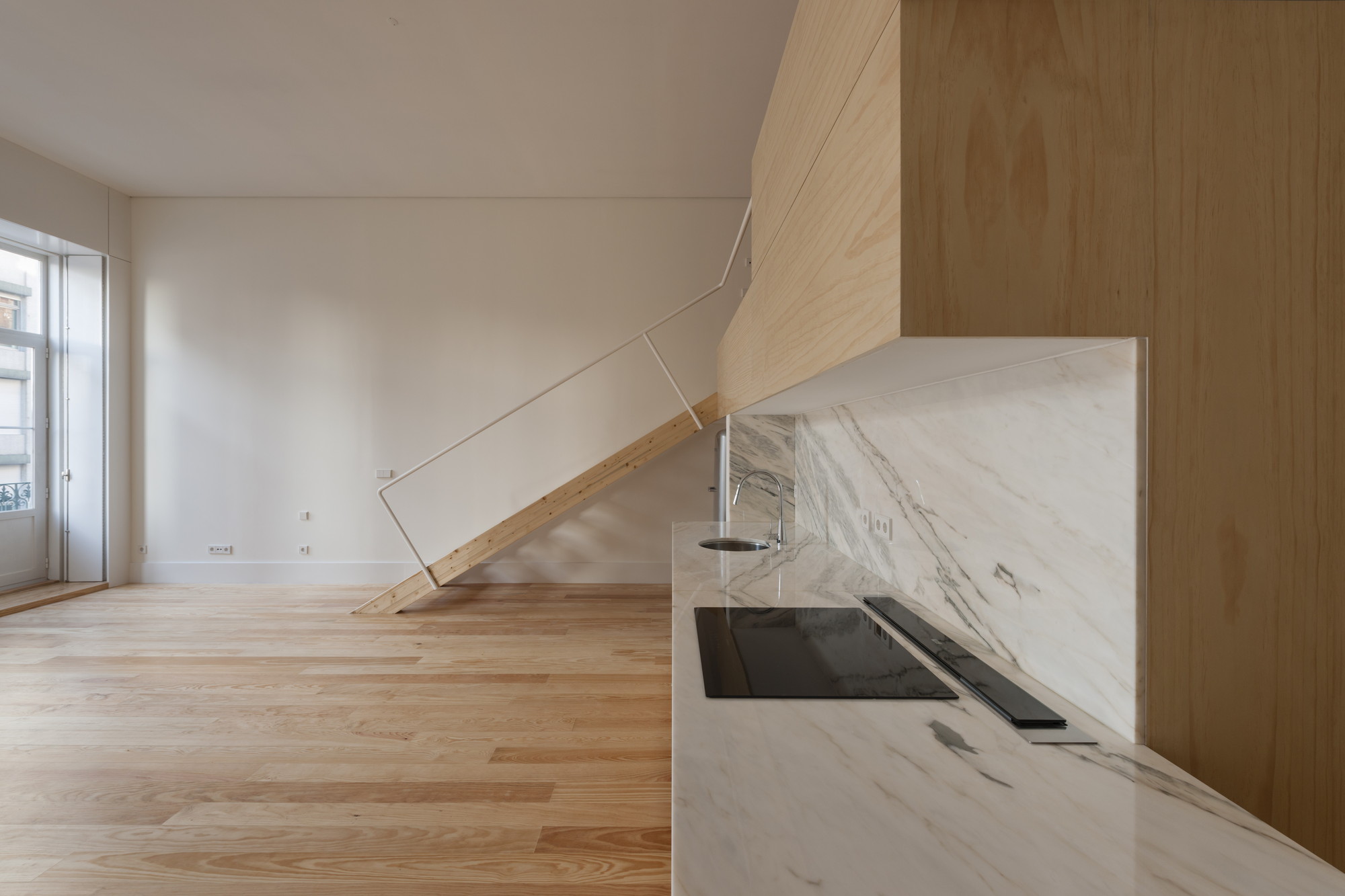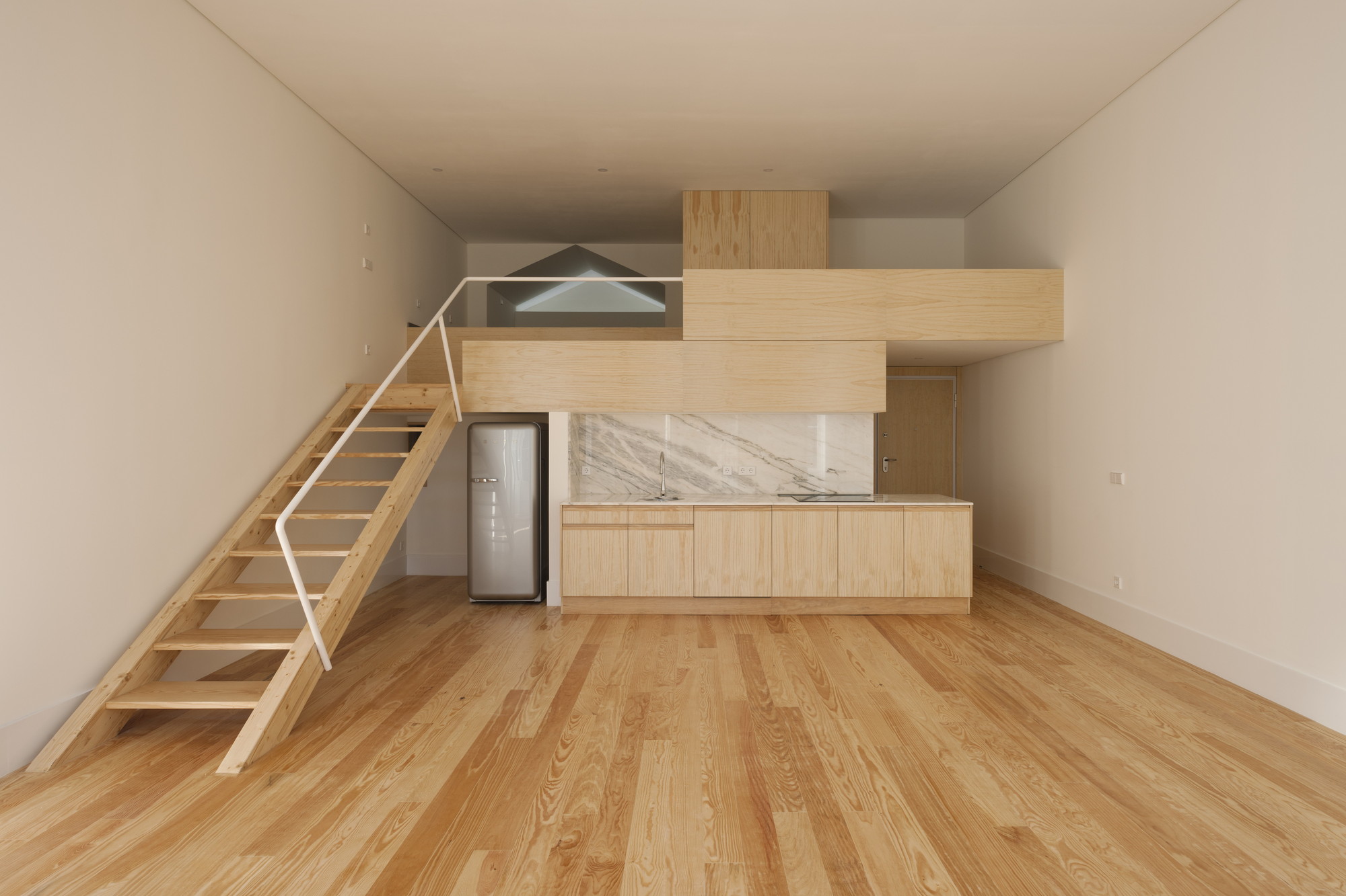 Downtown Studio, This project consists in the transformation of a small apartment inserted in a building of the XIX century located in the historical center of Porto. Given the small dimension of the space and the customer’s specifications to increase the useful area, the proposal is based on the design of a mezzanine over the central space, taking advantage of the high ceilings characteristic of the constructions of this period. This intermediate floor thus integrates a bedroom, an additional and open space over the living room, and above all private and separate. The lower floor develops into the living and dining room, which also includes the kitchen. The remaining service spaces like the bathroom and storage are concentrated in the surplus area, interior and under the bedroom.