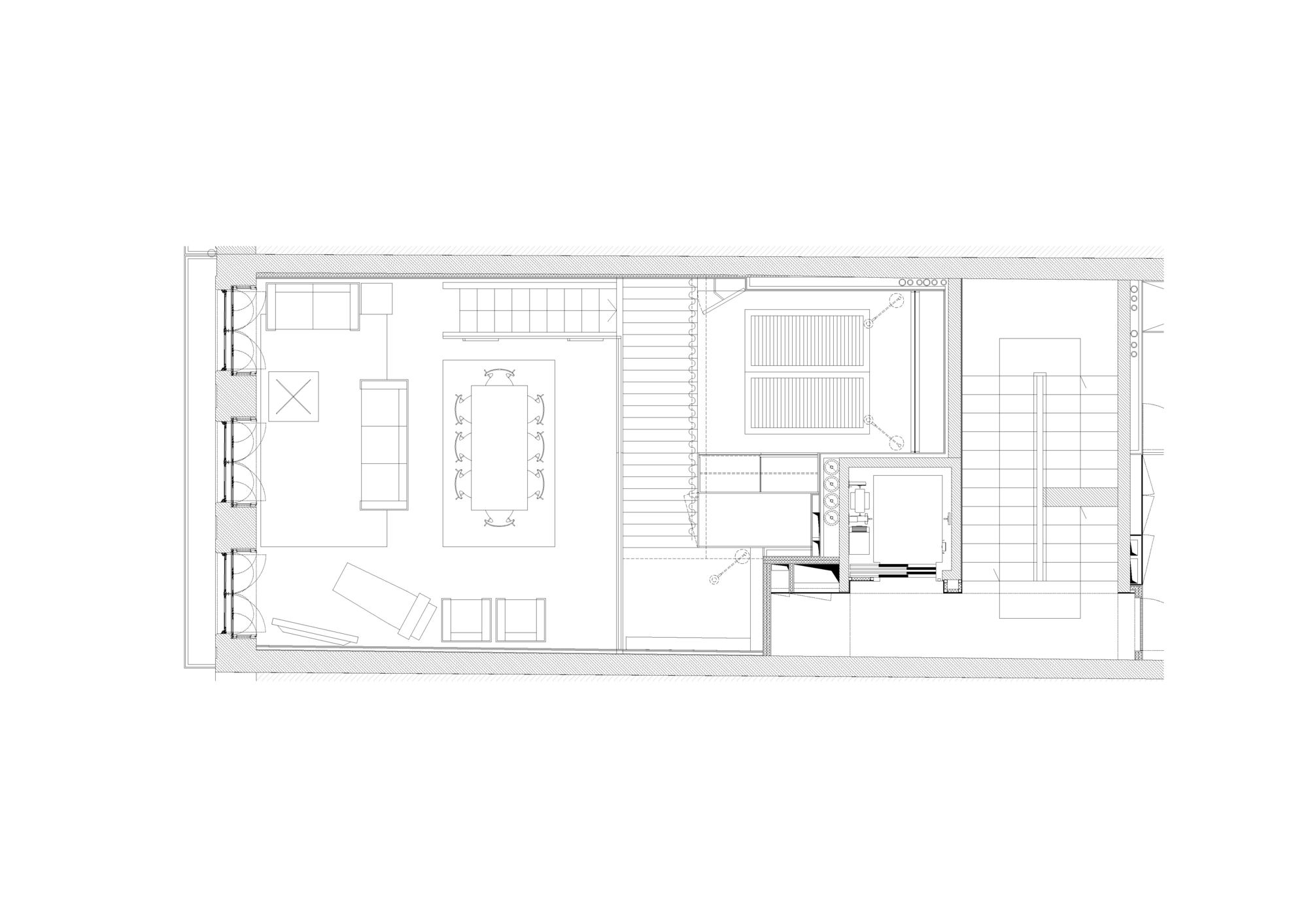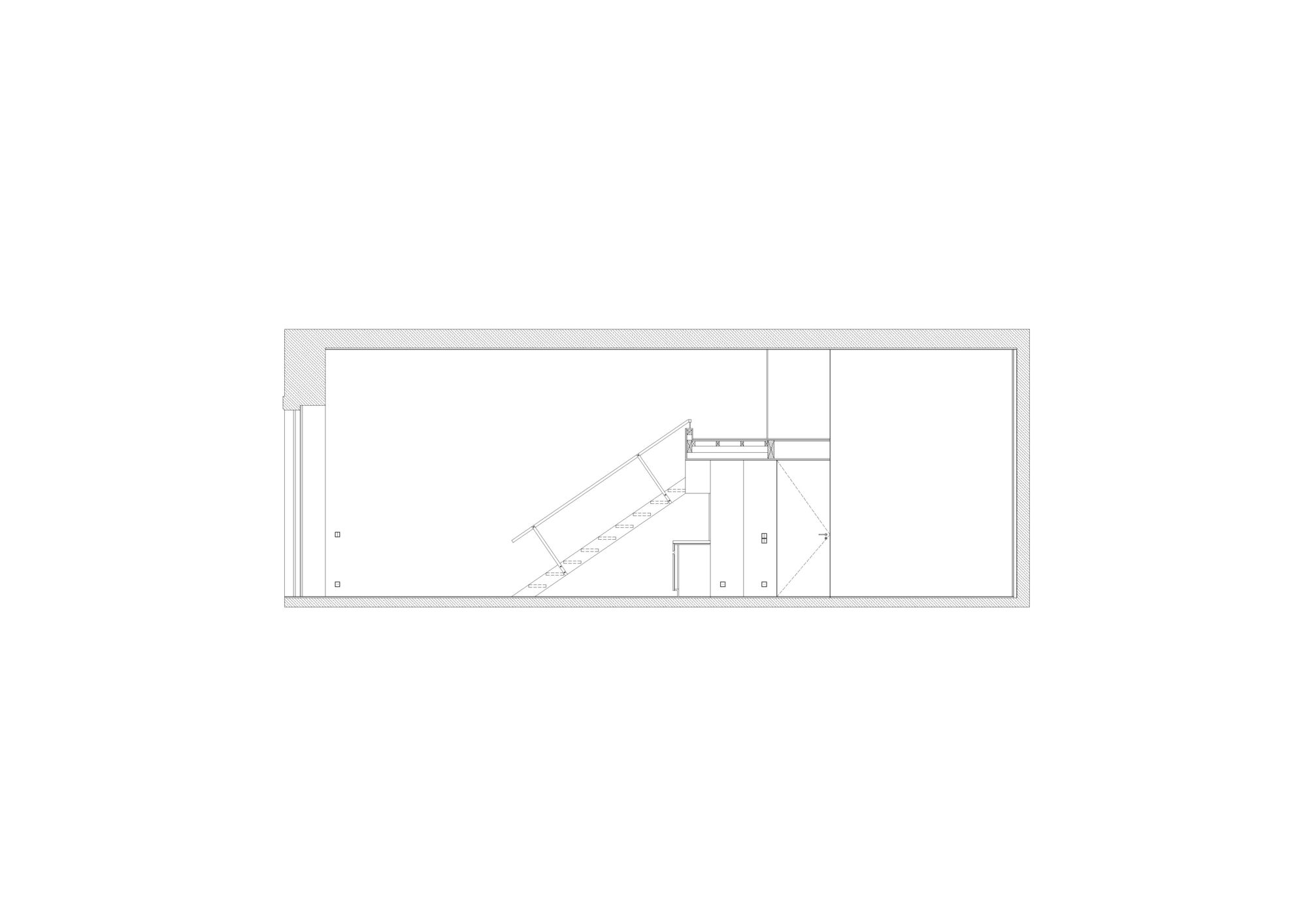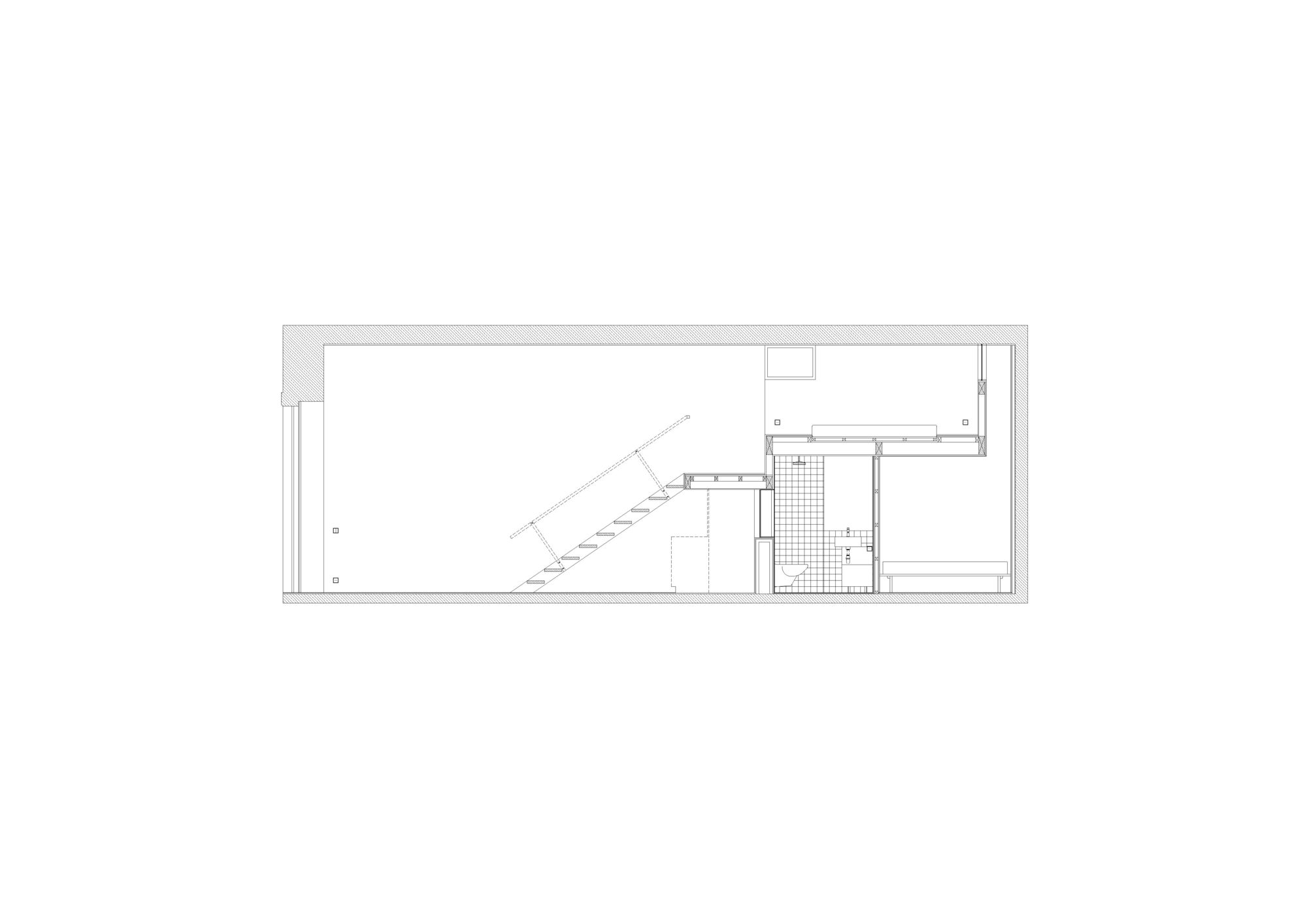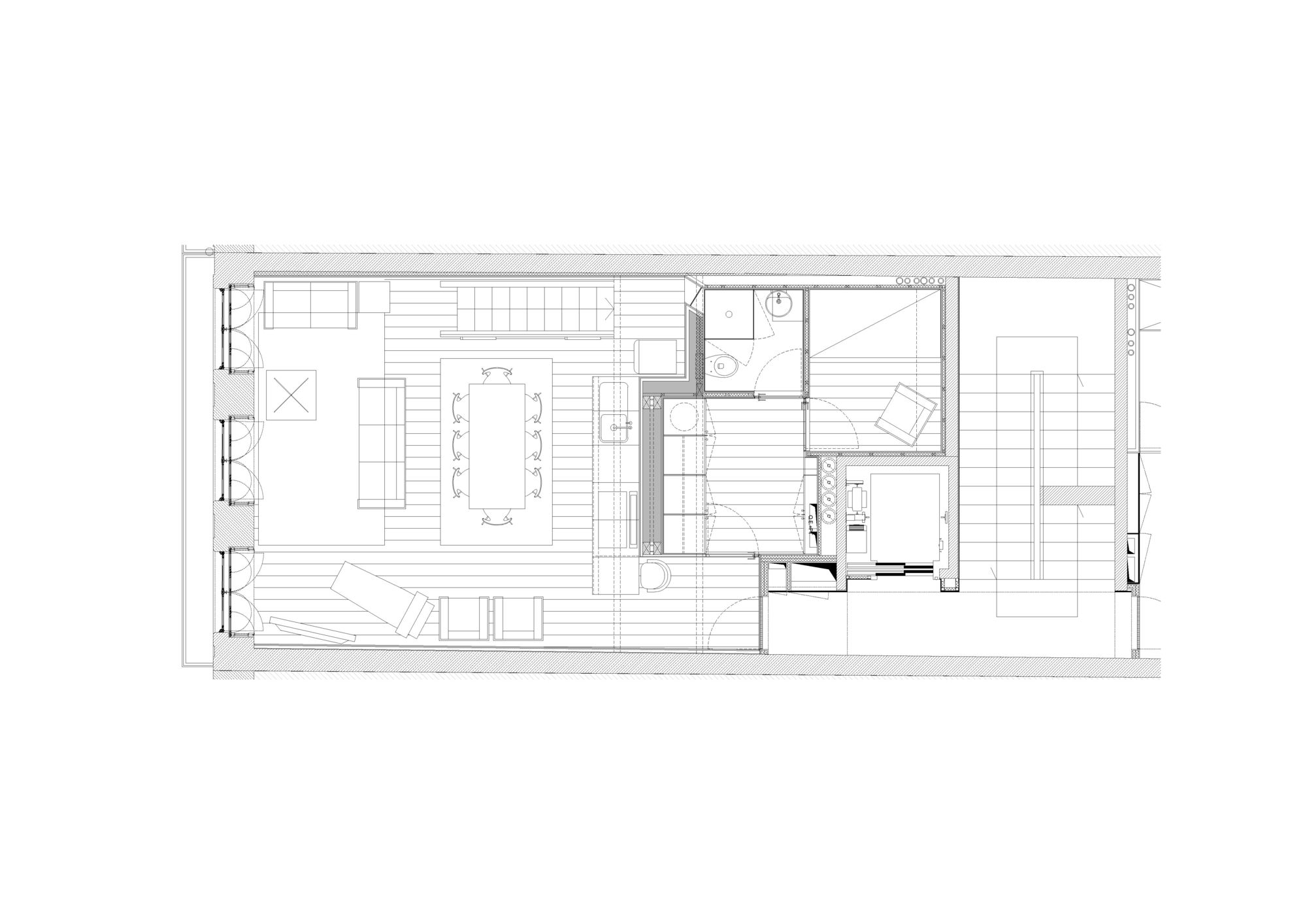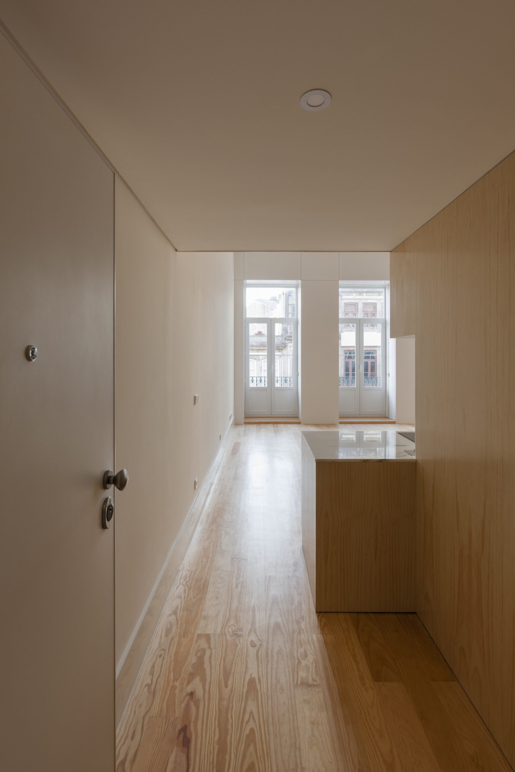 Downtown Studio, This project consists in the transformation of a small apartment inserted in a building of the XIX century located in the historical center of Porto. Given the small dimension of the space and the customer’s specifications to increase the useful area, the proposal is based on the design of a mezzanine over the central space, taking advantage of the high ceilings characteristic of the constructions of this period. This intermediate floor thus integrates a bedroom, an additional and open space over the living room, and above all private and separate. The lower floor develops into the living and dining room, which also includes the kitchen. The remaining service spaces like the bathroom and storage are concentrated in the surplus area, interior and under the bedroom.