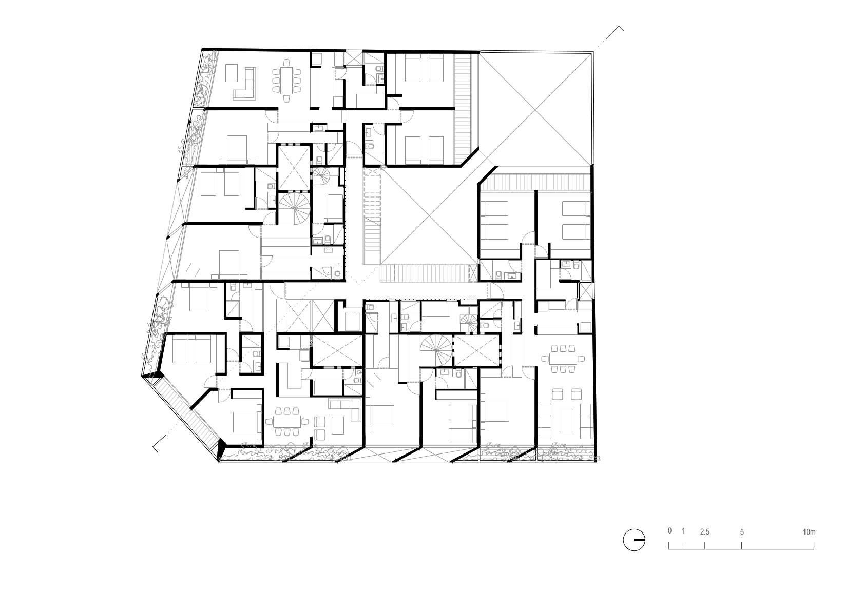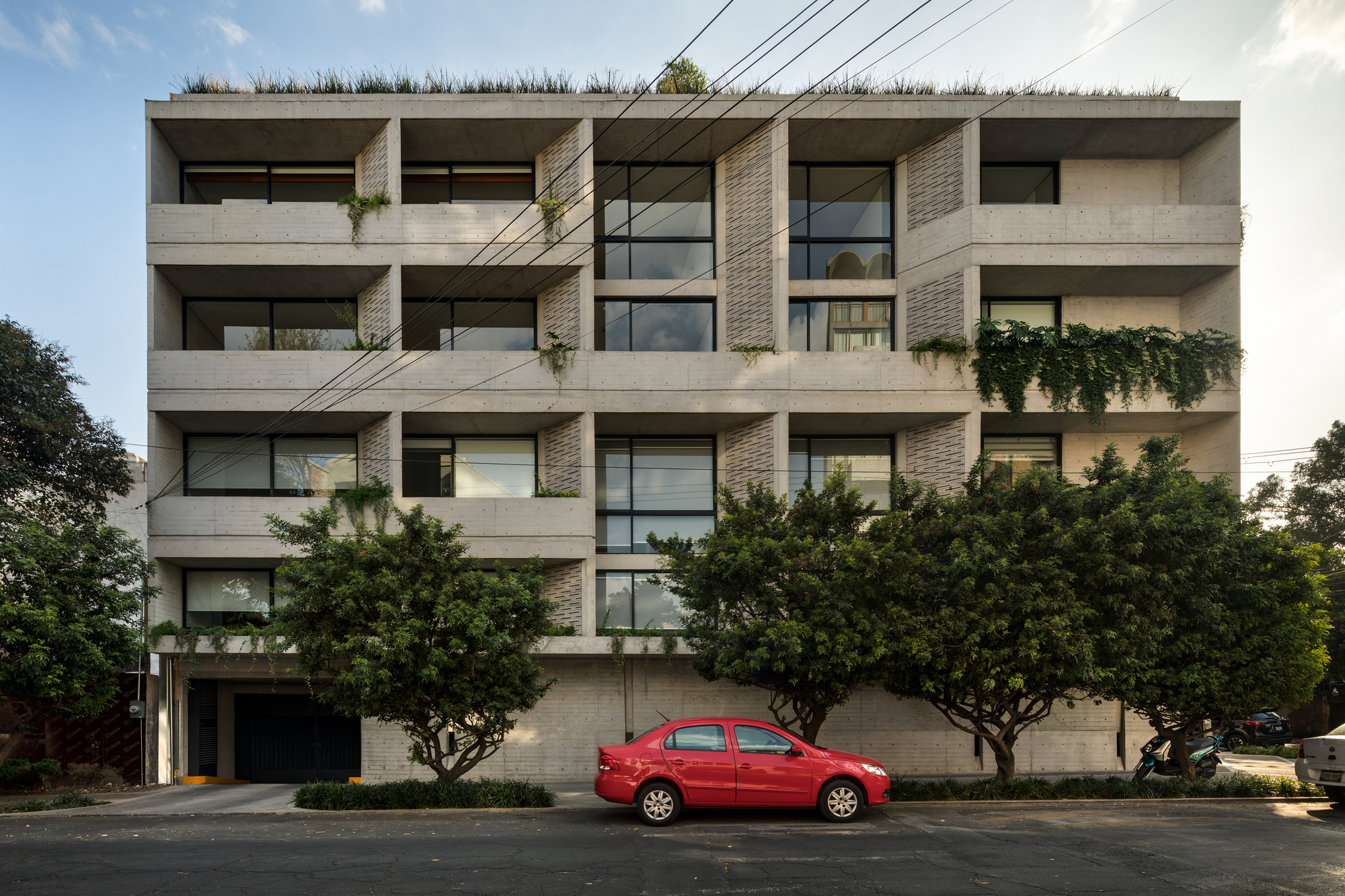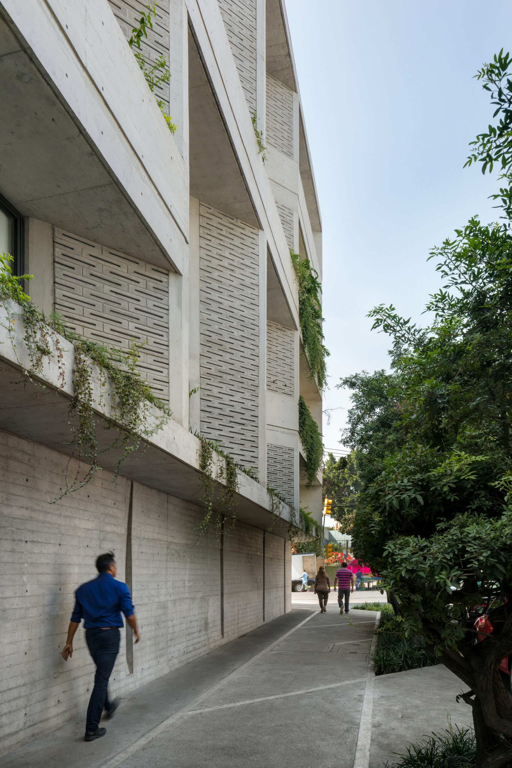 DPS Apartments, The design explores the traditional type of housing in Colonia del Valle, where the corners of the buildings are cut away, creating a wide street centre. Taking advantage of the space created in these intersections, the scheme is solved through a diagonal sequence of open spaces that go from the public to private.
