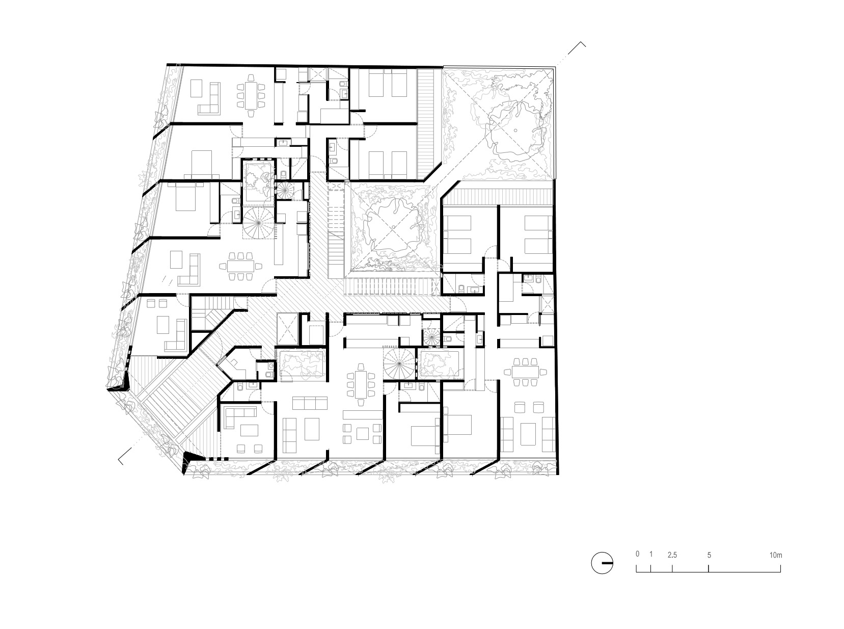 Based on this scheme, the housing units are organized to not have any “backside” apartments. This is achieved by using simple and duplex typologies, relating both to the interior courtyards and gardens, as well as the street.