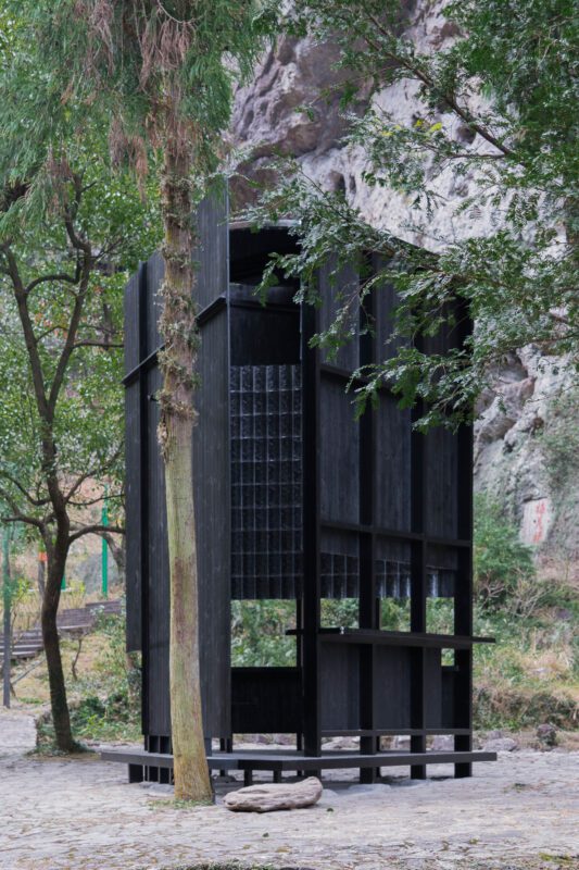Raindrop Apparatus – Drawing inspiration from the raindrops formed between the tiles of traditional East architecture, we aimed to reform the spatial role of eaves. Originally external structures for sheltering from wind and rain, we inverted their function, bringing them into the interior space. Within the pavilion, transparent glass tiles are layered to form a stark contrast with the charred black timber exterior. Sunlight filters through the gaps at the top, casting textures across the tiles, weaving a poetic interplay of mountain, water, light, and shadow.