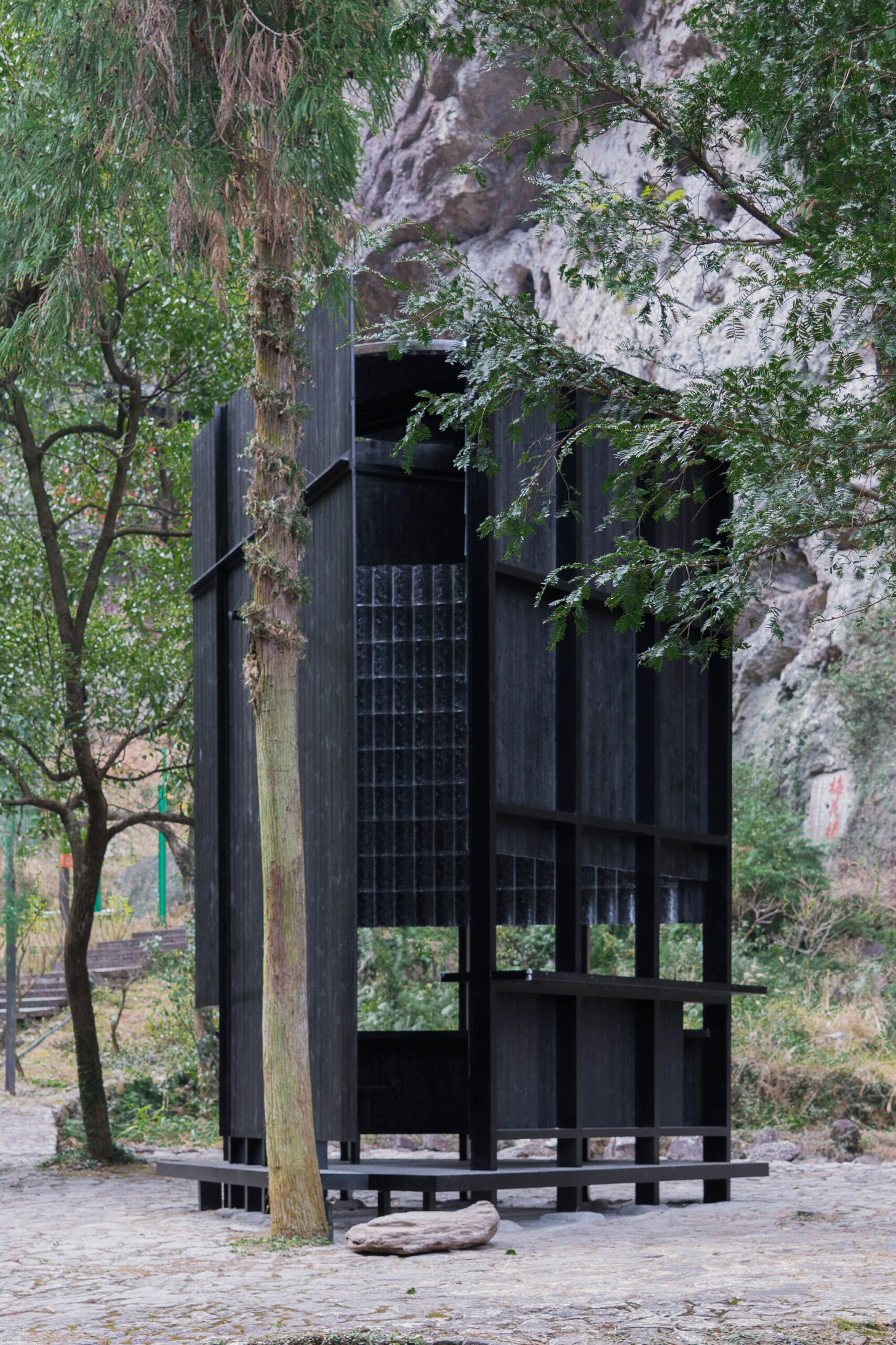 The stone step and pine tree at the entrance originated from the site. During construction, we intentionally positioned the entrance beside the towering pine tree, allowing its vertical elegance to resonate with the pavilion’s upward posture, making the tree an integral part of the design.