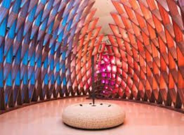 The cosmos piece, resembling a black egg, houses huge monolithic areas to provide impressive scale experience for the museum’s visitors. DuPont™ Corian® has created a 20 meters long, 14m wide and 11m high space for 200 people to interact in a sensory journey through the universe. The museum’s tour is virtual and takes uses through different mediums through galaxies into subatomic worlds of elementary particles, to the very heart of the sun, and observes how the earth and its life began.