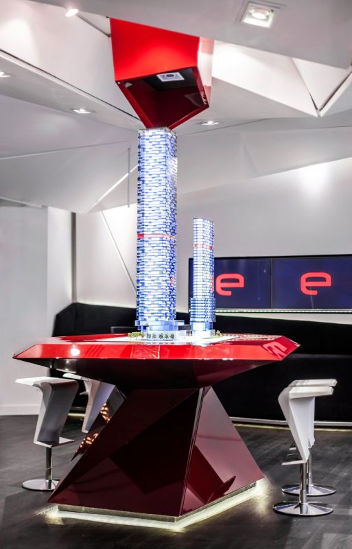 The use of LED lighting around the edge of the panel gave the feeling as if each panel was floating in its own spatial frame. At the center of the table consists of The E Condo model which was illuminated by a custom built chandelier. The table’s base also consists of a removable panel that provides access to electrical connections. The unique interior structural elements within the E Condominium Towers portrays a kind of elegant yet complex nature of geometrical forms as it benefits from technical inputs.