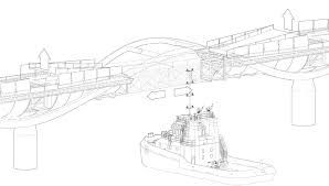 The continuous outdoor wooden deck, available for pedestrians and cyclists, unfolds over the bridge with a sub-level weather protected passage that makes the crossing of the river possible all year round offering protection from low temperatures, wind, rain and snow. All river traffic, patrol coast guard boats, ferries ,and private boats will be able to continue their daily activities navigating through 45’0”high arcades .The bridge can be opened upon demand at its center thus providing a greater 75’-0” high passage for tug boats or other similar commercial ships.