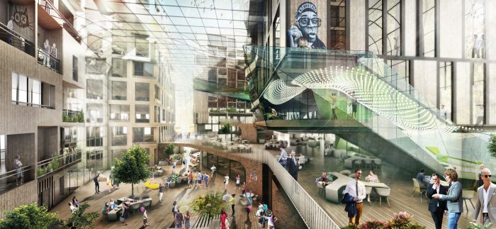Transparent corridors, public gathering spaces, emphatized visual connection between spaces and people are some of the means employed in this project, in the attempt to produce a general spirit of creative and active community-living. In fact, the main transparent corridor, named the “Spree Riverbank For All” meanders through the building, providing visual contact with the most diverse moments and people. Eckwerk’s image and architectural expressiveness reflects its concept. It’s eclectic and attempts to transpire a vibrant energy. The displacement of the apartment blocks on the façade creates an irregular and always different composition; the solid bricks on the bottom floors, besides being reminiscent of a conventional German street, create a coherent materiality for the relationship with the street and its people. The inside of the complex holds an “inner street”, where a central plaza is created, surrounded by the buildings, and covered with a transparent skin, in order to let the sunlight flood the creative enterprises of the inhabitants.