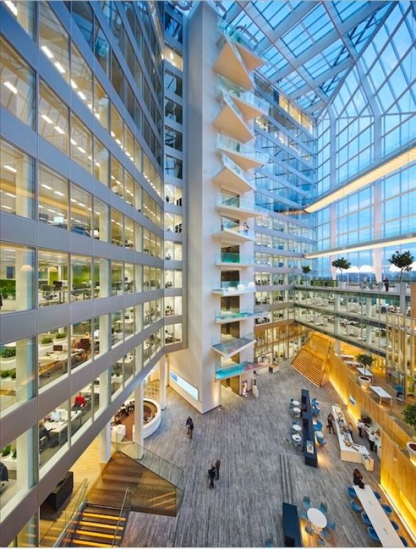 Situated in the center of Amsterdam’s Zuidas business district, The Edge is an office building which opens itself up to the city with its 15-storey atrium. The atrium acts as a window between the world of work and the outside, as well as providing a social heart for the building, and serving as an environmental buffer to reduce energy use. The client, a Dutch developer devoted to architectural innovation, asked for an ambitious building which would set new standards for office design in multiple areas, including sustainability, technology, workplace design, structural and façade engineering. Above all, the brief was to create an inspirational business environment.