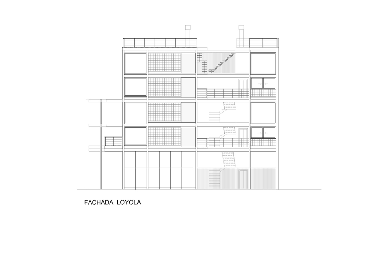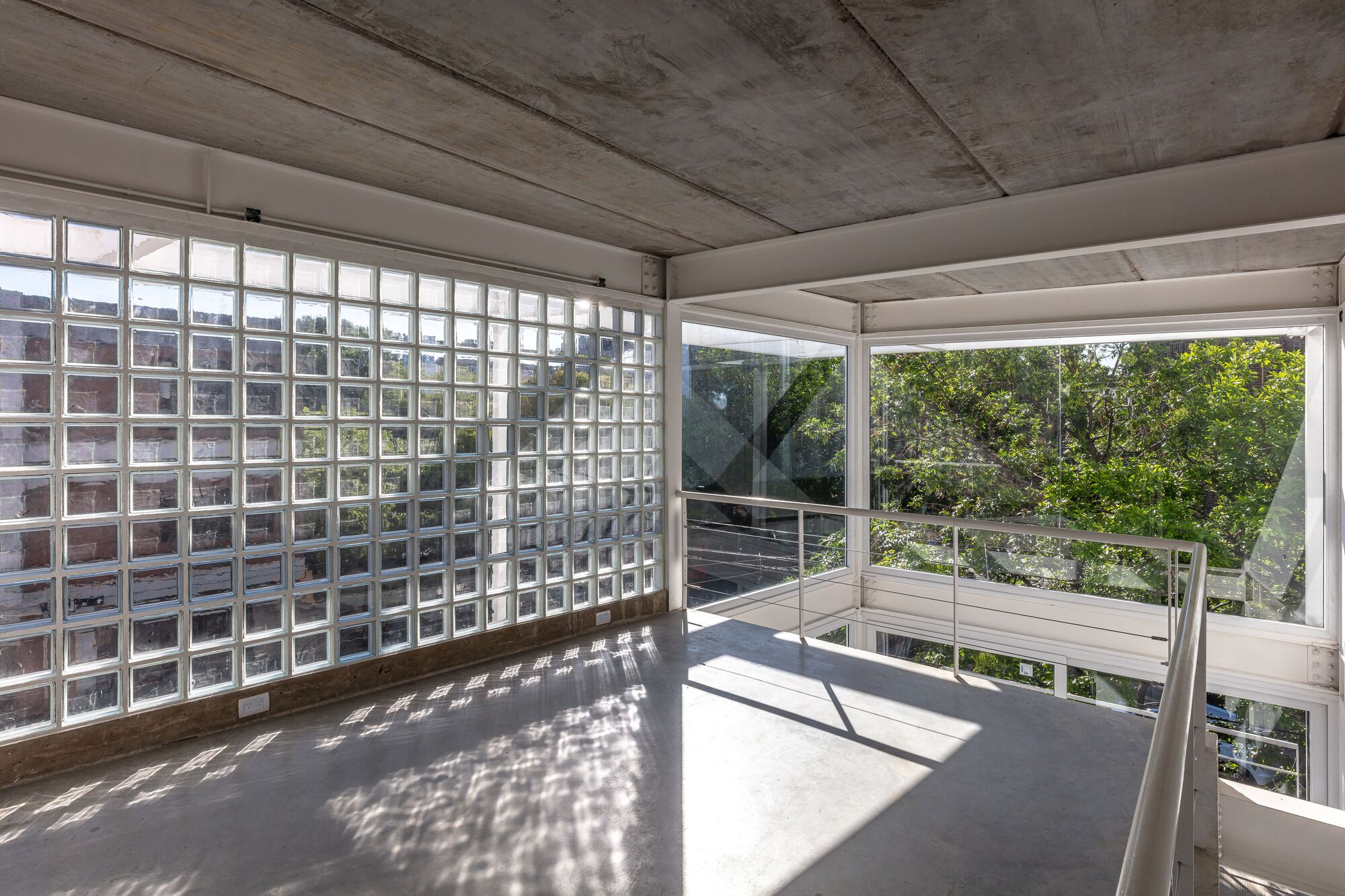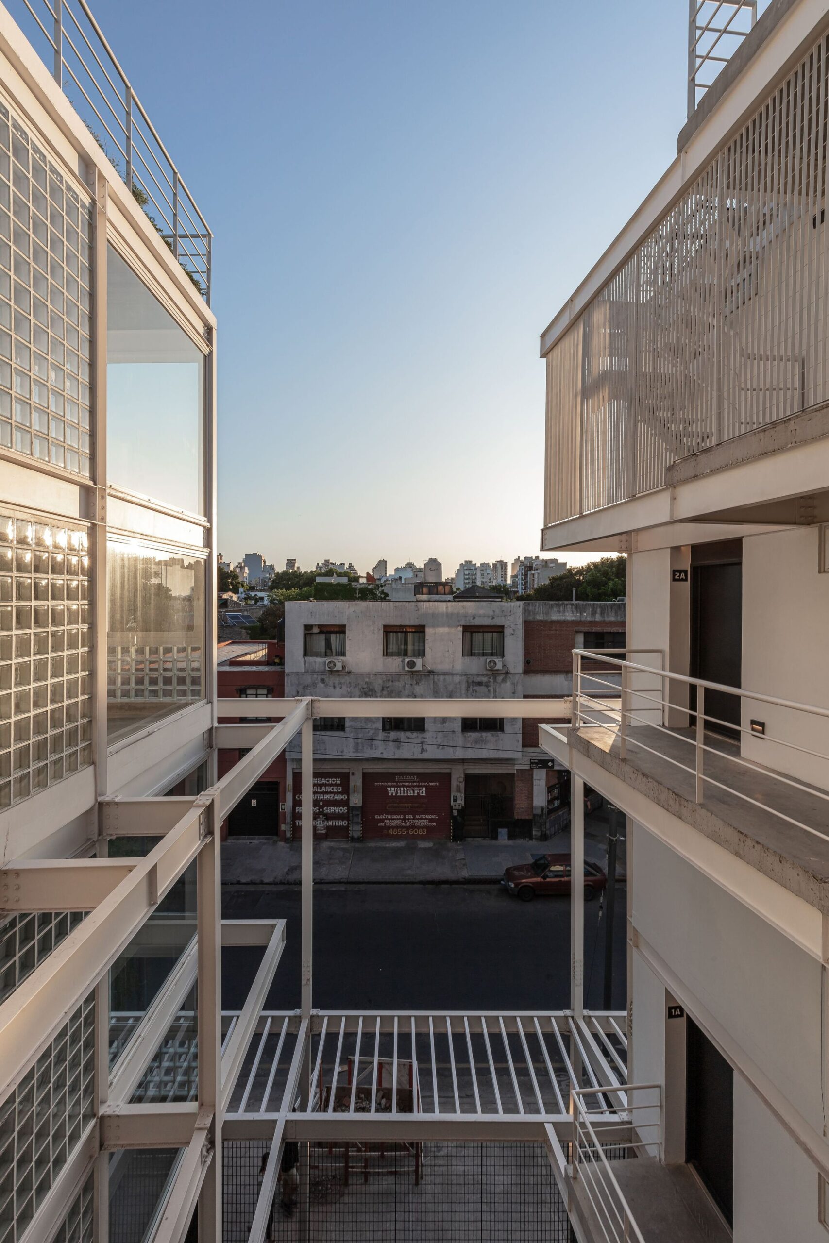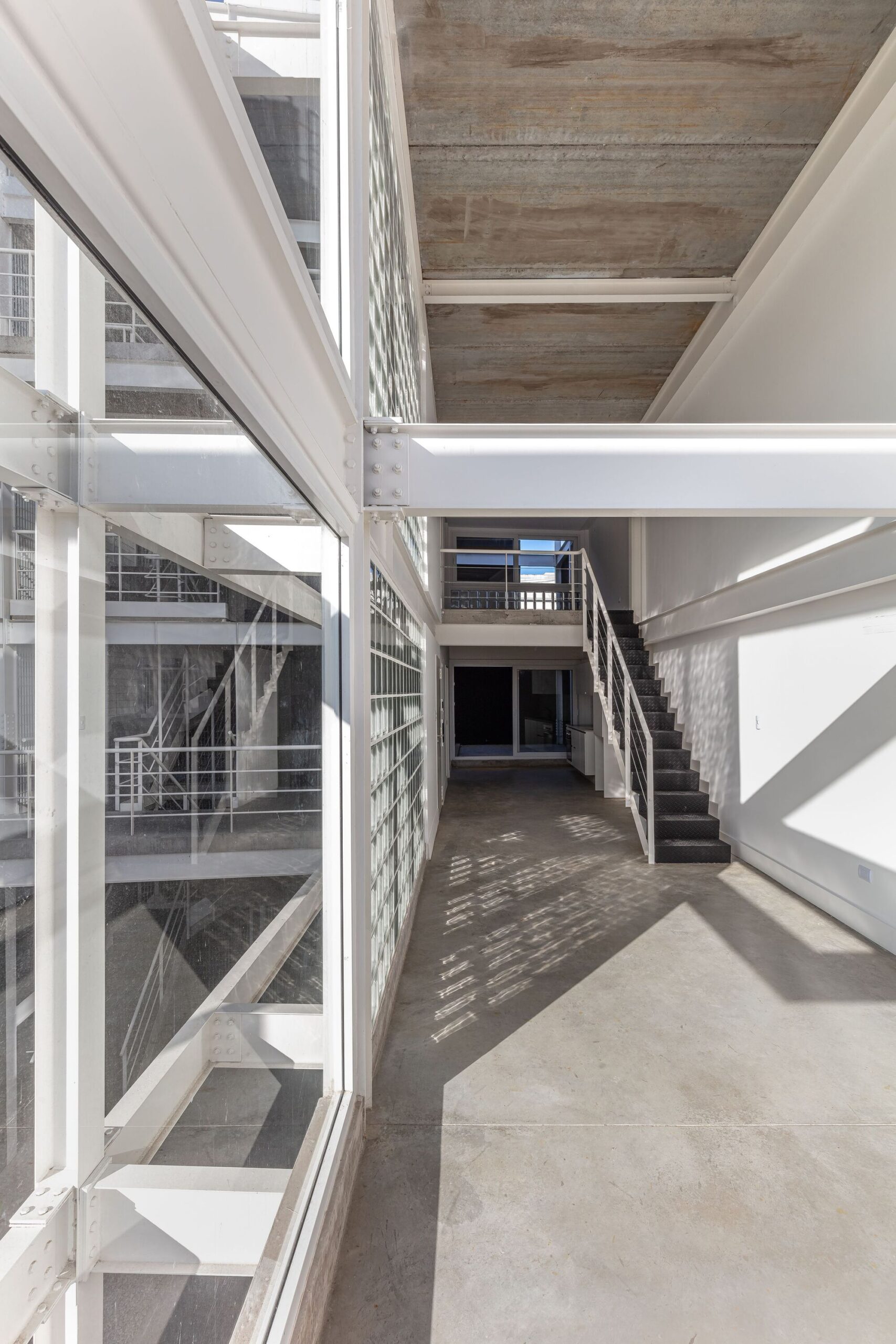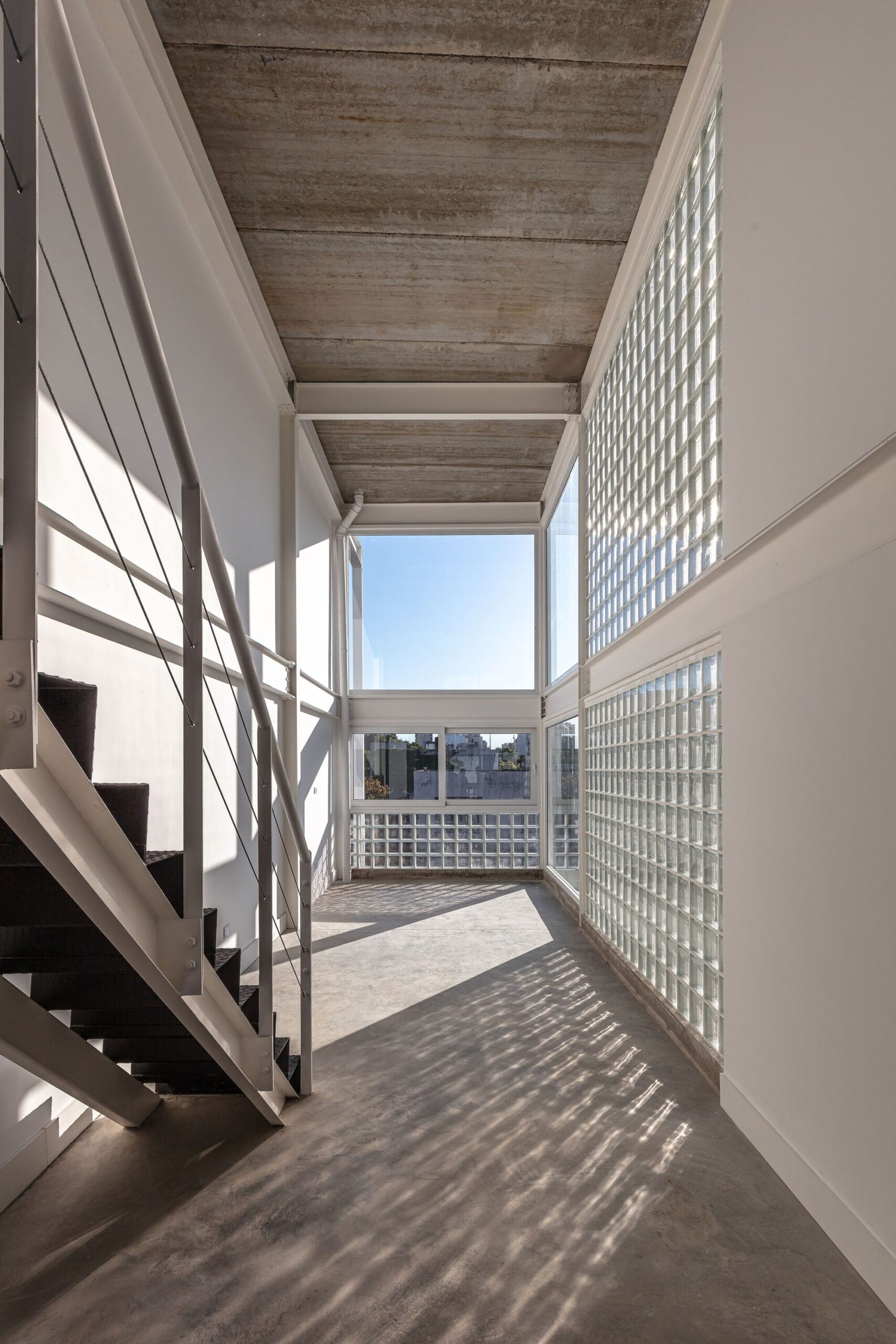 A continuación, comenzamos el montaje de la carpintería de PVC y el armado de las paredes de ladrillo de vidrio para completar el cerramiento exterior, porque en la funcionalidad consideramos que estos ladrillos generan una intimidad e iluminación especial lo cual también nos ayudó a racionalizar el diseño de las ventanas reduciéndolas a unas pocas tipologías que se emplearon en todas las unidades. Una vez cerrado el edificio se montaron las escaleras interiores y exteriores de acceso a las terrazas, conjuntamente con las barandas interiores, exteriores y enrejados tipo malla TDL La escalera de hormigón armado, colgada con tensores angulares en los descansos, se realizó como una viga suspendida que va adaptándose al ángulo generado por la implantación de los volúmenes sobre Darwin y Loyola.