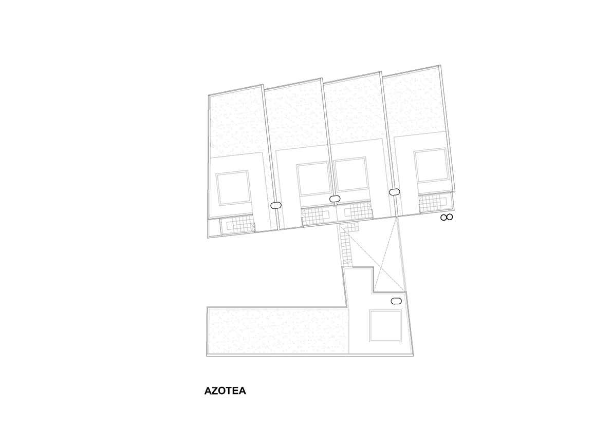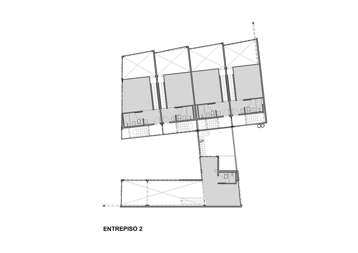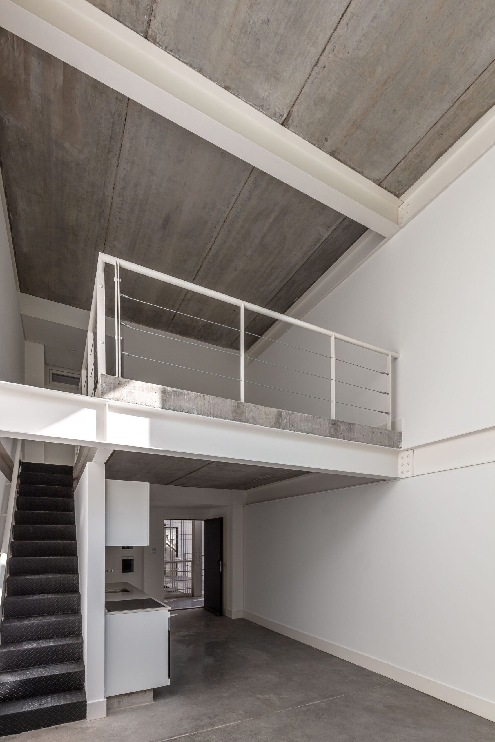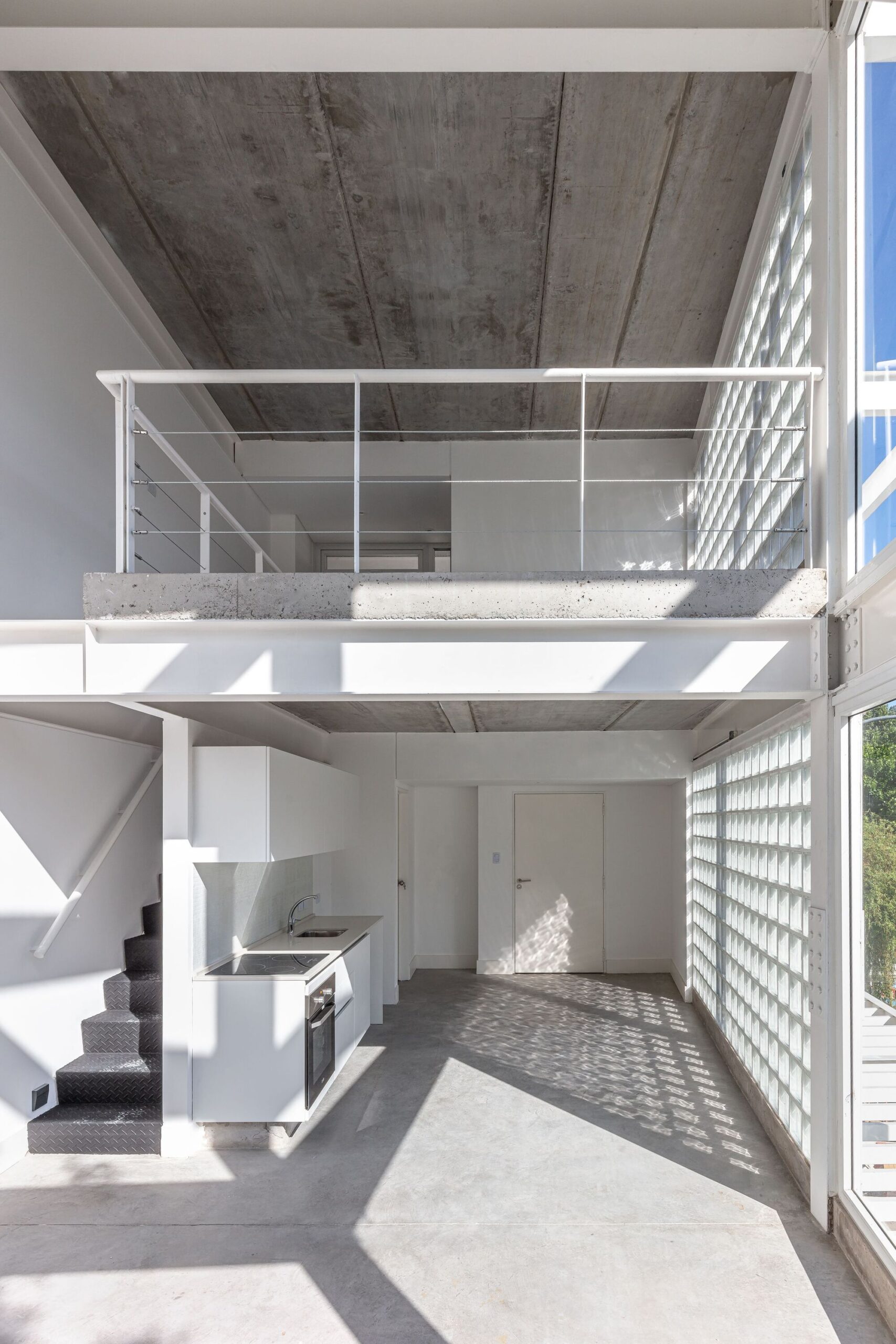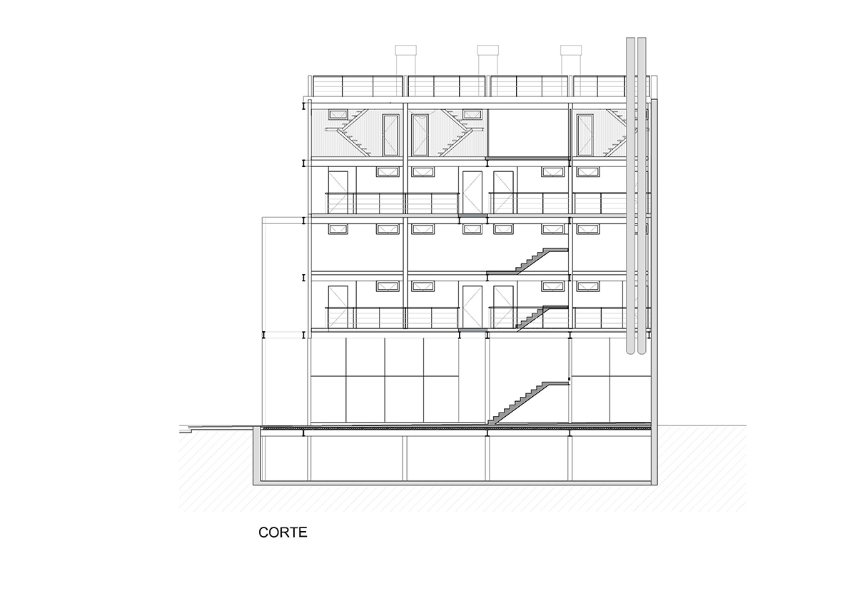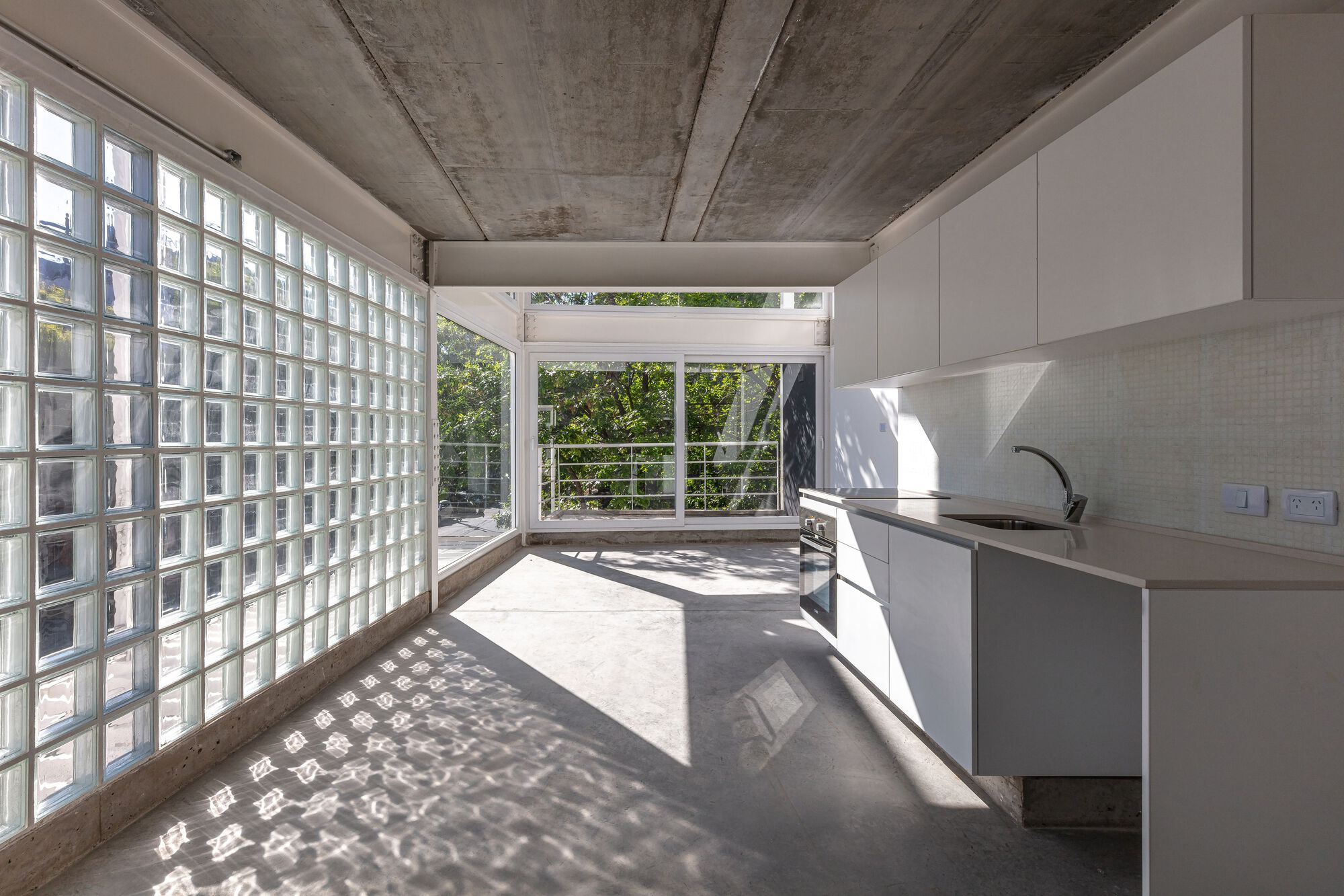 A continuación, comenzamos el montaje de la carpintería de PVC y el armado de las paredes de ladrillo de vidrio para completar el cerramiento exterior, porque en la funcionalidad consideramos que estos ladrillos generan una intimidad e iluminación especial lo cual también nos ayudó a racionalizar el diseño de las ventanas reduciéndolas a unas pocas tipologías que se emplearon en todas las unidades. Una vez cerrado el edificio se montaron las escaleras interiores y exteriores de acceso a las terrazas, conjuntamente con las barandas interiores, exteriores y enrejados tipo malla TDL La escalera de hormigón armado, colgada con tensores angulares en los descansos, se realizó como una viga suspendida que va adaptándose al ángulo generado por la implantación de los volúmenes sobre Darwin y Loyola.