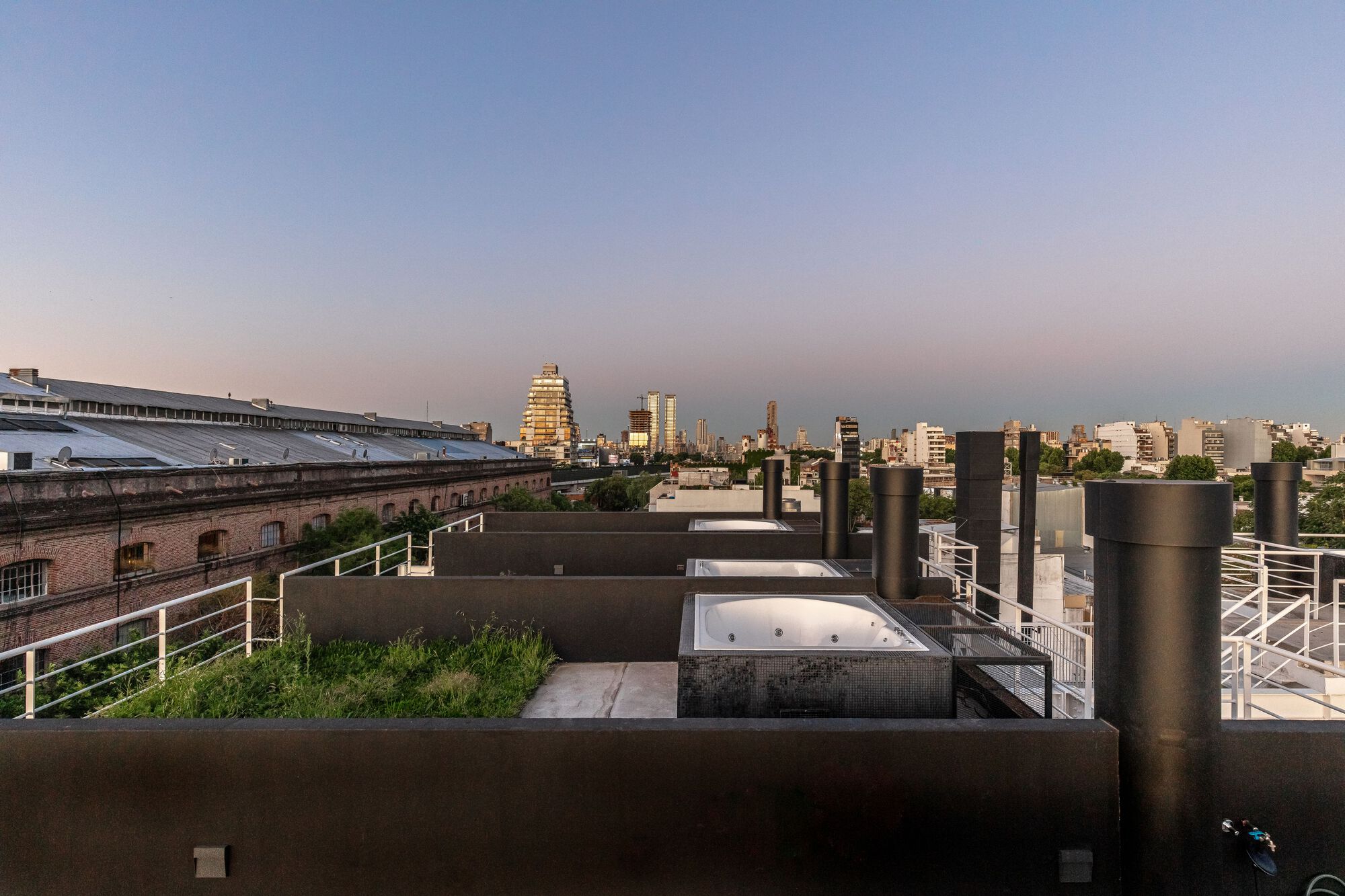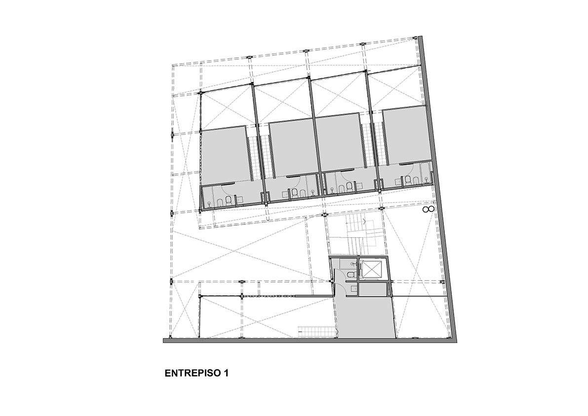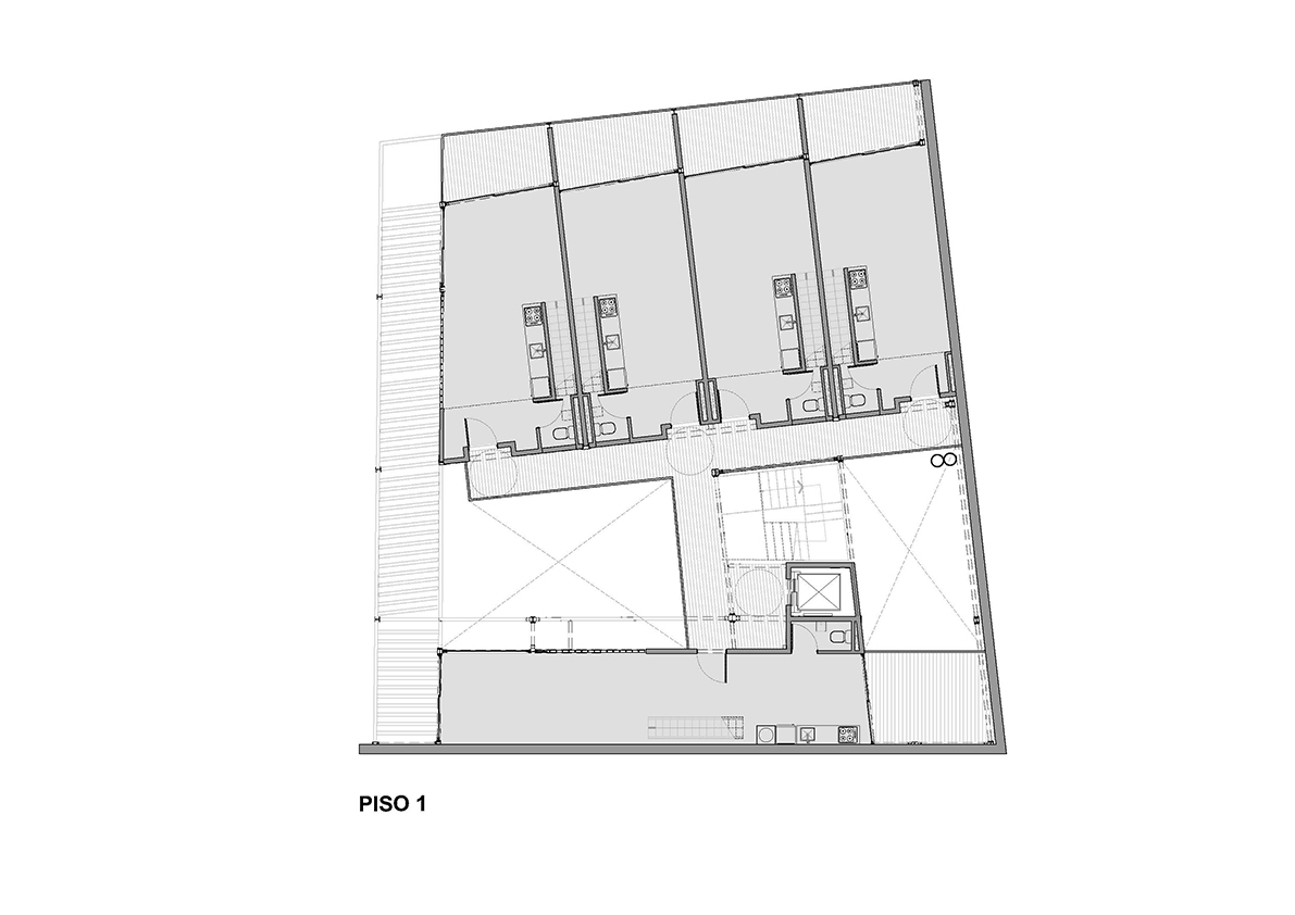 Cuando nos encargaron el proyecto de un edificio de viviendas, con parking y un local comercial para gastronomía en la esquina de las calles Darwin y Loyola, frente a una antigua curtiembre del siglo pasado que fue refuncionalizada como lofts hace varias décadas, por las normas de construcción vigentes al momento de recibir la encomienda el factor de edificabilidad era un menor al doble de la superficie del terreno, lo cual nos llevó a pensar en plantear dos volúmenes unidos por un puente de circulación separados por una calle o patio interior, partido tomado justamente de la curtiembre a la que hacía referencia, un edificio que conocemos bastante porque muchos colegas, diseñadores, fotógrafos y creativos tienen sus estudios allí.