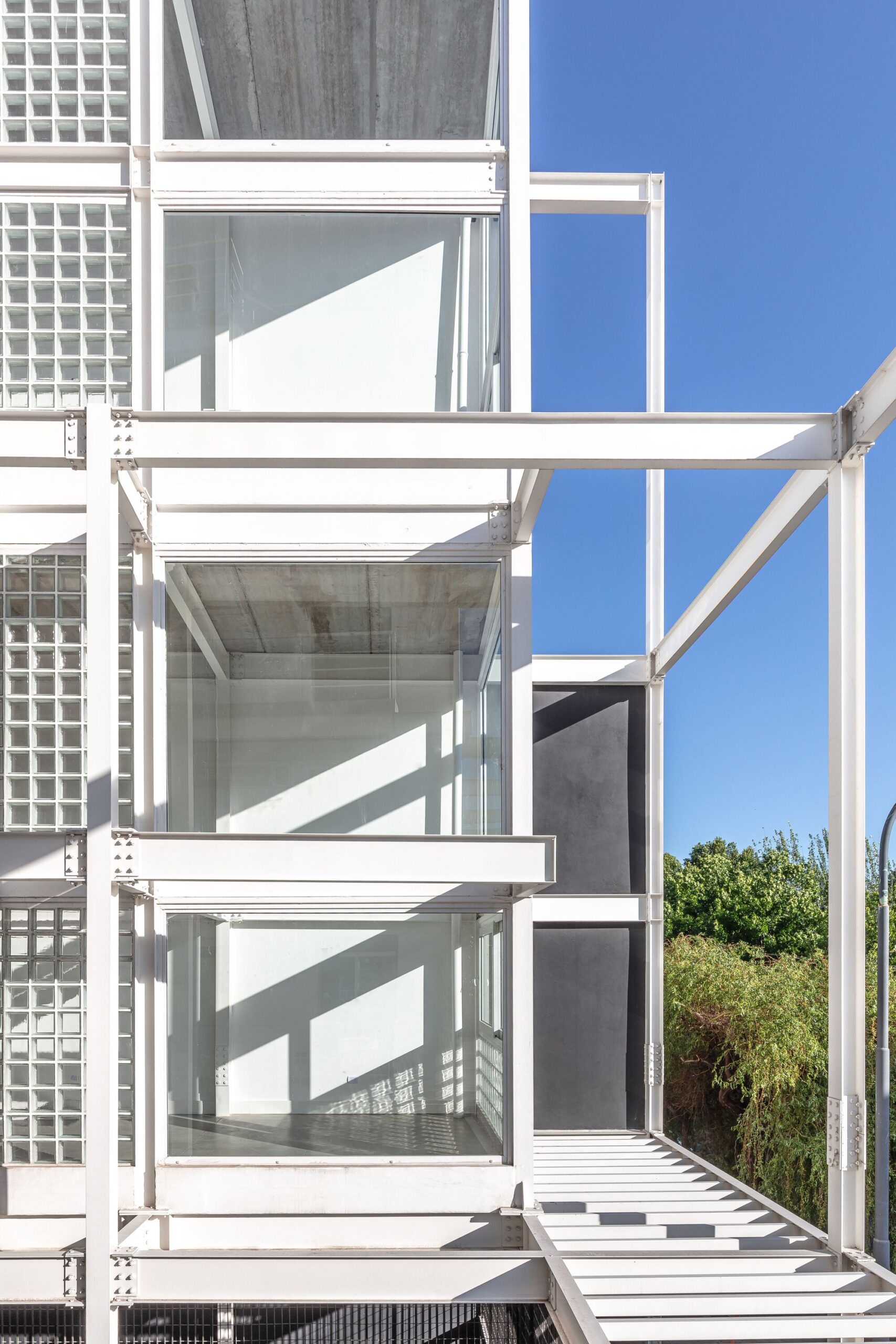 El nivel de precisión y detalle necesarios para fabricar un edificio en una planta industrial, traerlo desarmado y montarlo en cuatro etapas cada 45 días requiere de una coordinación proyectual, industrial, logística y material meticulosa y dedicada. Con anterioridad al montaje se realizó la excavación, submuración y fundación de las columnas a una profundidad de tres metros bajo cota de parcela para un subsuelo que contiene 11 cocheras accesibles por un monta vehículos hidráulico y salas técnicas para abastecimiento de agua presurizada, medidores eléctricos y tableros de servicios. La primera etapa de montaje incluyó la losa de viguetas premoldeadas sobre subsuelo, la segunda sobre planta baja, la tercera sobre primero y la cuarta sobre entrepisos entre las dobles alturas generadas por estos niveles. Para completar el armado de los entrepisos se realizó una capa de compresión de hormigón armado con malla electrosoldada de 8 mm y llameada mecánicamente con helicóptero, que conforma el pavimento definitivo de las unidades. Las paredes divisorias entre interiores y exteriores se elevaron a continuación con ladrillos de hormigón alveolar curado en autoclave terminados con revoque proyectable bicapa o tricapa.