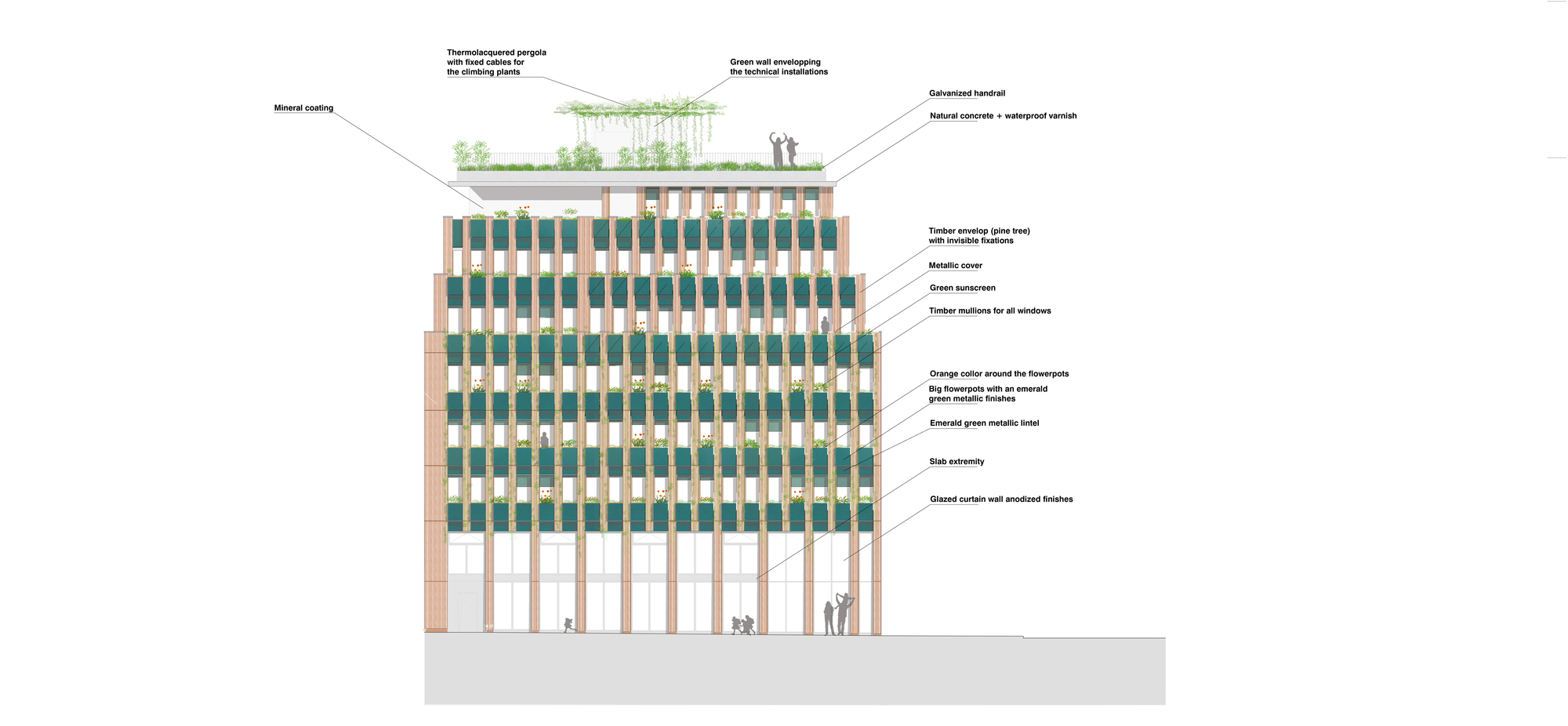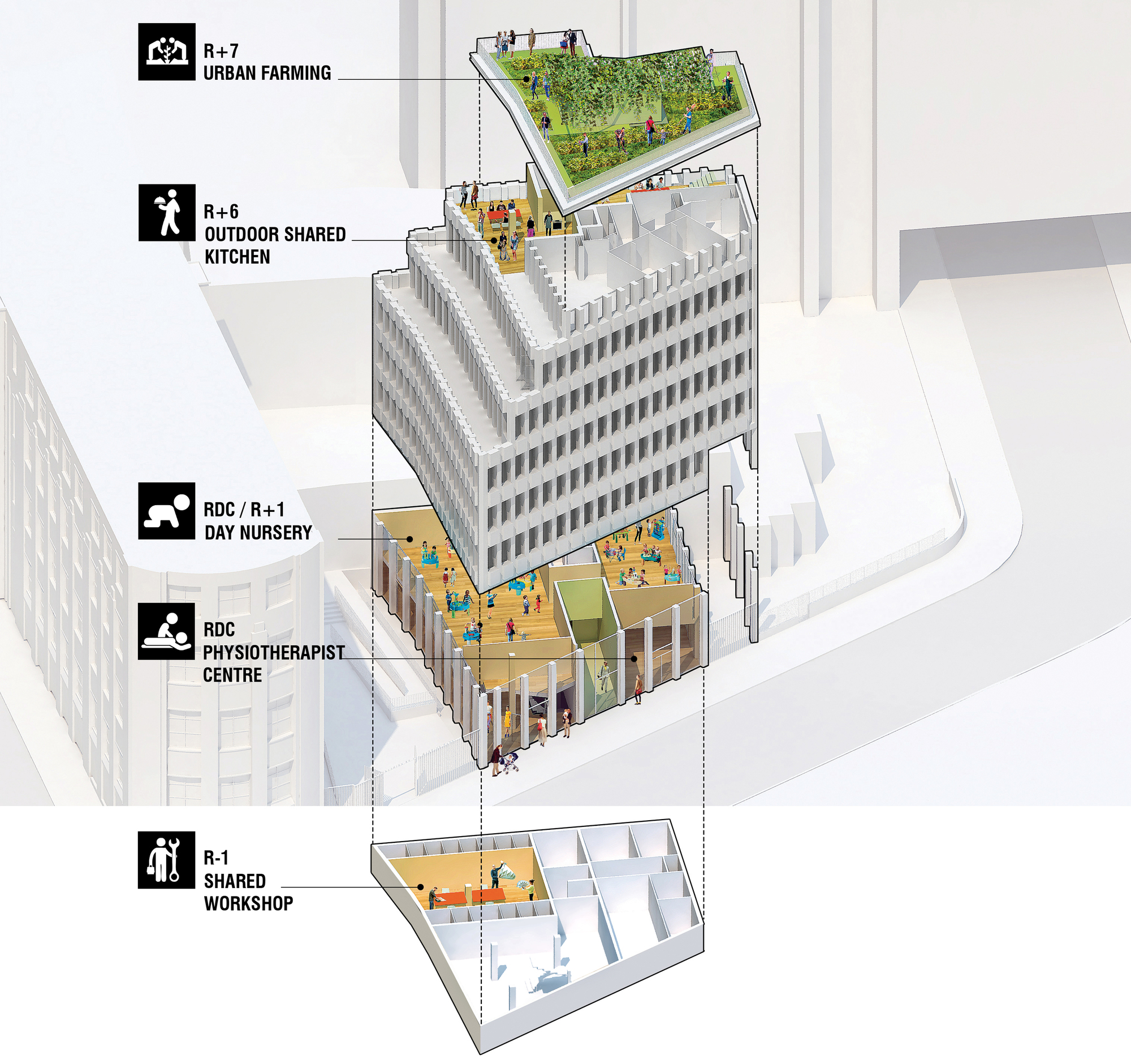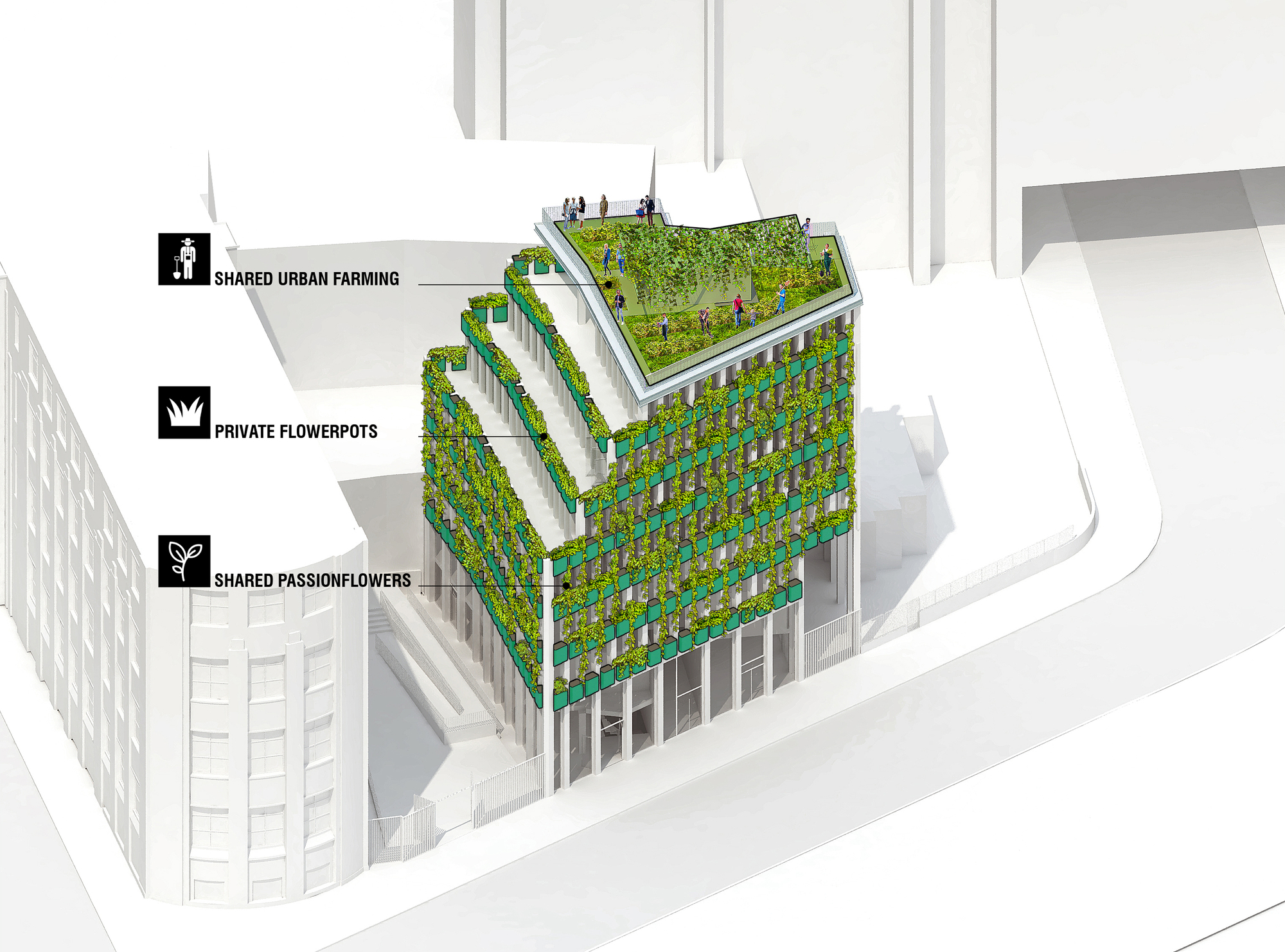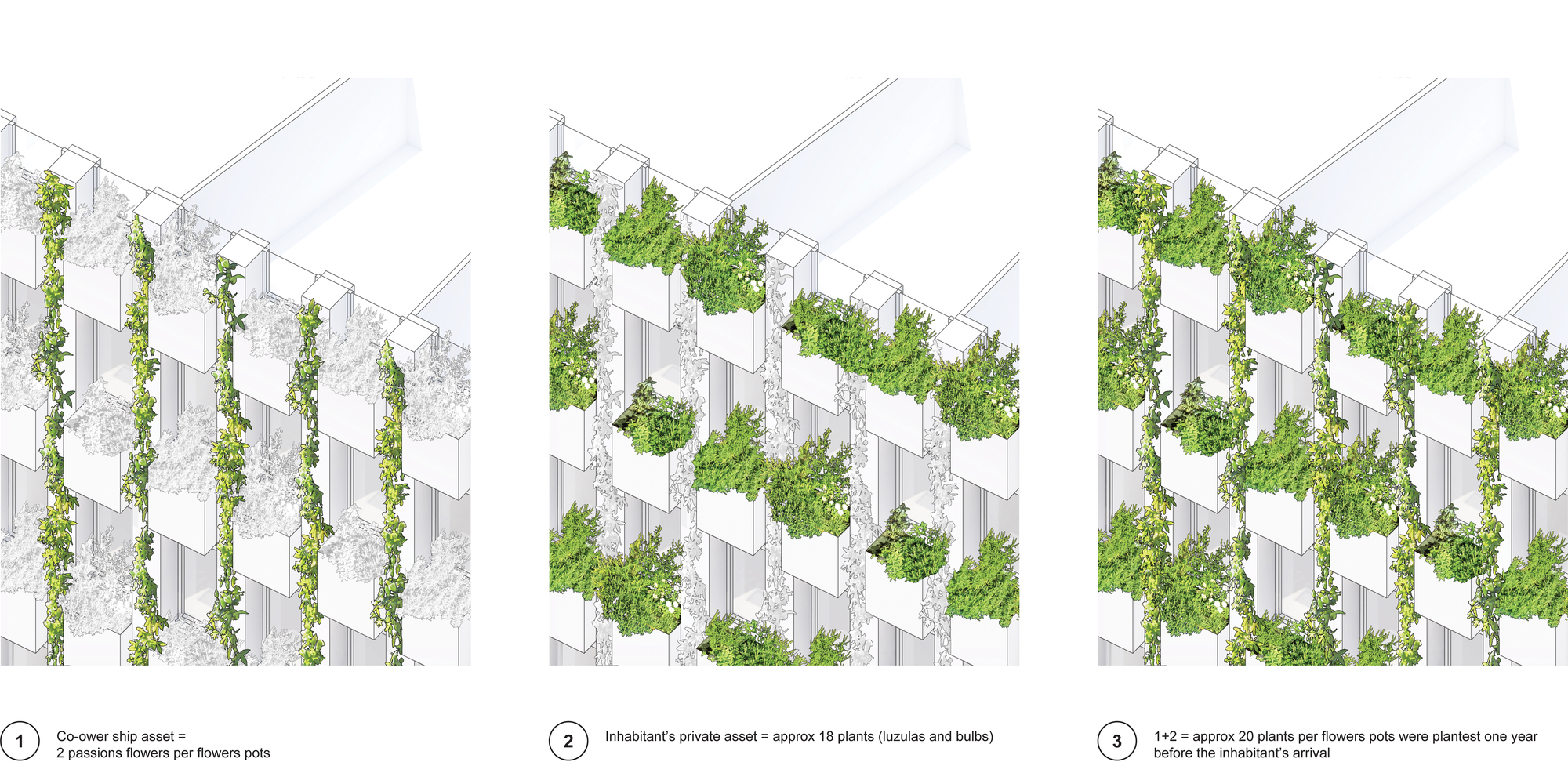 Edison Lite Apartment Building proposes a new housing model, based on three main principles: the creation of ‘made-to-measure’ housing units, whereby the future residents were able to participate in establishing the brief as well as the design of their home; the provision of 20% extra surface area, defined and shared with the residents: this provides access to space and facilities that would not otherwise be available to individual residents; to welcome residents into an existing landscape: largely planted during works, the architectural project includes 75 m3 of soil, divided between 290 planters and a large, 150 m2 allotment on the roof.