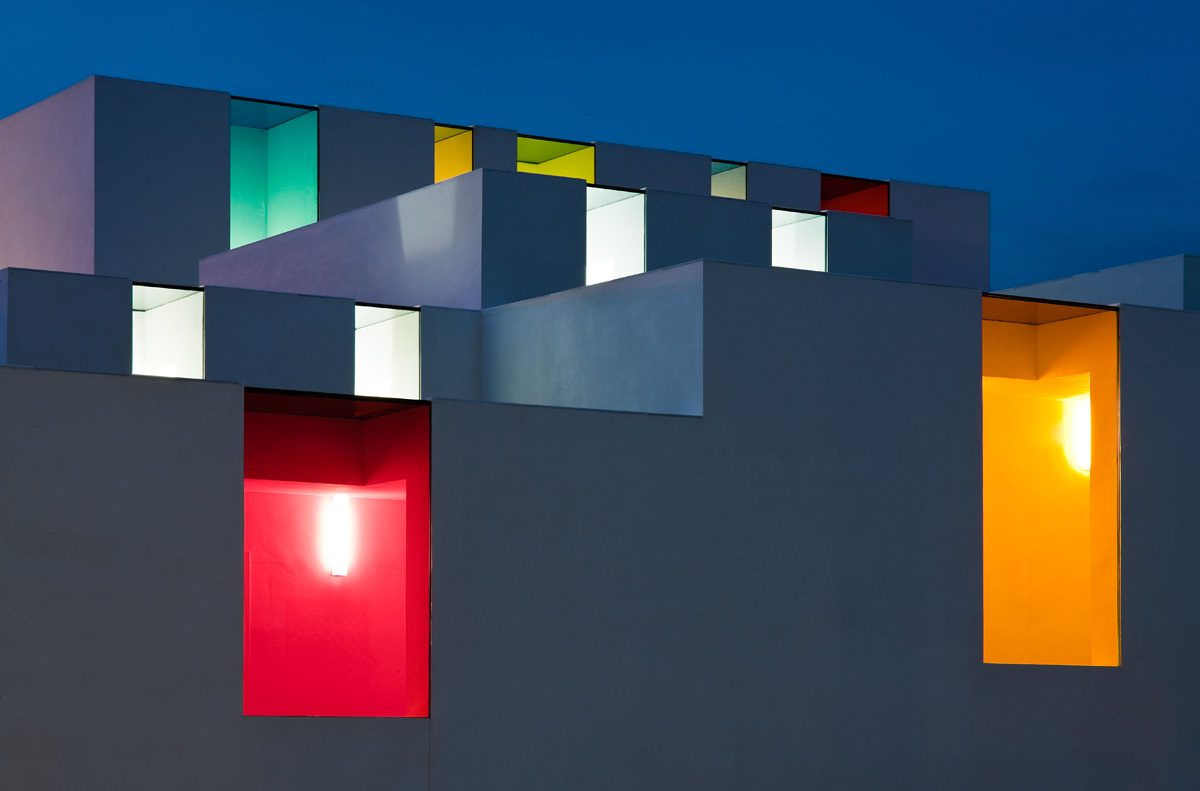 The project comes off as a white massive volume with variable-sized coloured strips as windows punctuated in the mass. The centre is oriented East-West with the courtyard and main entrance located North. The courtyard, which is the playground, serves as the pivotal space around which the centre revolves as it links the classrooms and the interior circulation with the garden.