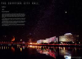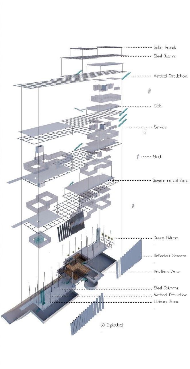 Concept Statement: The main idea of the project is to make a powerful visual message through project’s masses as the site contained a symbol of the symbols of corruption and injustice, these represented in national democratic party building. Using the same proportions of NDP building and make gap in the centre of the building and also uses shipped masses to deliver a message to all the world that Egyptians people can topple any kind of corruption and social injustice. The new Egyptian city hall connected to the Nile through reflected skins to reflect the physical context and make relation to Egyptian identity revival the use of the Nile through sport festivals and hiking trip. The building responds to the concept of a city hall as a public space accessible to all the citizens and tourists which aims to become a meeting point for the city .The building fits the scale of the city, creating an urban space both inside and out, connecting with the surrounding buildings through a logical and rational circulation.