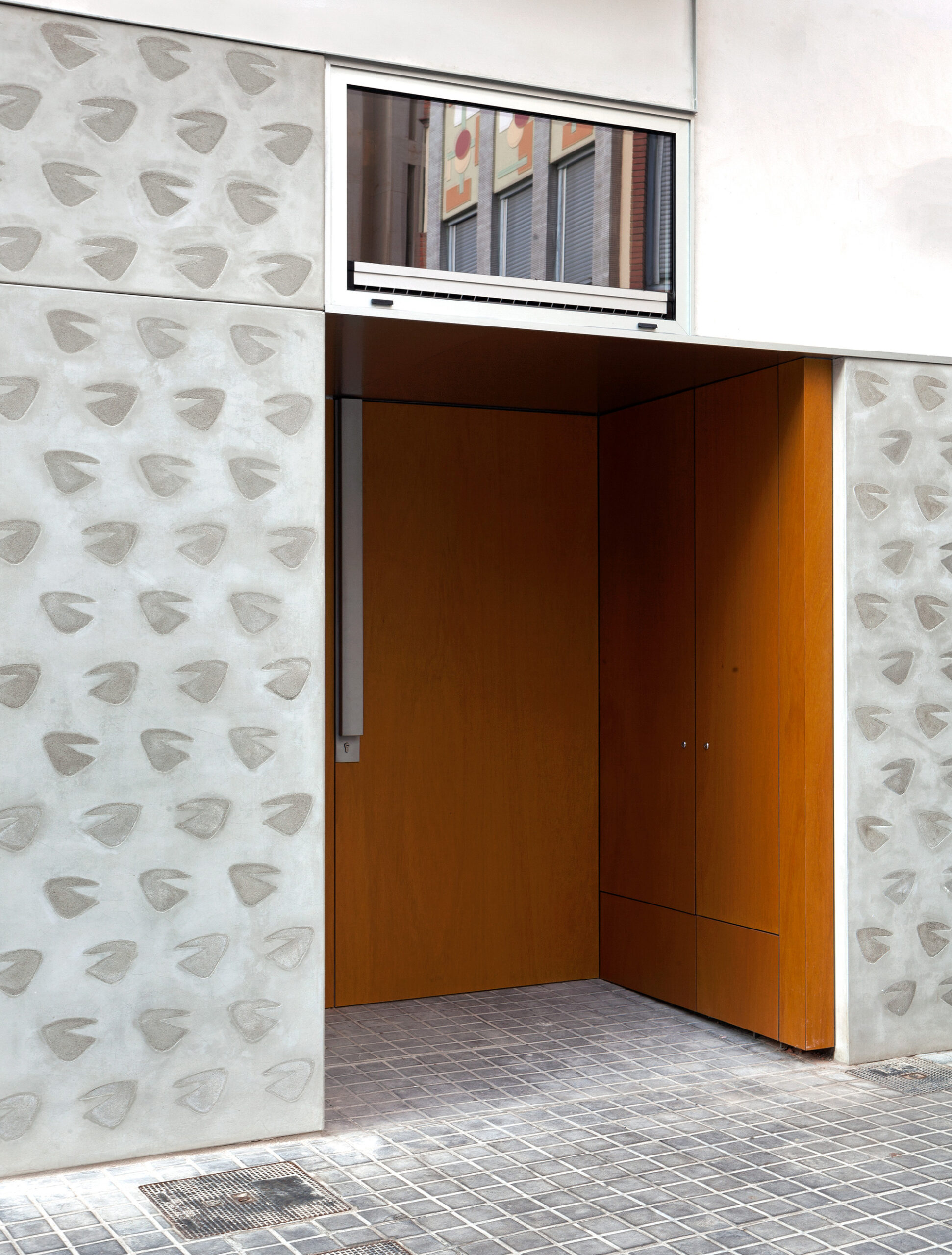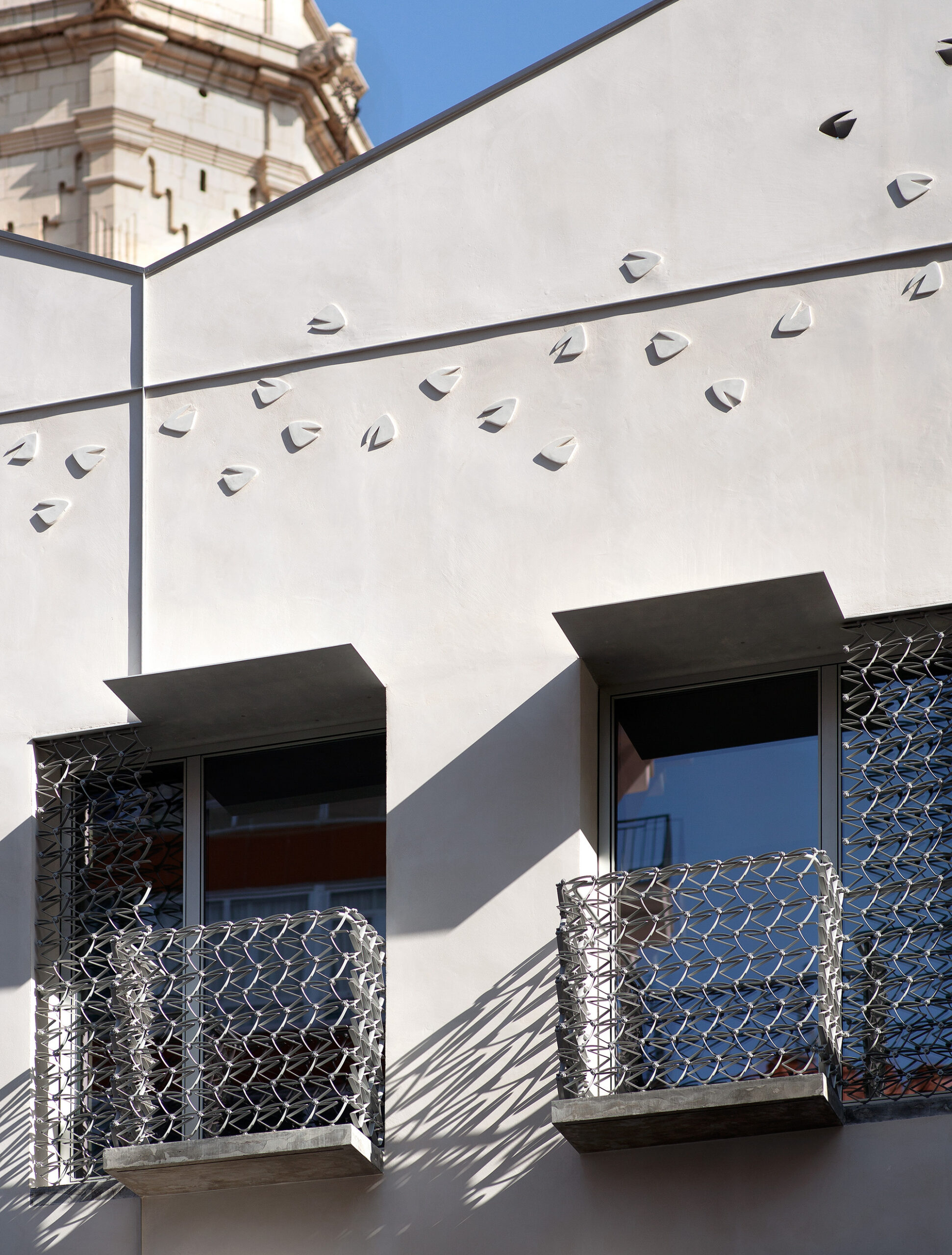 The ornamental motif in the facade, which is also inside the building, comes from the memory of this place, reminding the pelican exhibited in don Emilio old library. There is many people in Burriana that remember that name already. That was the main argument to be negociated with the institutions in order to be able to build a more opened facade than it looked in the first place due to the strong regulations. The finishing of the roof is a small gesture that tries to intensify the image of the bell tower and the Capilla de la Comunión, mitigating the vision of the dividing walls and involving the sky in the project.