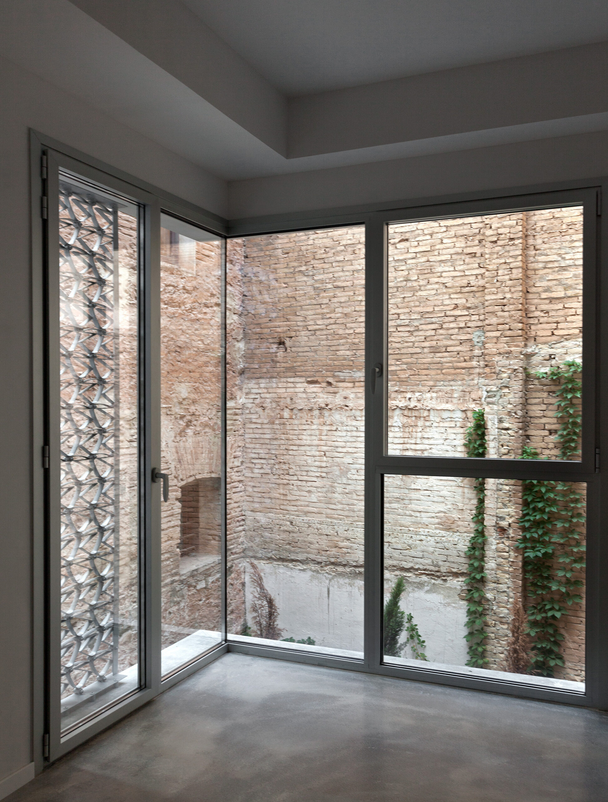 The proposal is to create a compact and deep building, with North-South orientation and crossed air ventilation, that has been organized like this: living rooms to South (to the plaza El Pla, having an unorthodox architecture and social representation) and bedrooms to North (to the garden) in the traditional way, which is so effective in terms of thermic issues. This generates a nice connection with the contiguous monuments.