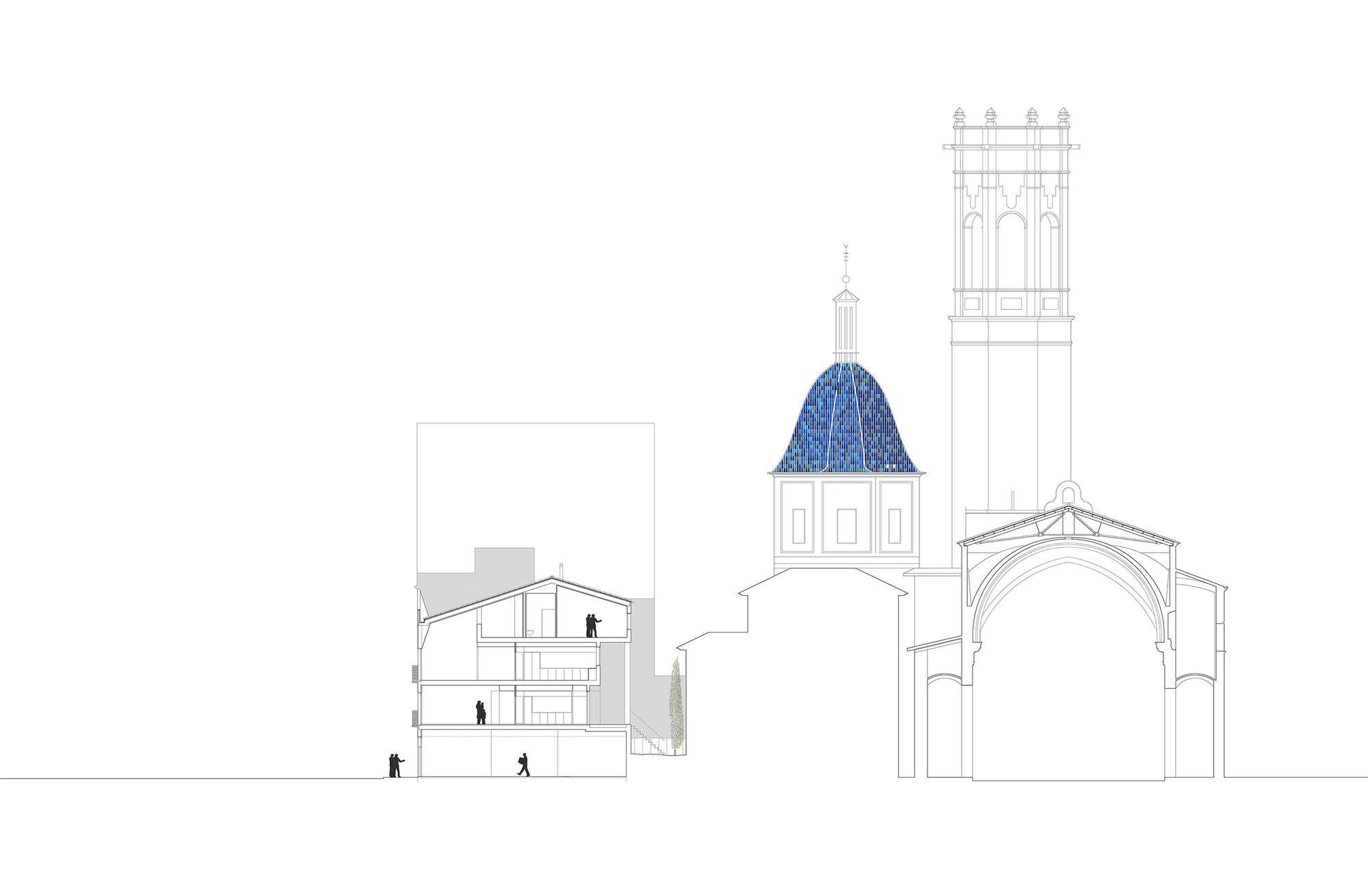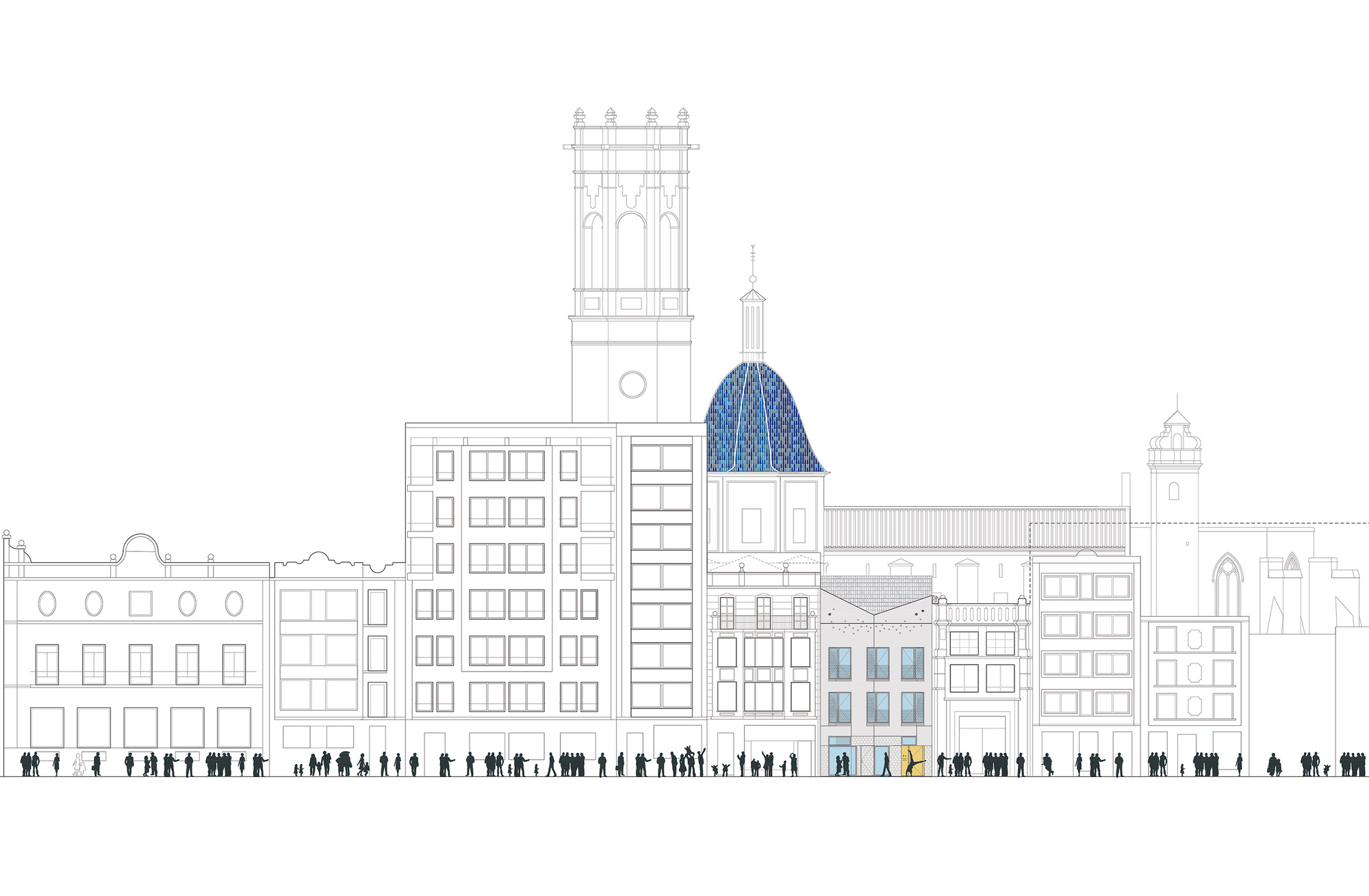 EL PLA Building, The bell tower “El templat” (S. XIV, rebuilt in the 40’s), the buttresses on the church of El Salvador (S. XIII, national artistic-historical monument) and the Capilla de la Comunión neoclassical dome (S. XVIII), constitute the key elements in the Historical Centre of Burriana, that was declared Cultural Interest Site in 2007. The main purpose of the building is to highlight this surroundings and emphasise its importance.