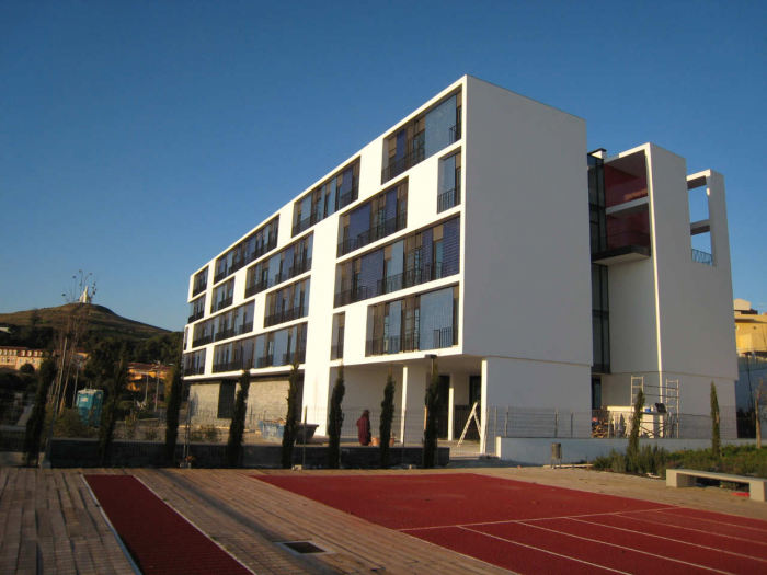 The building presents itself as a counterpoint to the architectural character of the existing housing neighborhood and therefore it tries to establish s strong sense of architectural identity for the existing communities, through its particular colored and textured materials. The 60 dwellings are set out in two rows facing east-west on four interconnected floors.