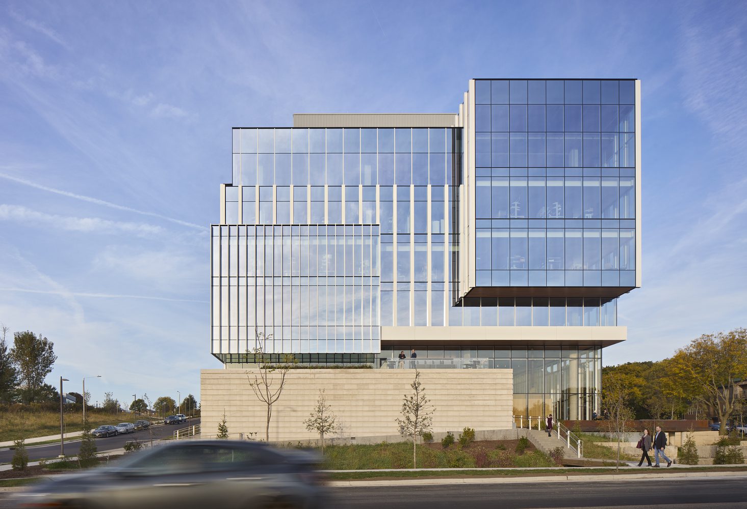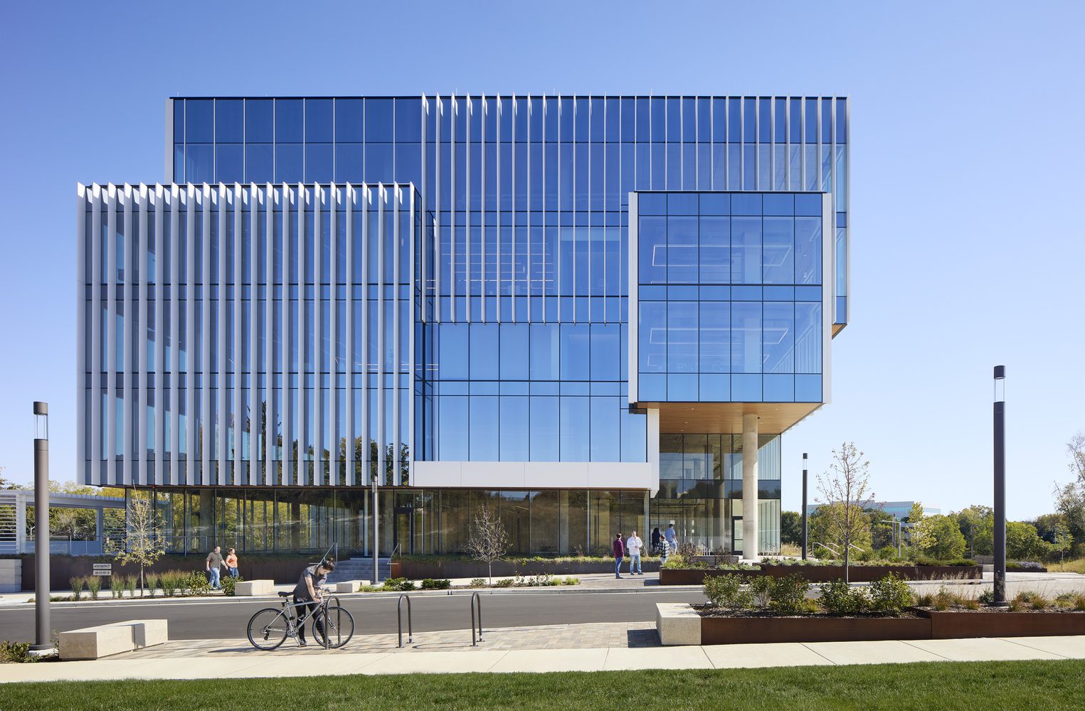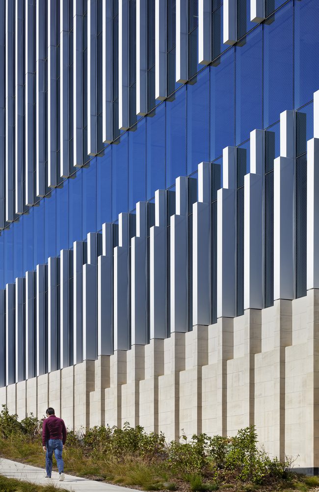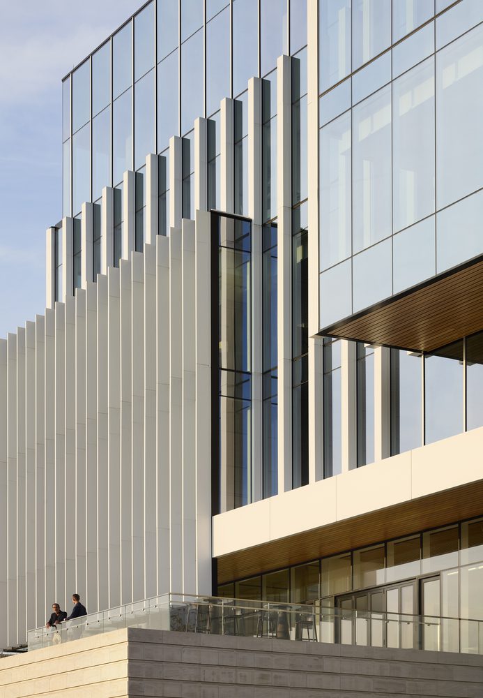 The multi-tenant building is framed by a soaring glass curtain wall expressing the transparency of scientific inquiry. A series of setbacks break up the massing and align the building’s scale with its surrounding location. Vertical fins along the exterior glass add detail, create a sense of rhythm, and help to provide shade and regulate temperatures inside.