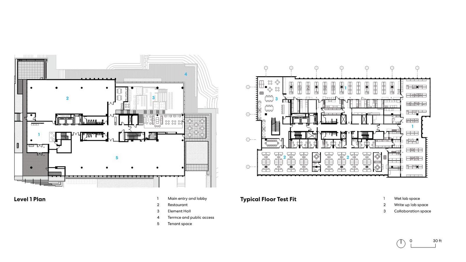 Element Lab is home to Invenra’s headquarters and R&D labs on the 3rd and 4th floors. Invenra develops novel therapies for cancer treatment, part of a growing portfolio across a variety of disease categories in the pursuit of treatment innovation. Their work demonstrates a drive for discovery, lending to an architectural project that is open in nature and creates space for creative collaboration. The project’s flexibility and multi-purpose modularity allow for the plan to seamlessly connect the labs and office space, creating spatial equity for all users as well as 360-degree views. The materiality of the project is calm and playful, highlighting a modern assembly of neutrals layered in with warm blues, wrapped in a glassy skin connecting to the activated landscape beyond.