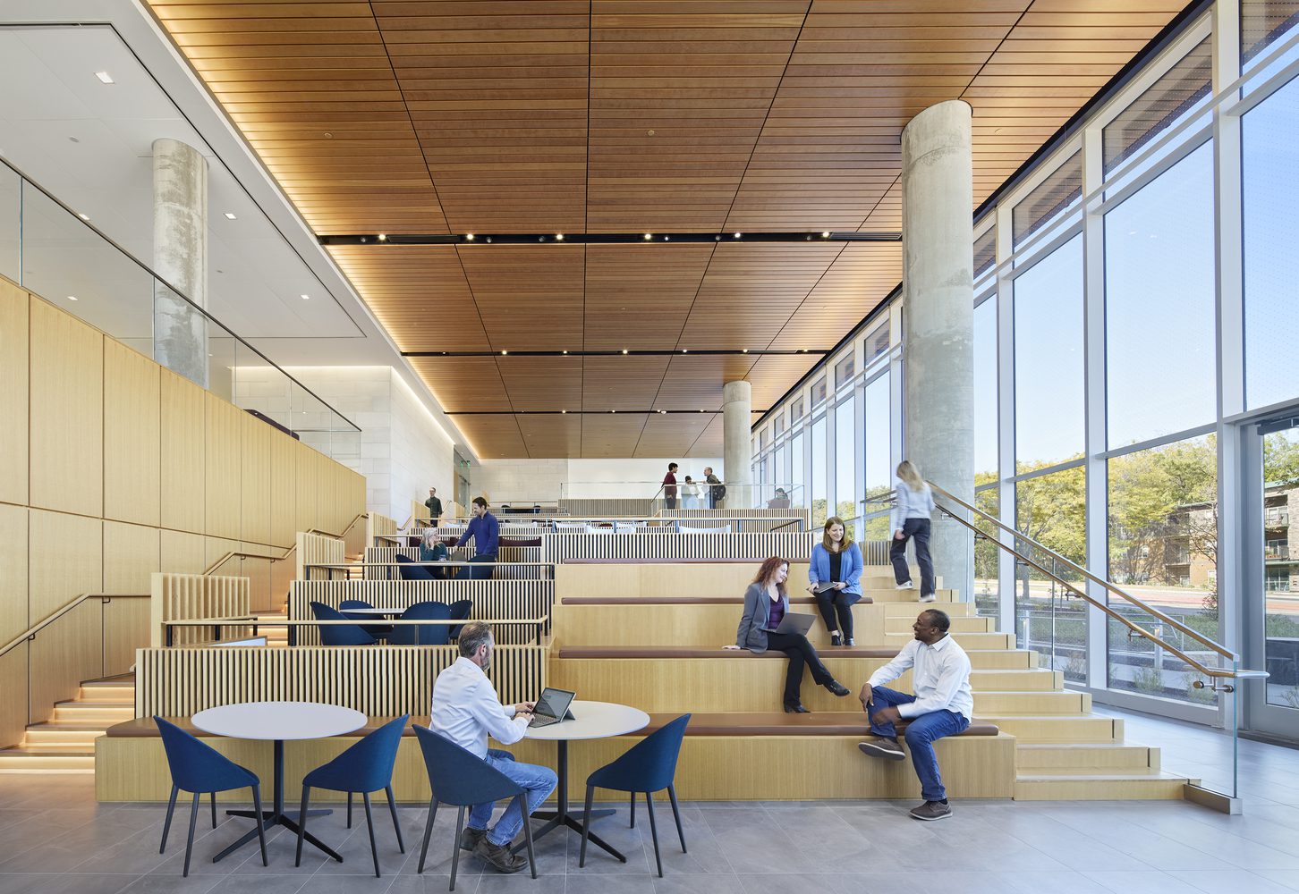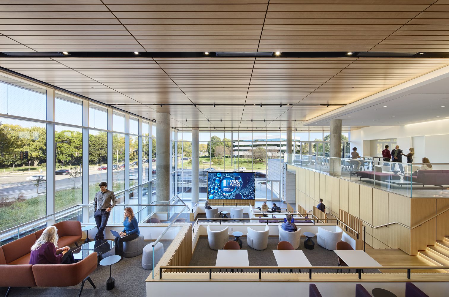 The ground floor provides amenity spaces for lifescience tenants and the community alike, with a variety of informal gathering areas and Element Hall, a community space with stadium seating, warm wood finishes, advanced AV, and meticulously engineered acoustics for formal presentations, casual meetings, movie nights, or hanging out. The dramatic space connects to large exterior patios and ponds with two-story glazing. Extending to the east, the terrace connects to the district streetscape, creating overlooks and views of the dynamic changing landscape. Materials, products, and design respond to Element Lab’s natural setting and the commitment to sustainable design.